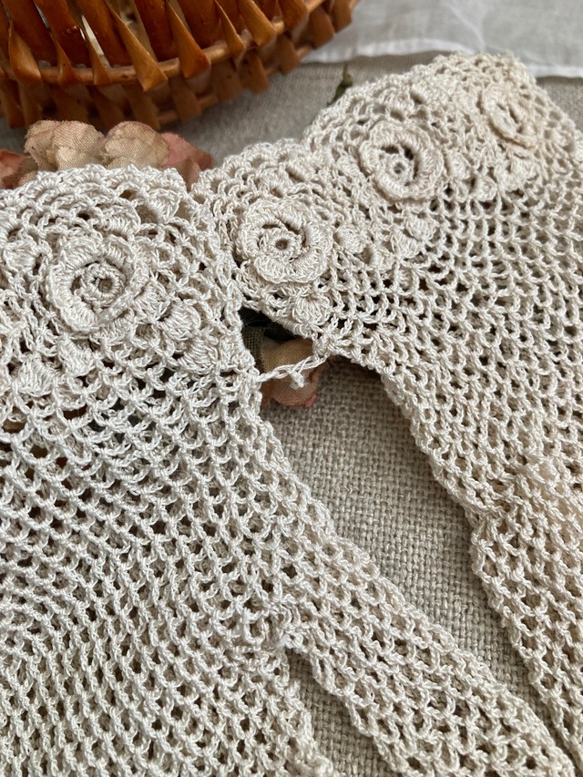 クロシェレース編みのグローブです。 素材はコットン、カラーはベージュ、おそらくデッドストックで状態はとてもよく、多少伸縮はしますがサイズは小さめです。 手首部分のお花モチーフも可愛いです。 実用可能ですが、古書やパニエと一緒に飾っても素敵です。 ※写真はイメージで、グローブのみの販売です。 【買い付地】フランス 【推定年代】1930's 【サイズ約】平置きで中指先から全長17cm、