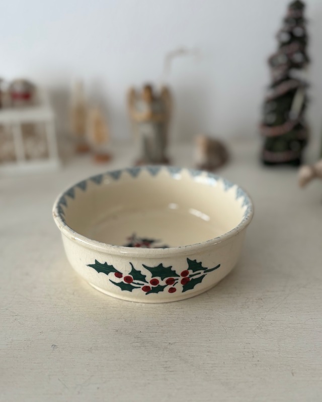 クリスマスのヒイラギで彩られた、陶器製のディネットボウルです。 表面には自然に入った貫入が広がっていて、素朴な温かみが感じられます。 製造時の凹凸、ヘアライン(写真9・10枚目)が見られますが、大きな破損に繋がるようなダメージでは無く、ディスプレイとしてはとても良い雰囲気です。 クリスマスの飾りや、ディネットコレクションとしてお楽しみいただけます。 【買い付地】フランス 【推定年代】1950前後 【サイズ約】直径11cm/ H4cm