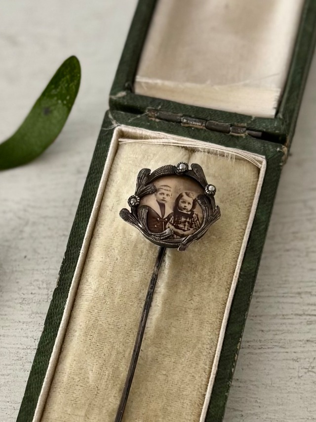 小さなセピア色の写真を、ヤドリギを思わせるアール・ヌーヴォーの植物レリーフがそっと包み込んだアンティークのハットピン。ところどころに添えられた小さなイミテーションパールが、冬の朝に光る露のようにきらり輝きます。 写っているのは、幼い男の子と女の子。 遠い時代に撮られた一瞬が、そのまま小さな宝物として留められた、珍しいポートレート付きのハットピンです。 装飾ハットピンでありながら、まるでミニチュアの写真フレーム(portrait miniature)ような愛らしさで、実物を手にした時の、小さな感動や温もりは、写真越しでは伝えきれないほどです。 古いもので変色や錆がありますが、飾っても、またコレクションとしても素敵なアンティークです。 可愛いポストカード付き ※ケースは付属しません。 【買い付地】フランス 【推定年代】1900前後 【サイズ約】全長6.3cm
