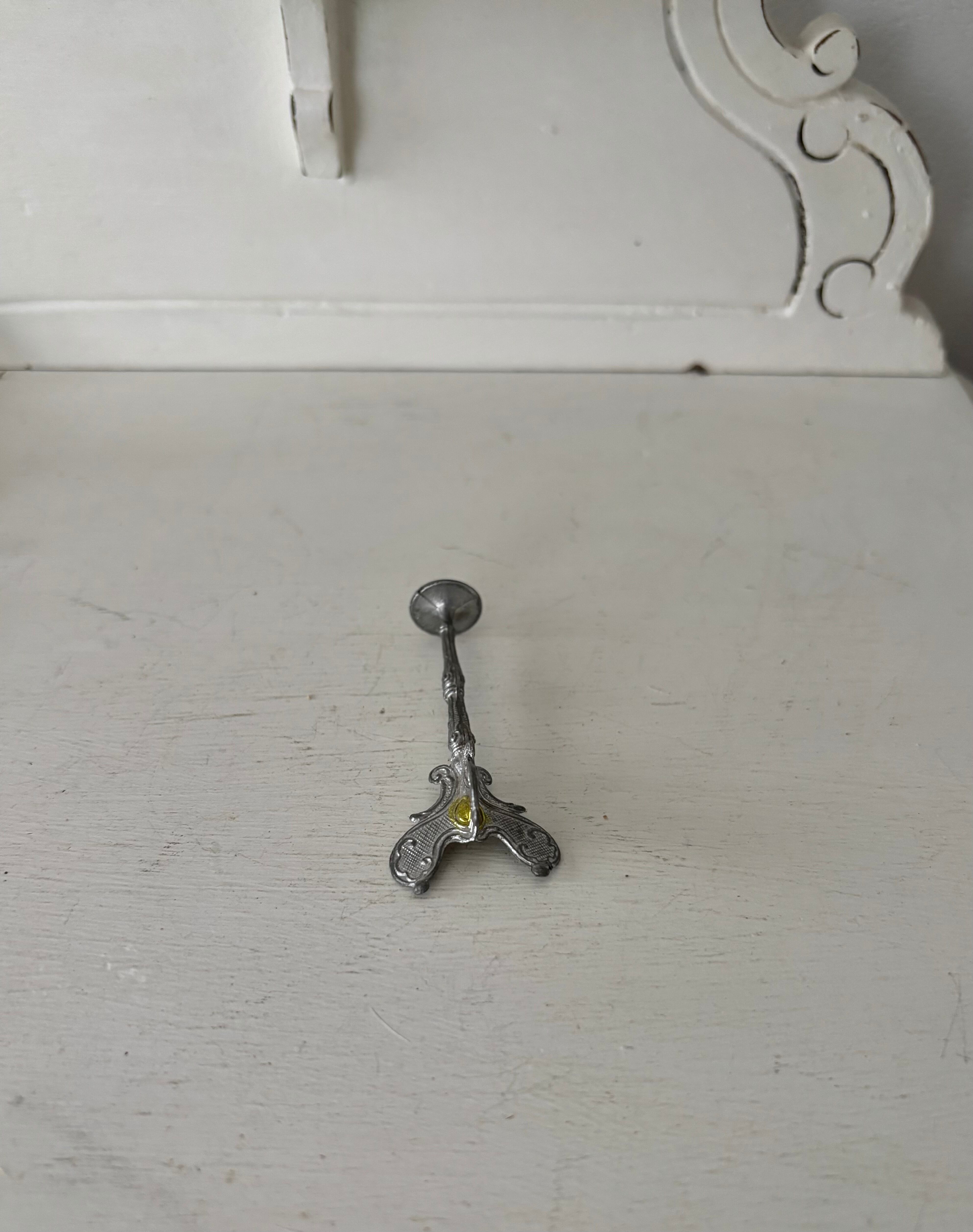 古い小さなキャンドルスタンドは教会の燈台を模したドールハウス用のミニチュアでおそらくドイツ製、ソフトメタルのため歪みはありますが細かなディテールが美しいです。