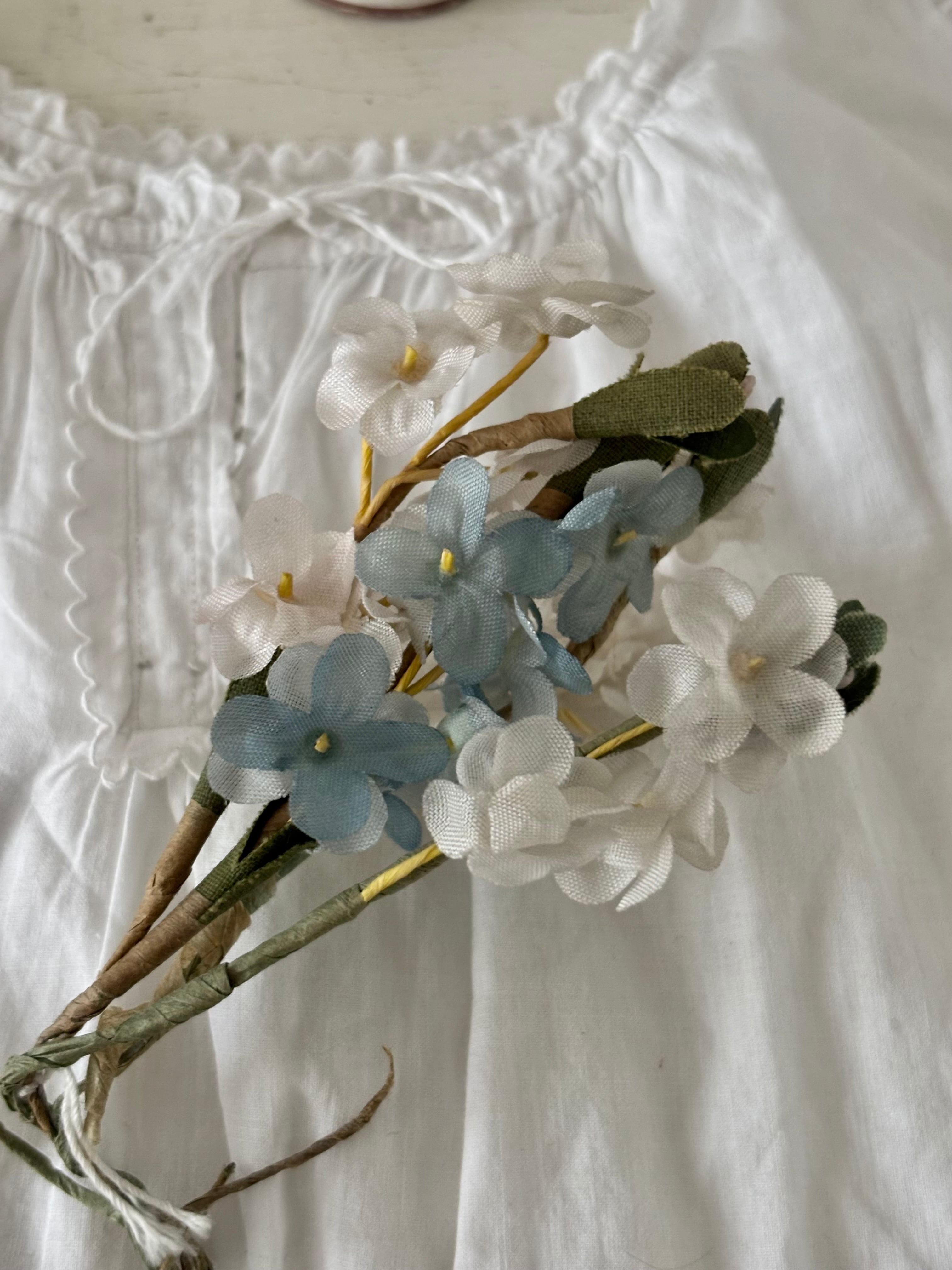 ピンク、水色と白3色の花芯も可愛いお花のブーケ、繊細なイメージの布花は撮影小物としてとてもおすすめです。古いもので茎の葉部分にダメージがありますが古いものとしては全体的に良い状態です。