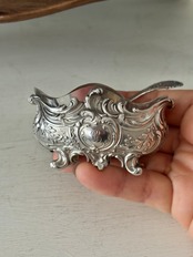 小さなサイズに美しいモノグラムやロカイユ装飾などが施された姿に惹かれ買い付けました。ガラスの容器とスプーン付きです。
