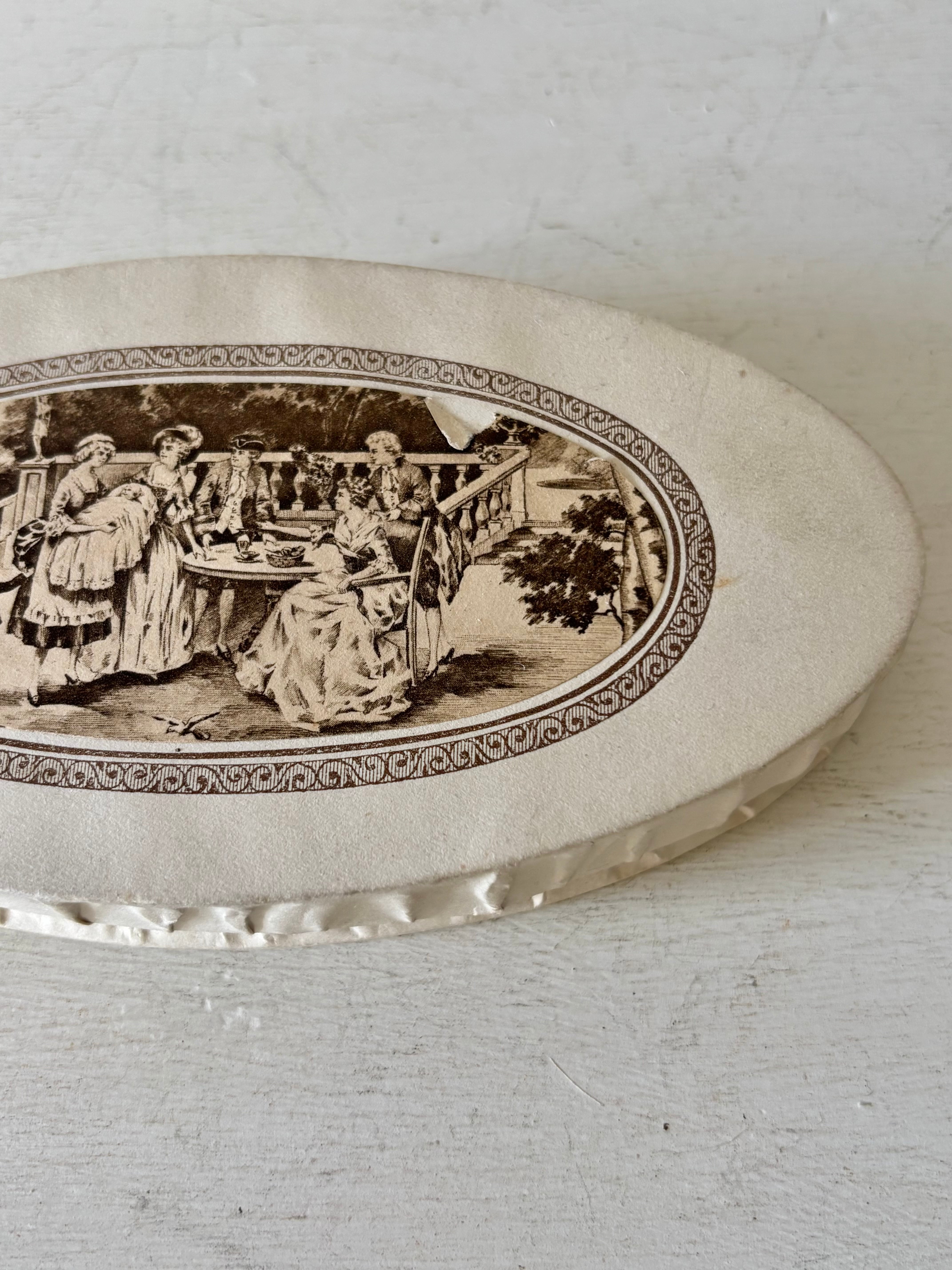 お祝いの砂糖菓子が入っていたドラジェボックス、18世紀風の衣装を纏った貴婦人達が庭園でお茶を楽しむ傍らには可愛い赤ちゃんと小さな子供。ロココ趣味を感じさせる素敵な絵柄です。