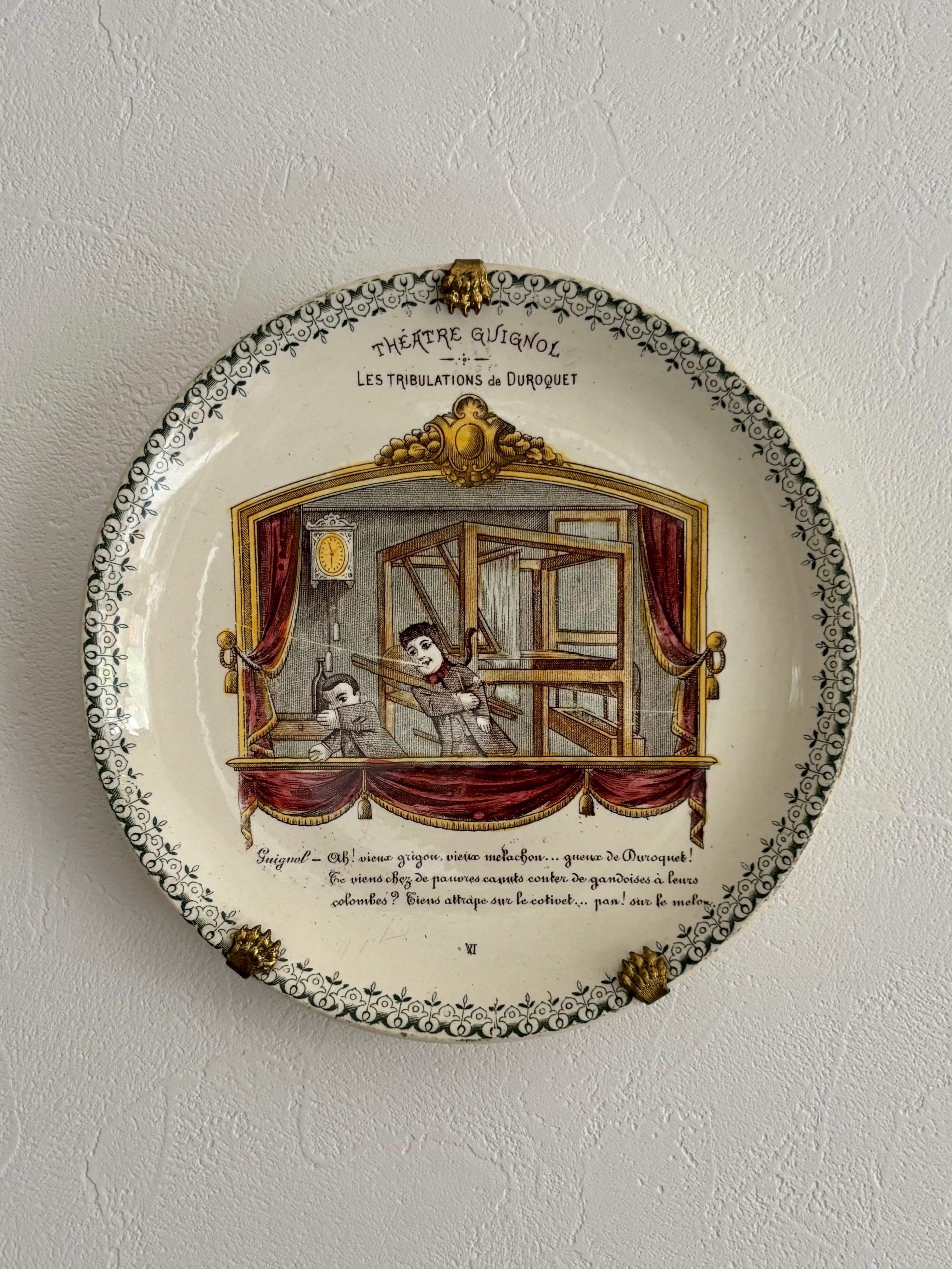 中央に人形劇のワンシーンと上部に題名「LES TRIBULATION de DUROQUET(デュロケの災難)」、縁は小花模様。転写に手彩色を重ねた温かな風合いで、当時流行した assiettes parlantes(語る皿)らしいユーモア溢れる表情です。