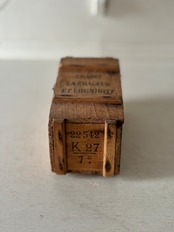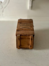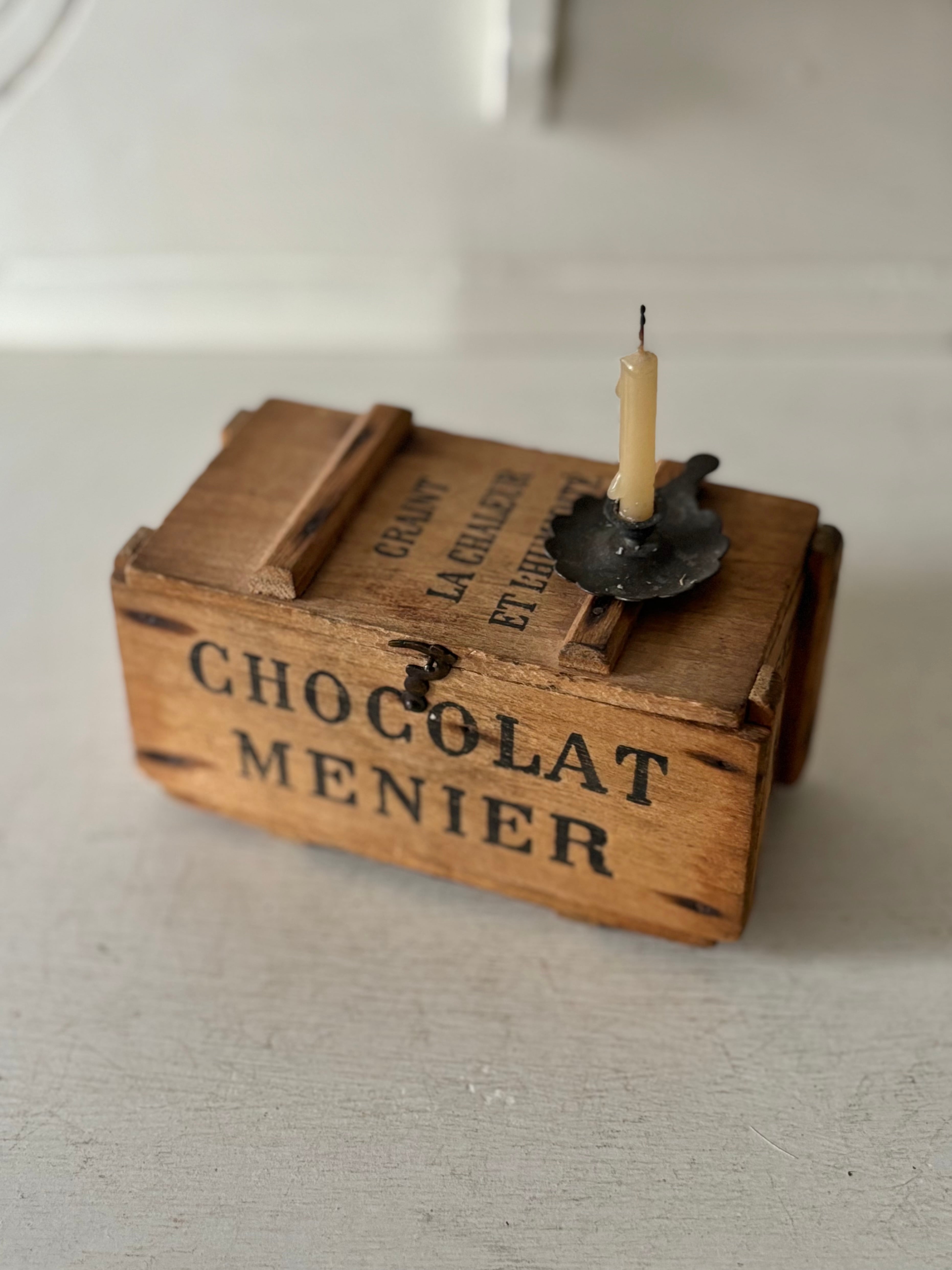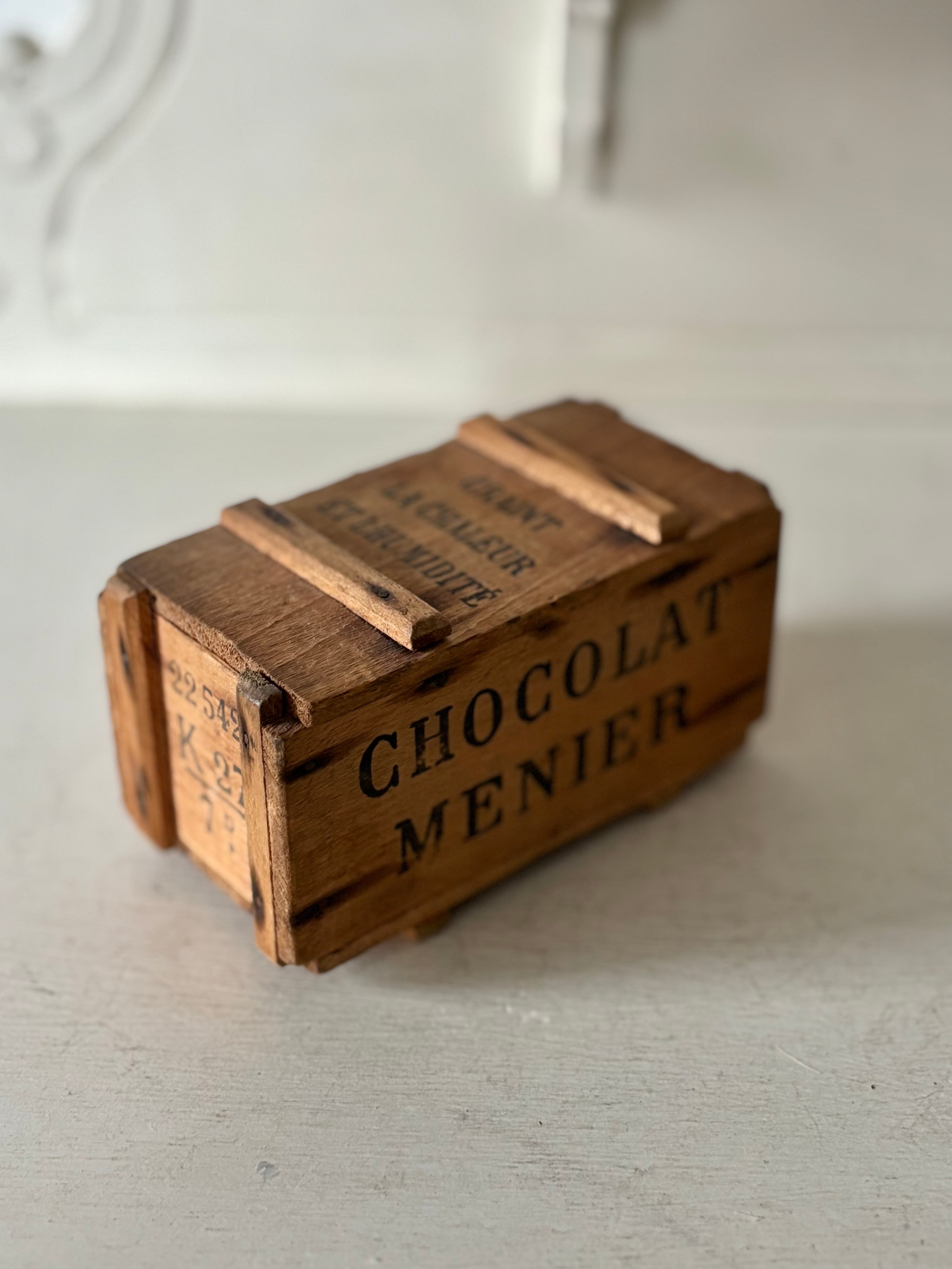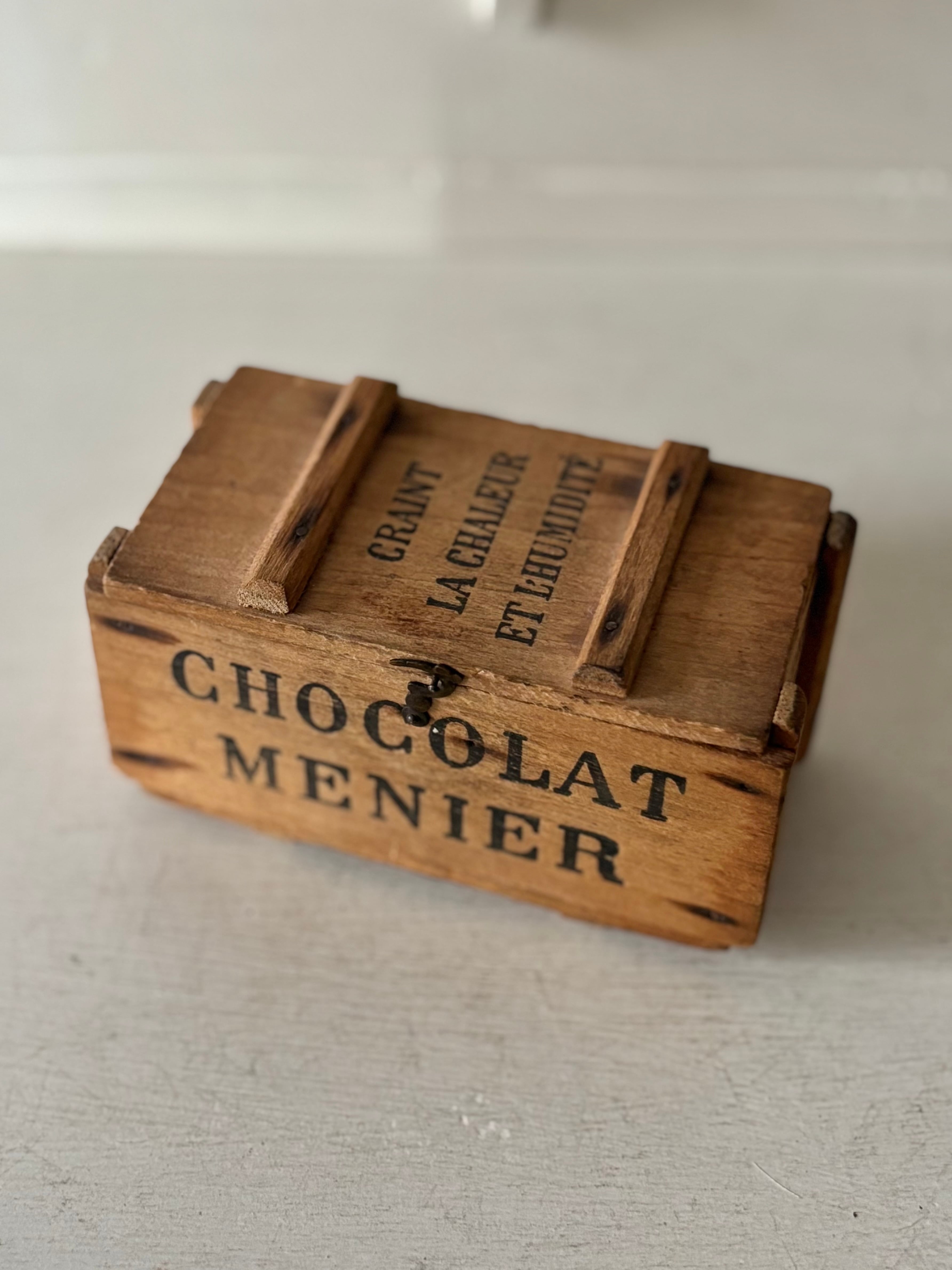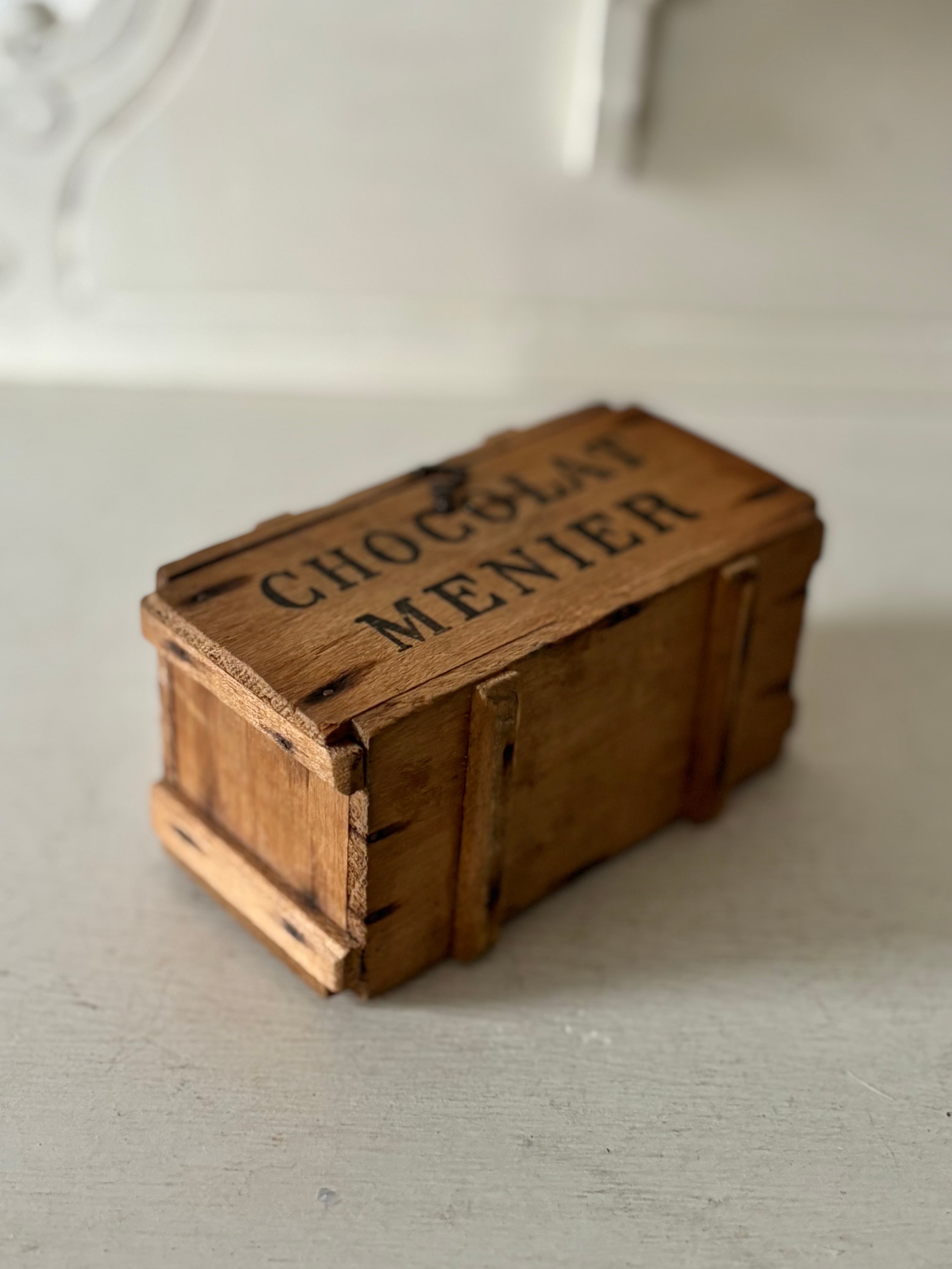 1816年創業『CHOCOLAT MENIER』のミニチュア木箱です。こちらは蝶番も残っていて4面のステンシル文字もはっきりとしています。