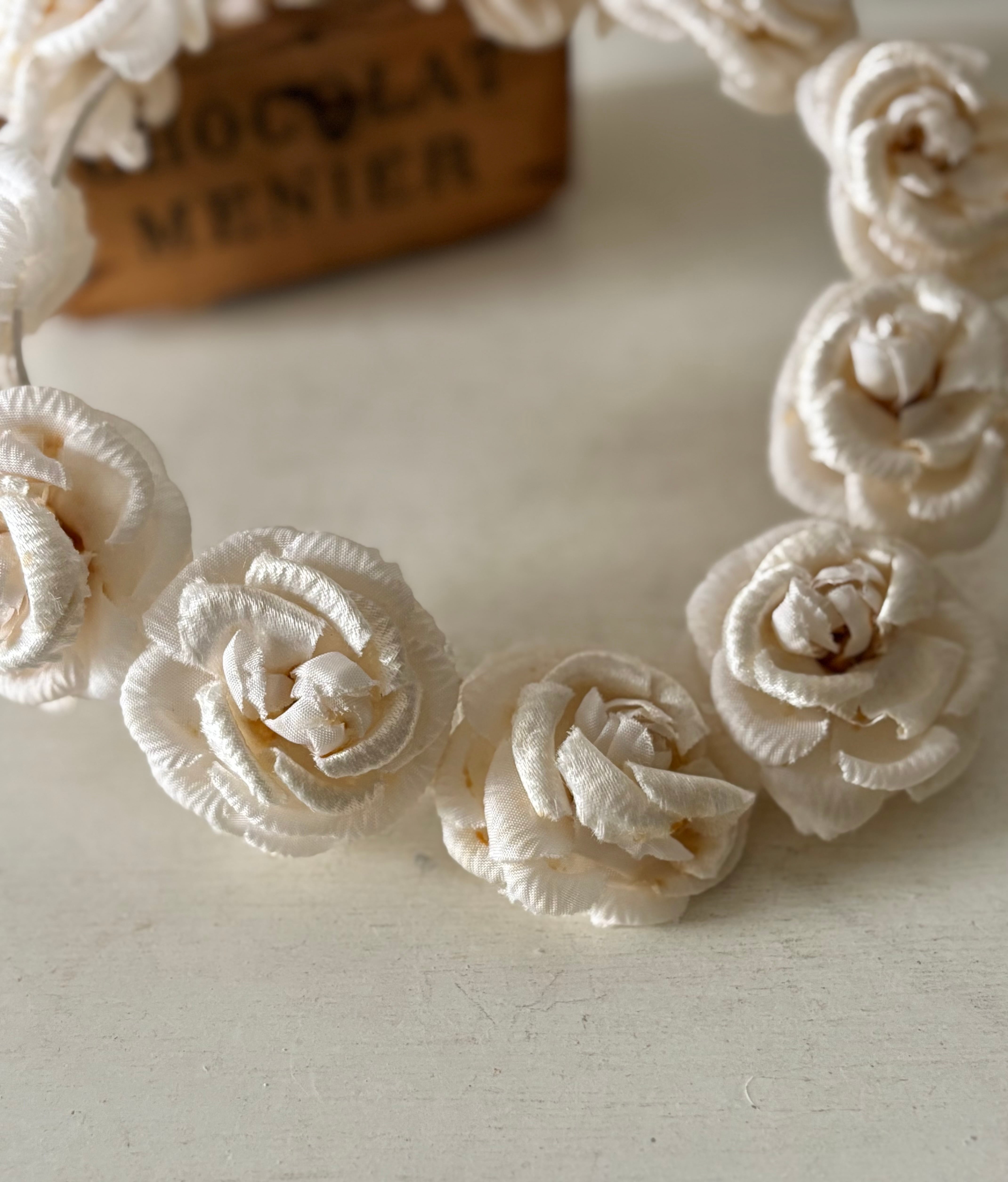少しボリュームのある優しい色合いのフラワークラウン、おそらくハリのあるレーヨンサテンと、所々に光沢のある起毛した柔らかい布の異素材を組み合わせて立体感を出した当時の手仕事が伺える丁寧な作りです。