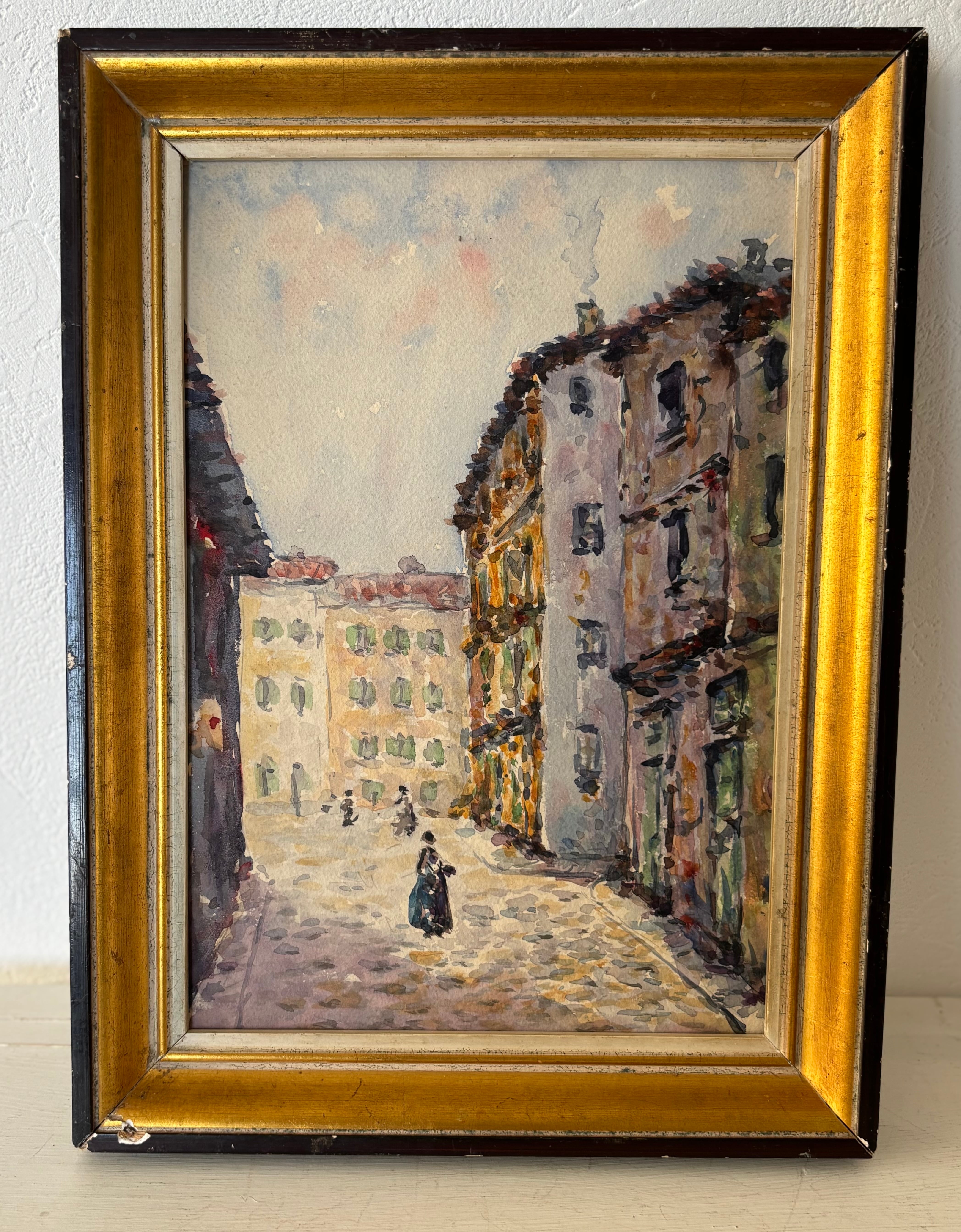 柔らかな光が降りそそぐ、古い街角の風景を描いたフランス1930〜1950年代頃の水彩画。