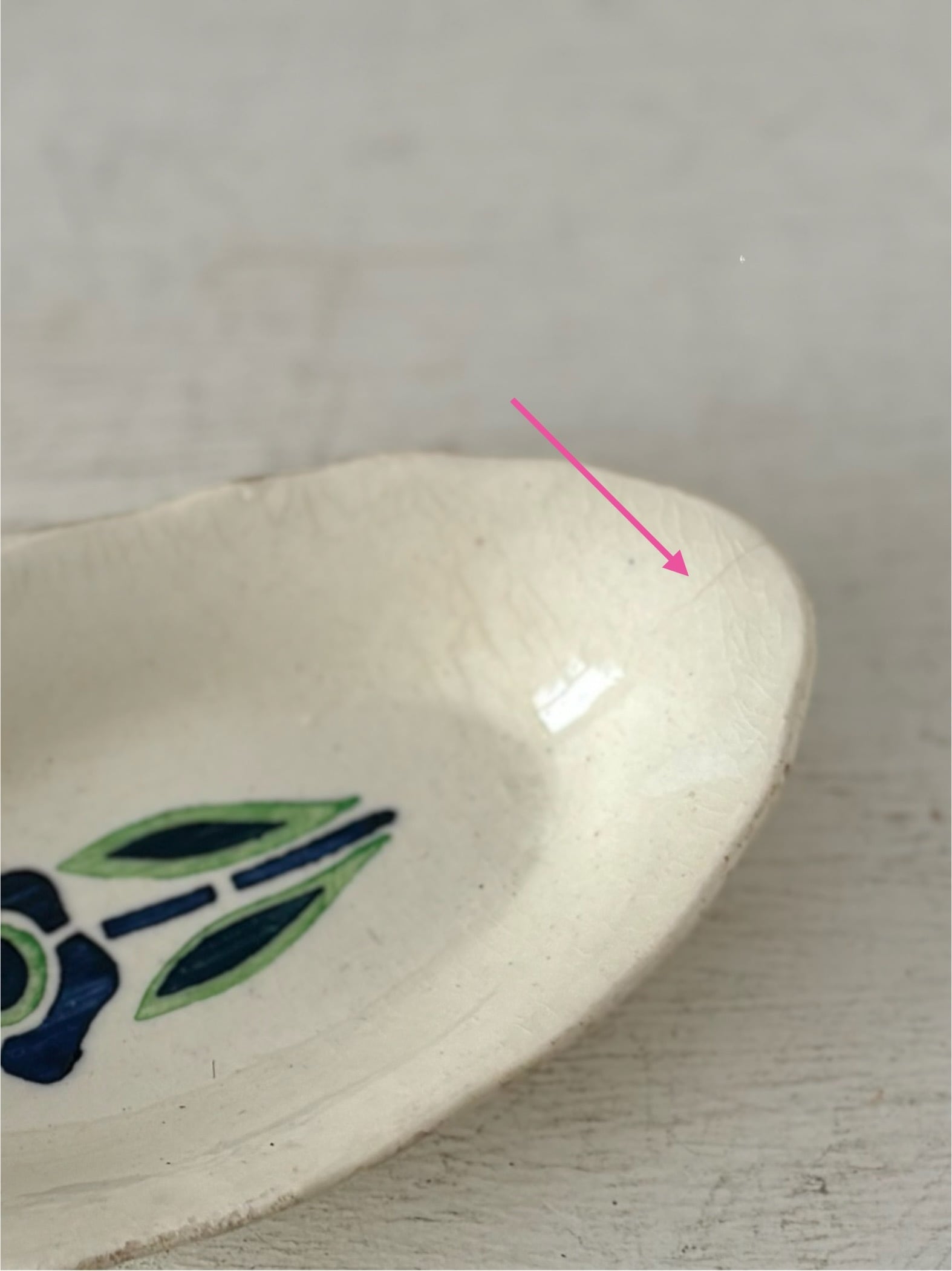 ふちには薄いヘアライン(写真11〜13)や裏側にチップが見られますが、当時の子ども用陶器らしいやわらかな風合いをそのまま残しています。