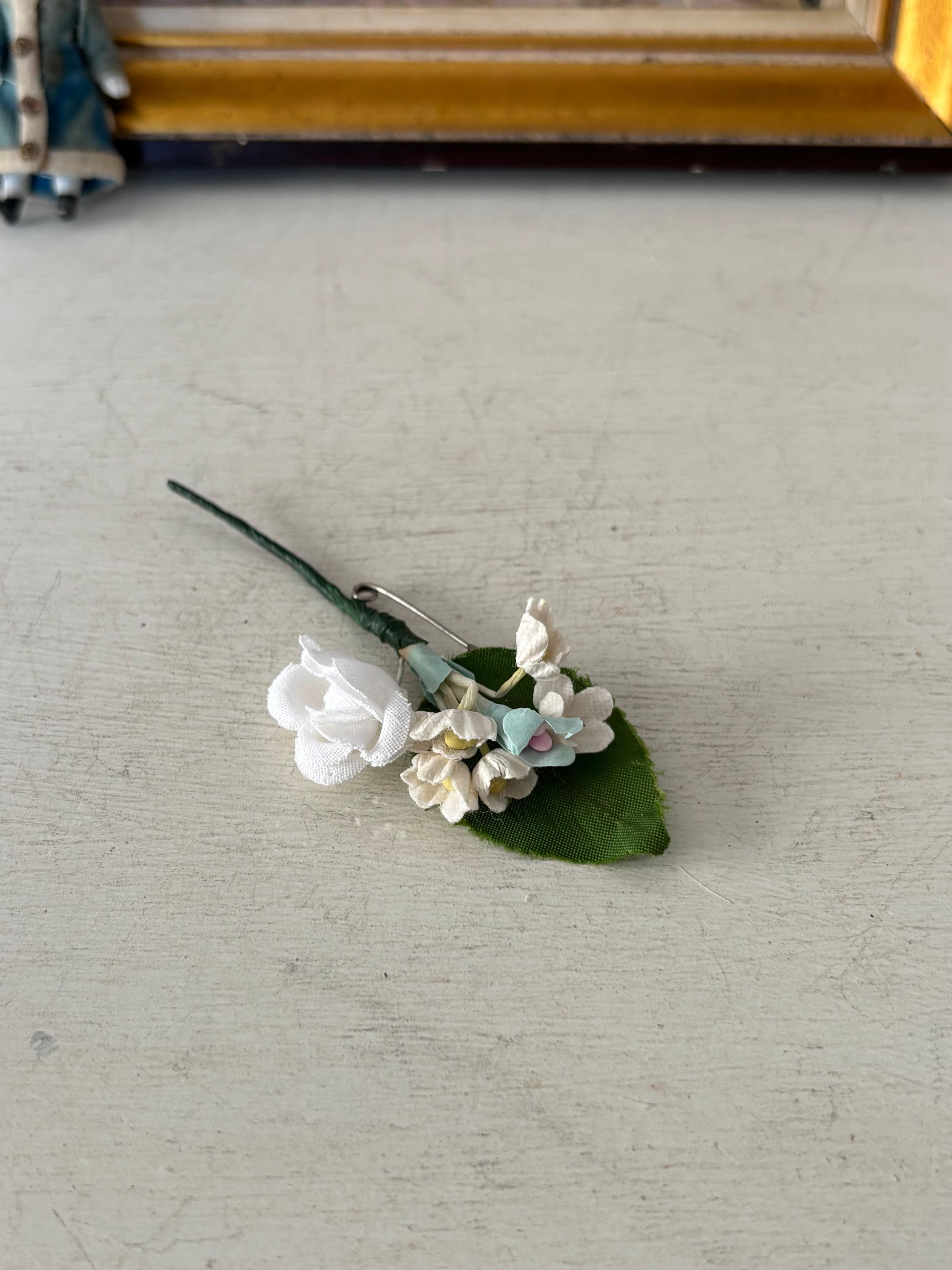 フランス、1930〜1950年代頃の布花ミニブーケ。白い小花に淡いブルーが添えられた、やさしい色合わせの古い布花です。