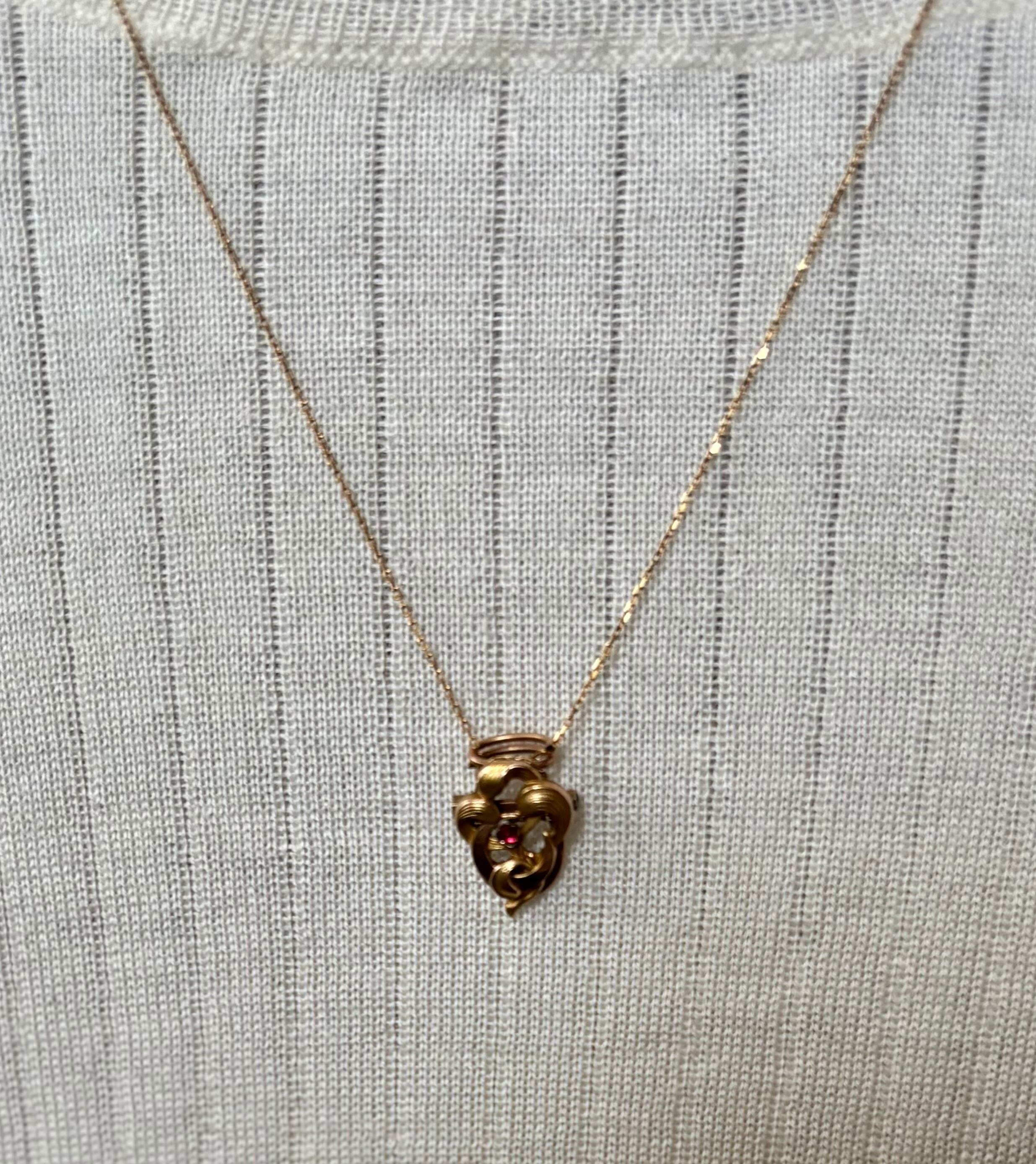 中央にはルビーを思わせるピンキッシュレッドのガラスがきらりと光り、胸元にそっと華やぎを添えてくれます。