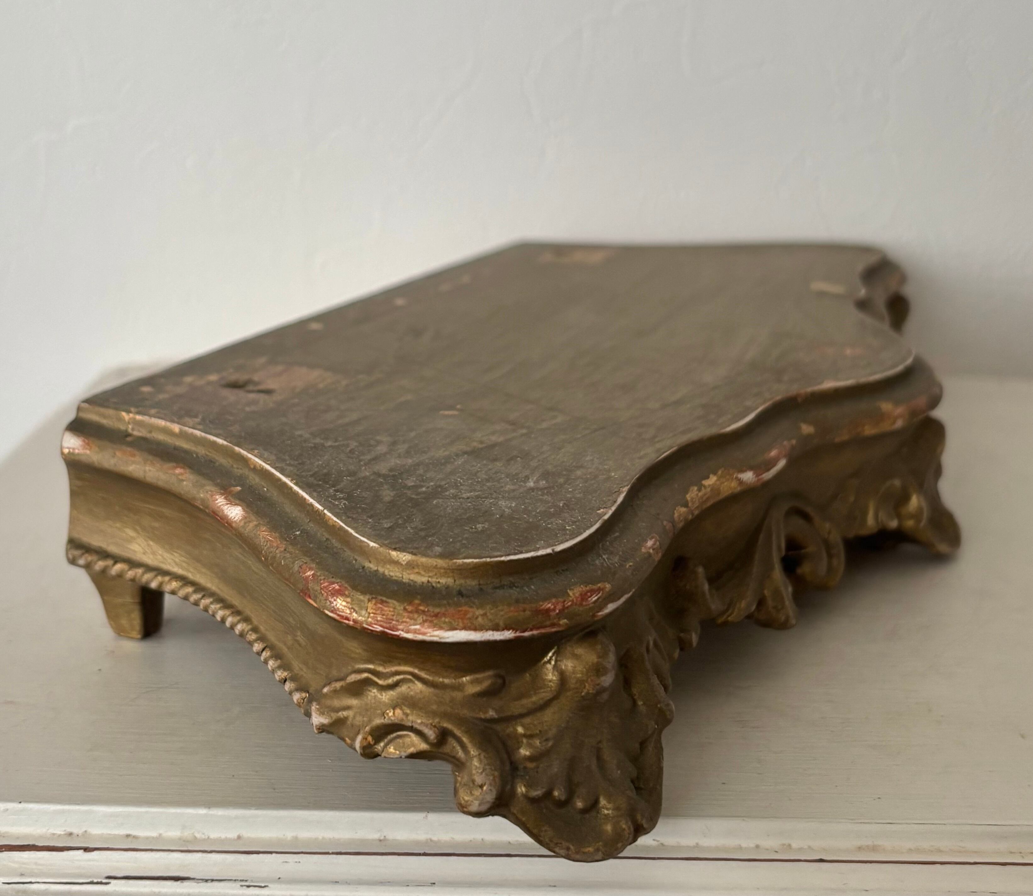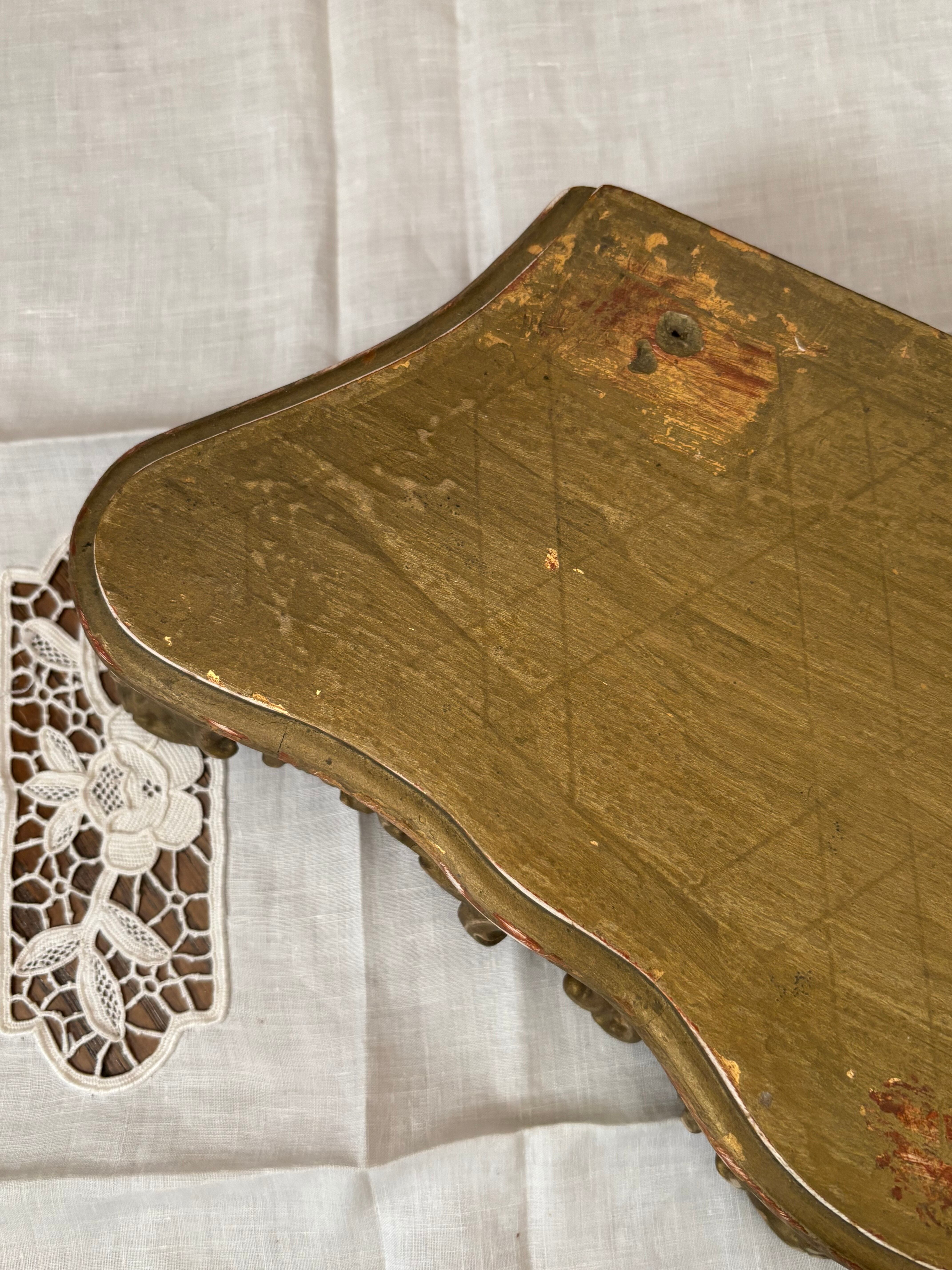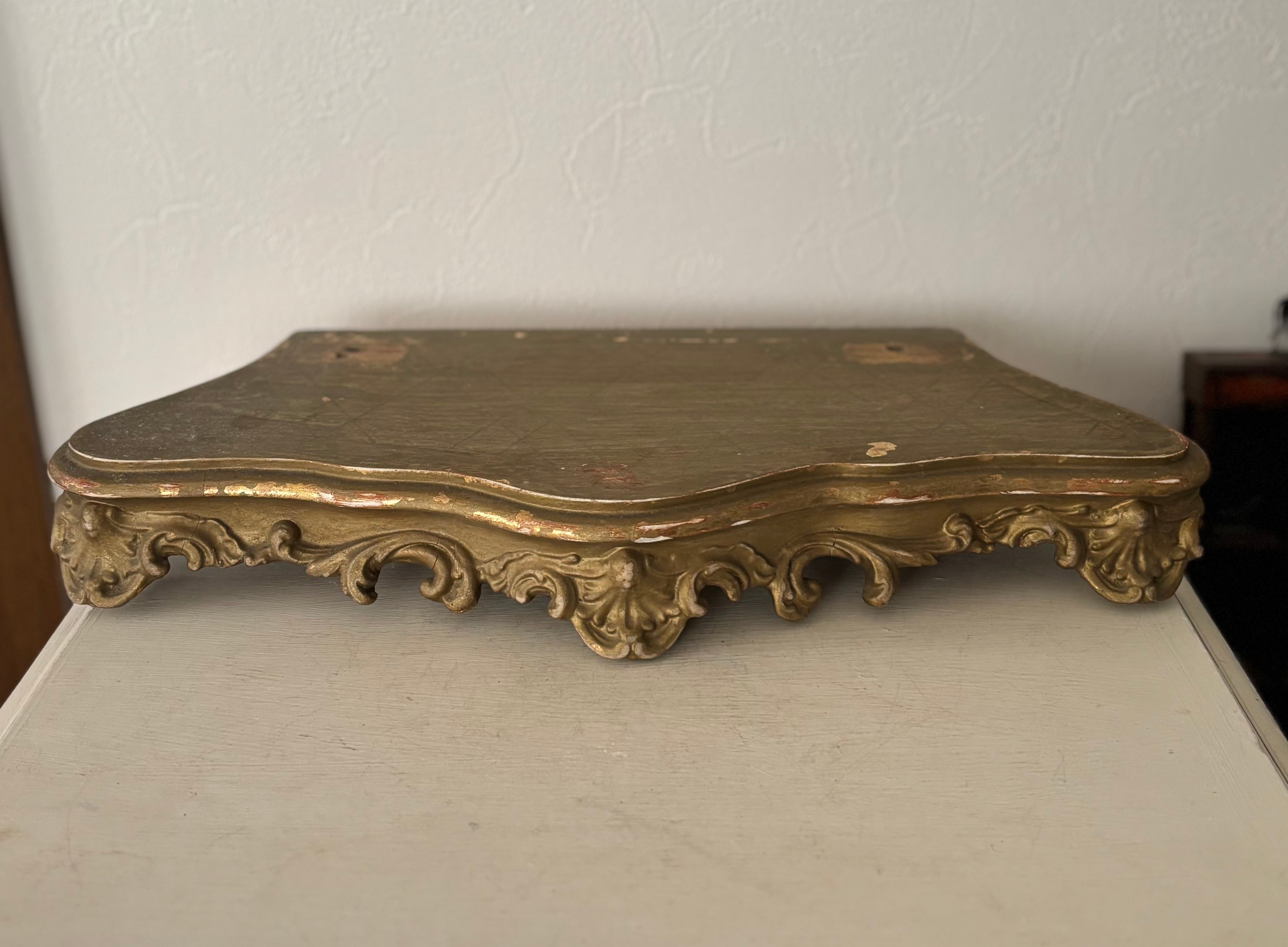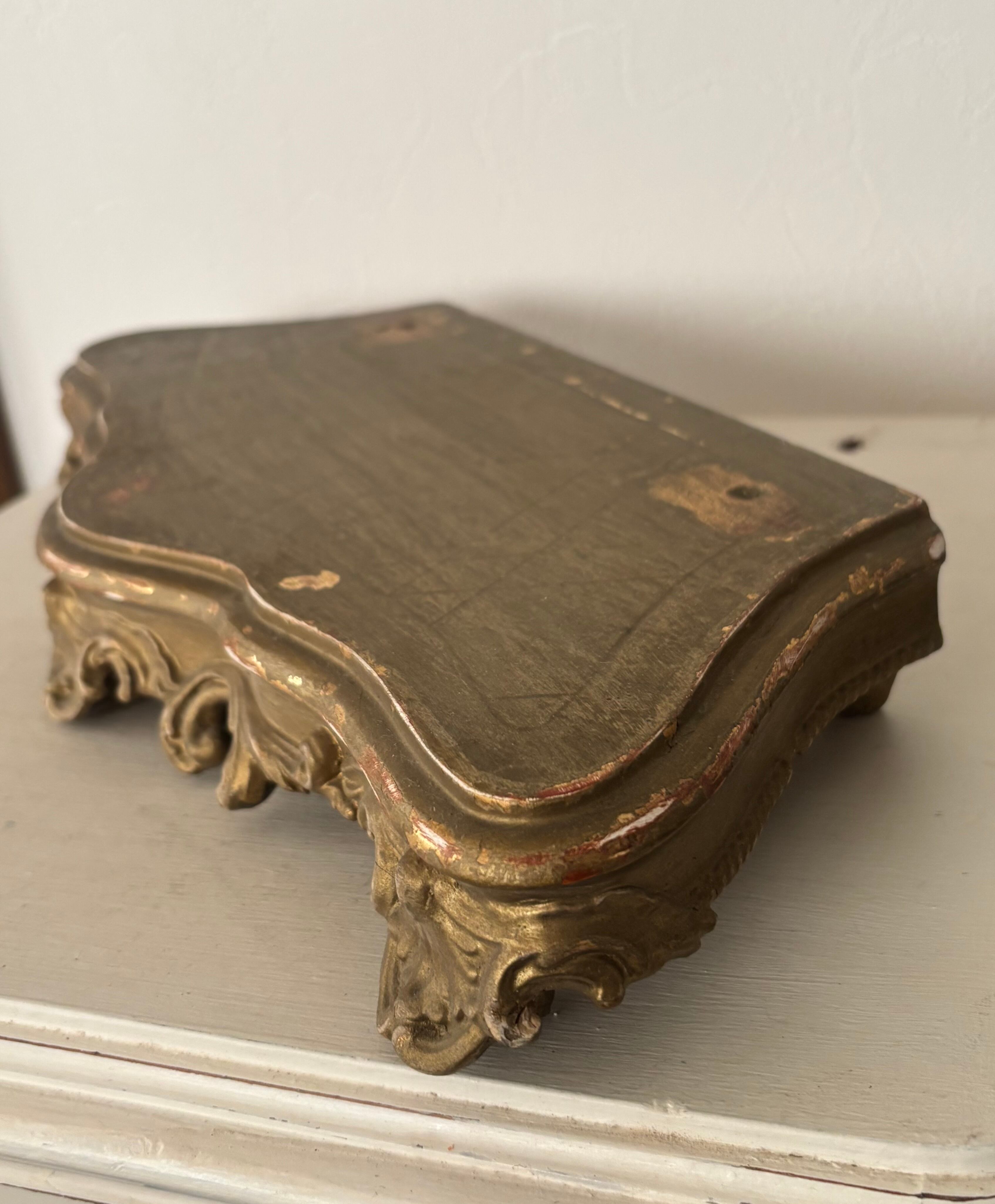 おそらく元は像やオブジェを固定して使われていた名残として、天板に穴が見られます。金彩の剥がれや擦れ、木部の小傷・割れなど経年の痛みはありますが、適度な大きさがあり、オブジェやドール、ガラス小物などをディスプレイするととても映える存在感のある台座です。またディスプレイすることで天板のダメージは目立ちにくく、時を経たものならではの風合いとしてお楽しみ頂けたらと思います。