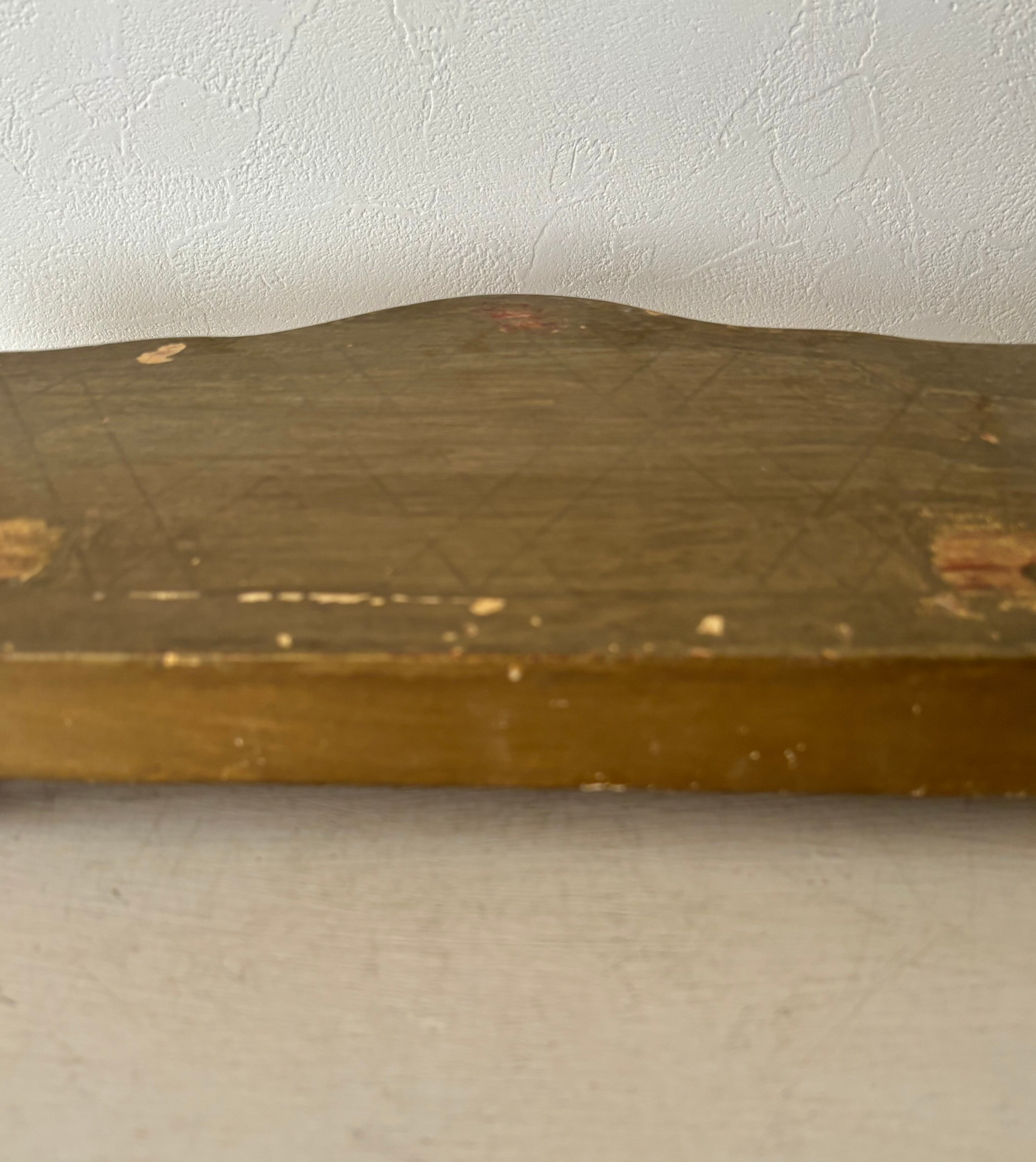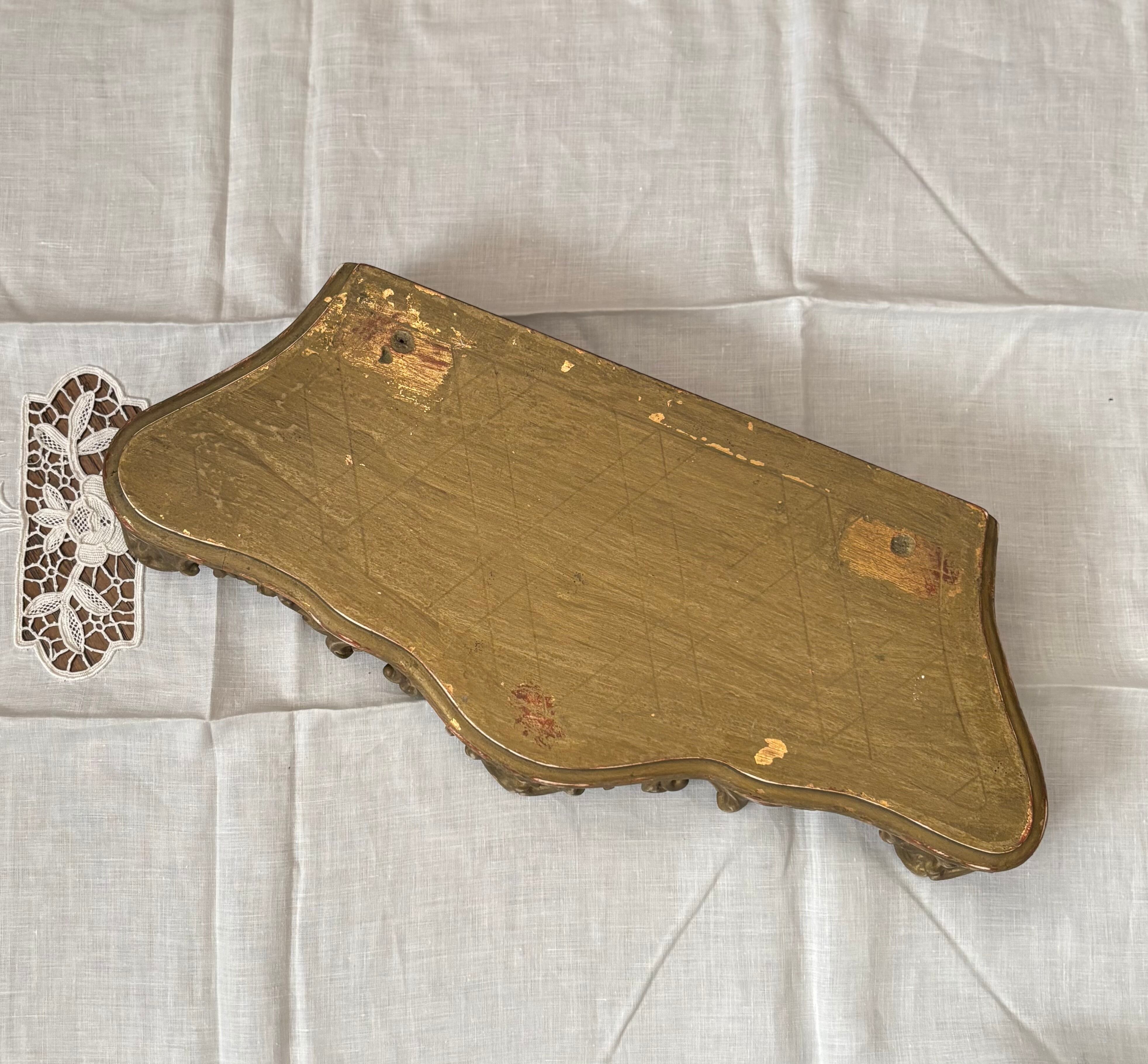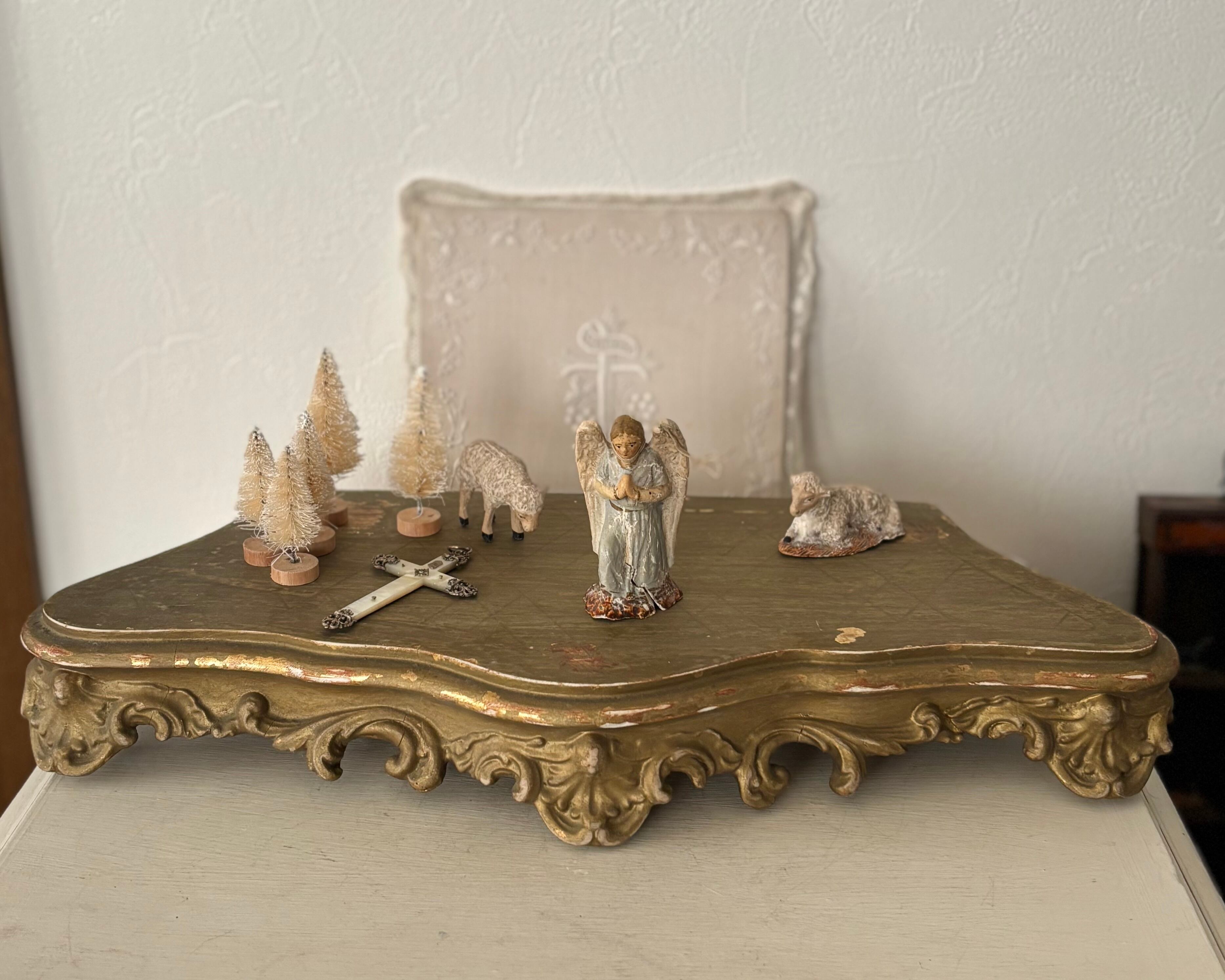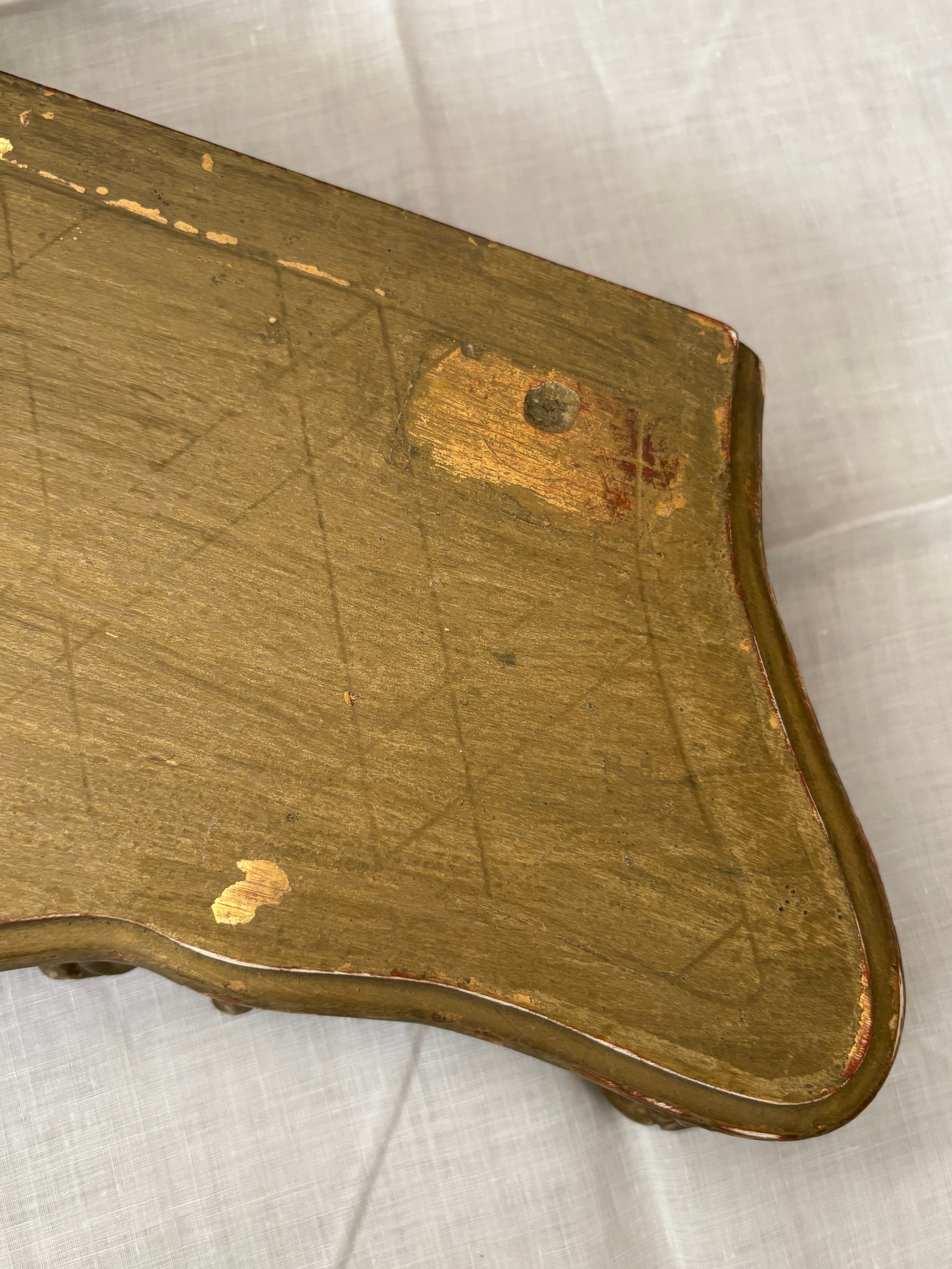 おそらく元は像やオブジェを固定して使われていた名残として、天板に穴が見られます。金彩の剥がれや擦れ、木部の小傷・割れなど経年の痛みはありますが、適度な大きさがあり、オブジェやドール、ガラス小物などをディスプレイするととても映える存在感のある台座です。またディスプレイすることで天板のダメージは目立ちにくく、時を経たものならではの風合いとしてお楽しみ頂けたらと思います。