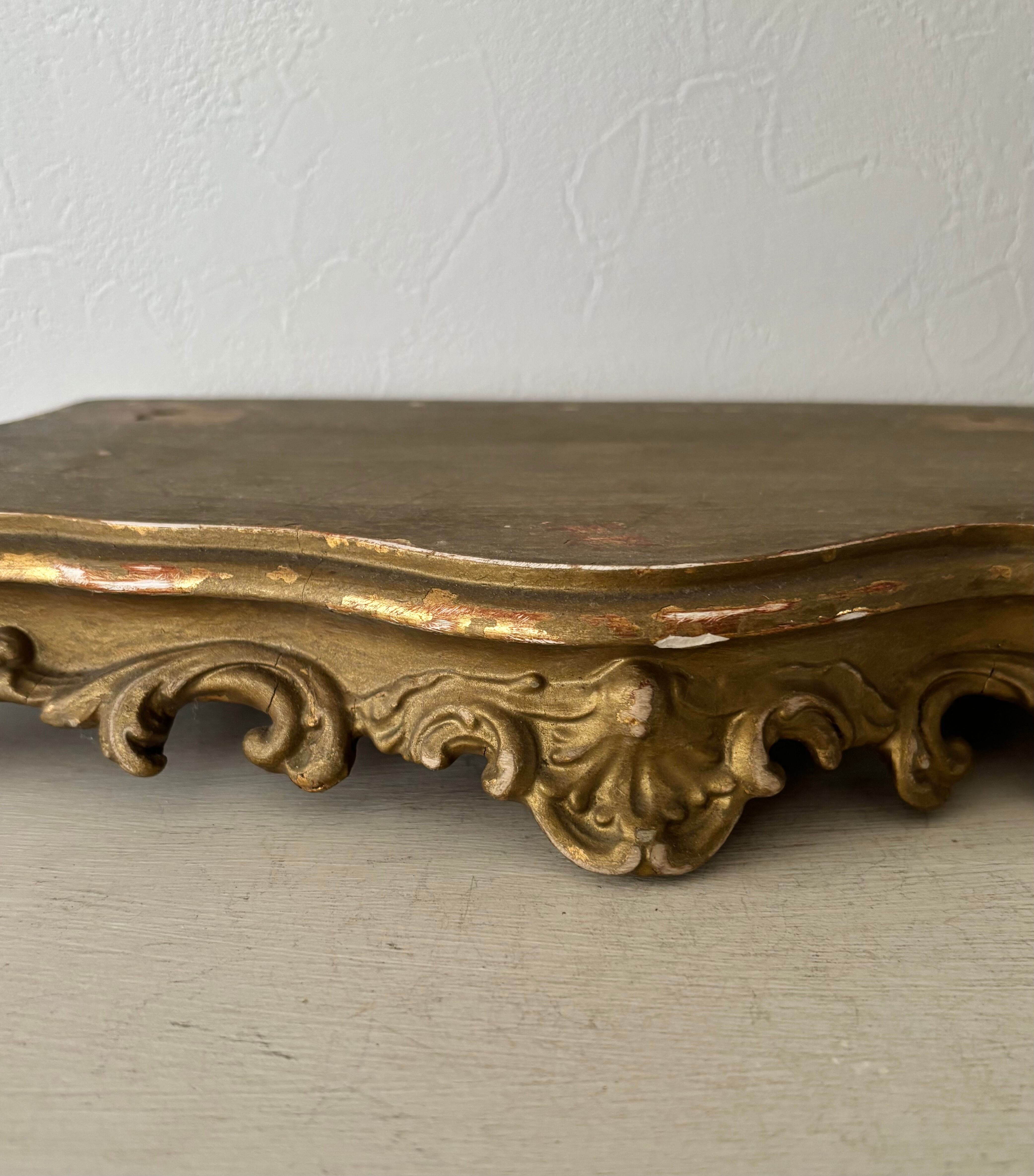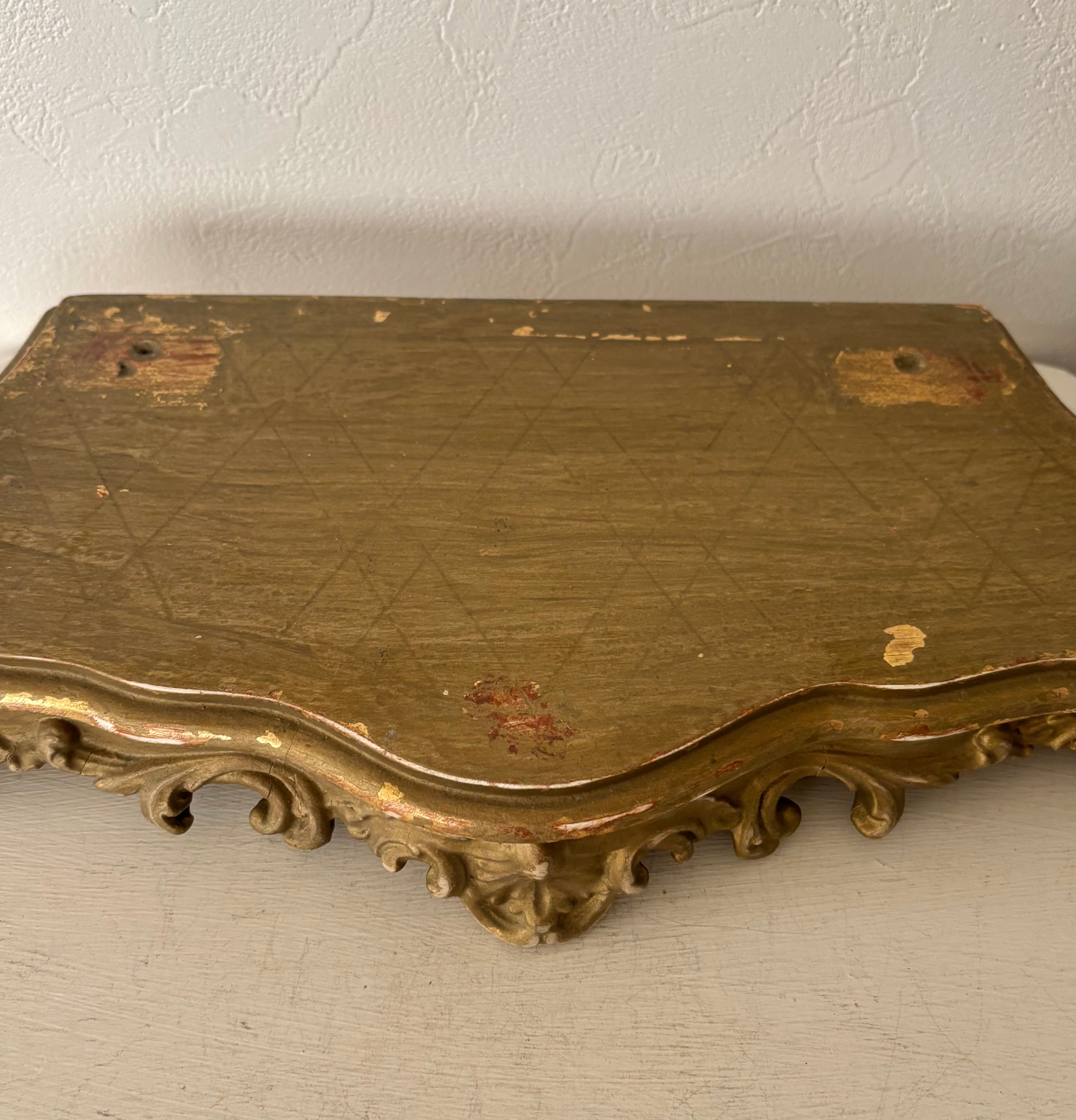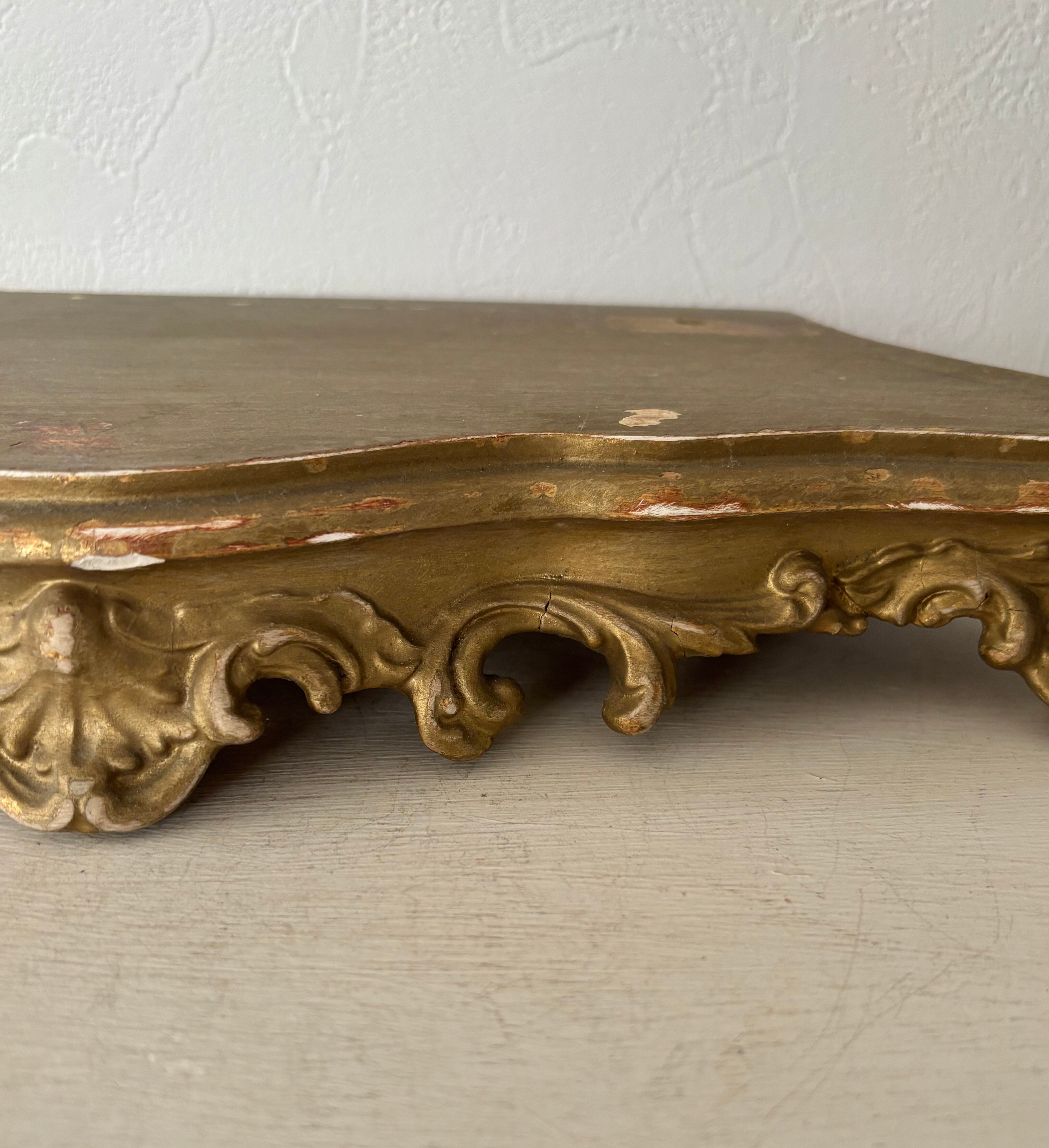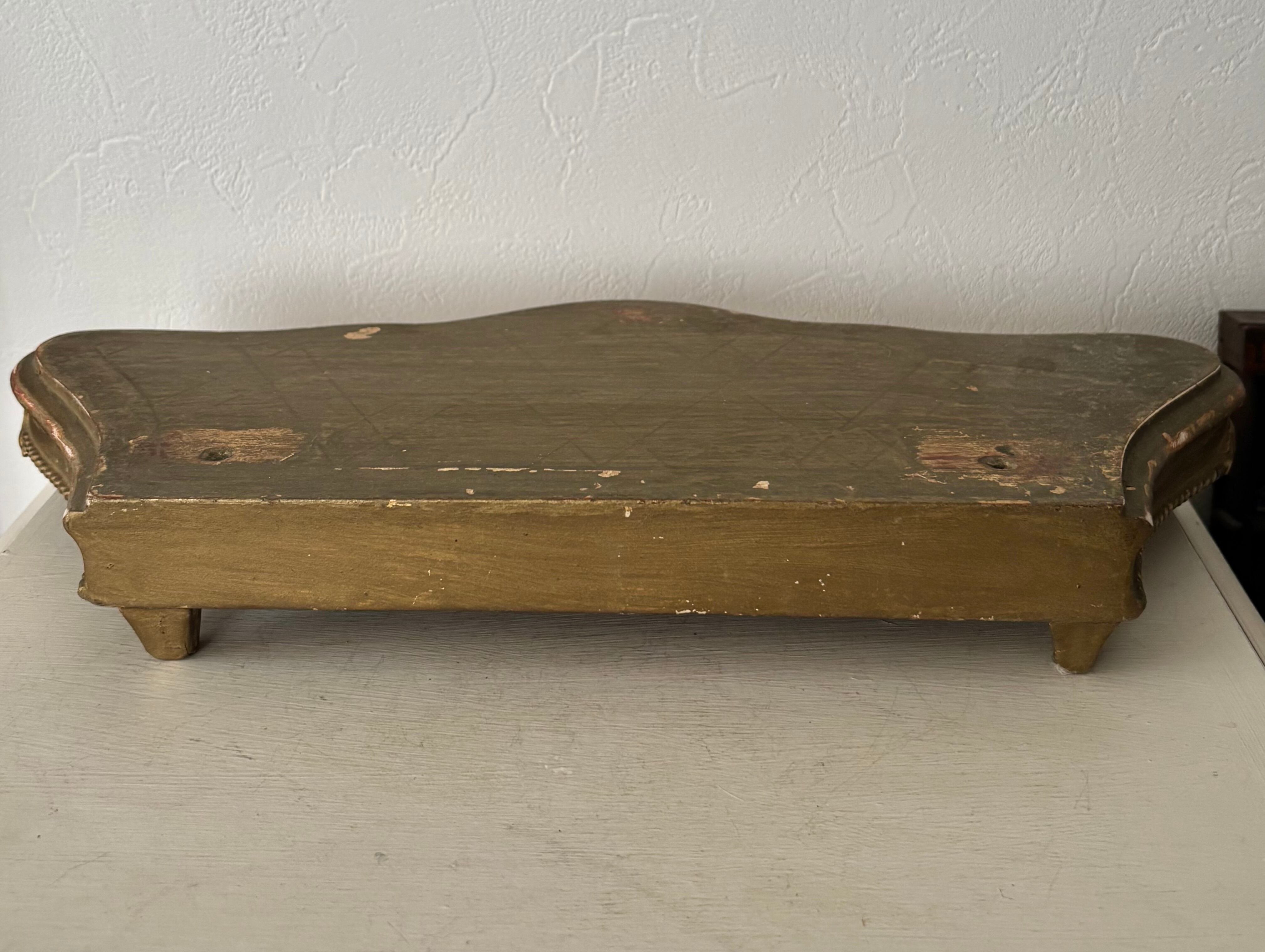 おそらく元は像やオブジェを固定して使われていた名残として、天板に穴が見られます。金彩の剥がれや擦れ、木部の小傷・割れなど経年の痛みはありますが、適度な大きさがあり、オブジェやドール、ガラス小物などをディスプレイするととても映える存在感のある台座です。またディスプレイすることで天板のダメージは目立ちにくく、時を経たものならではの風合いとしてお楽しみ頂けたらと思います。