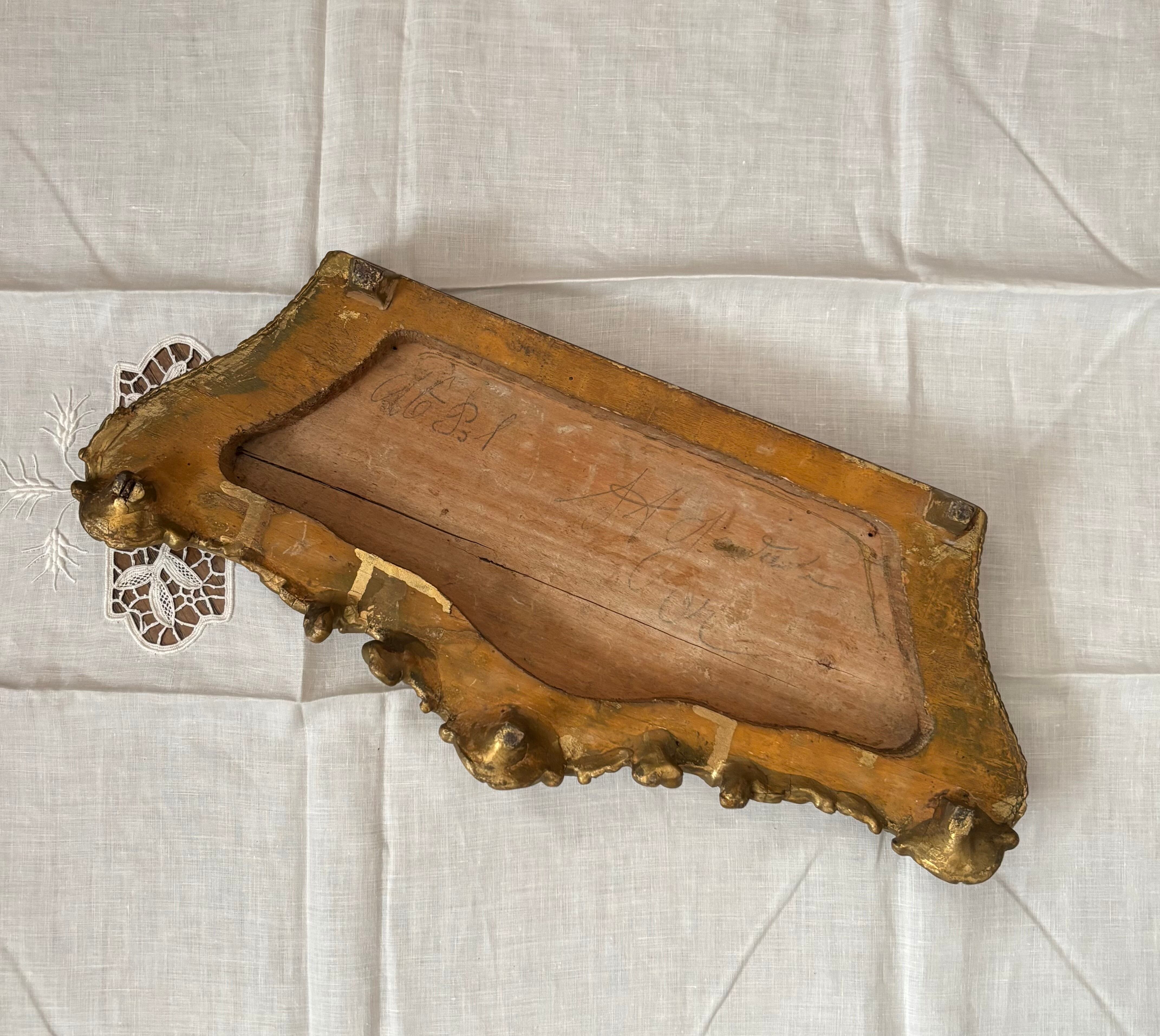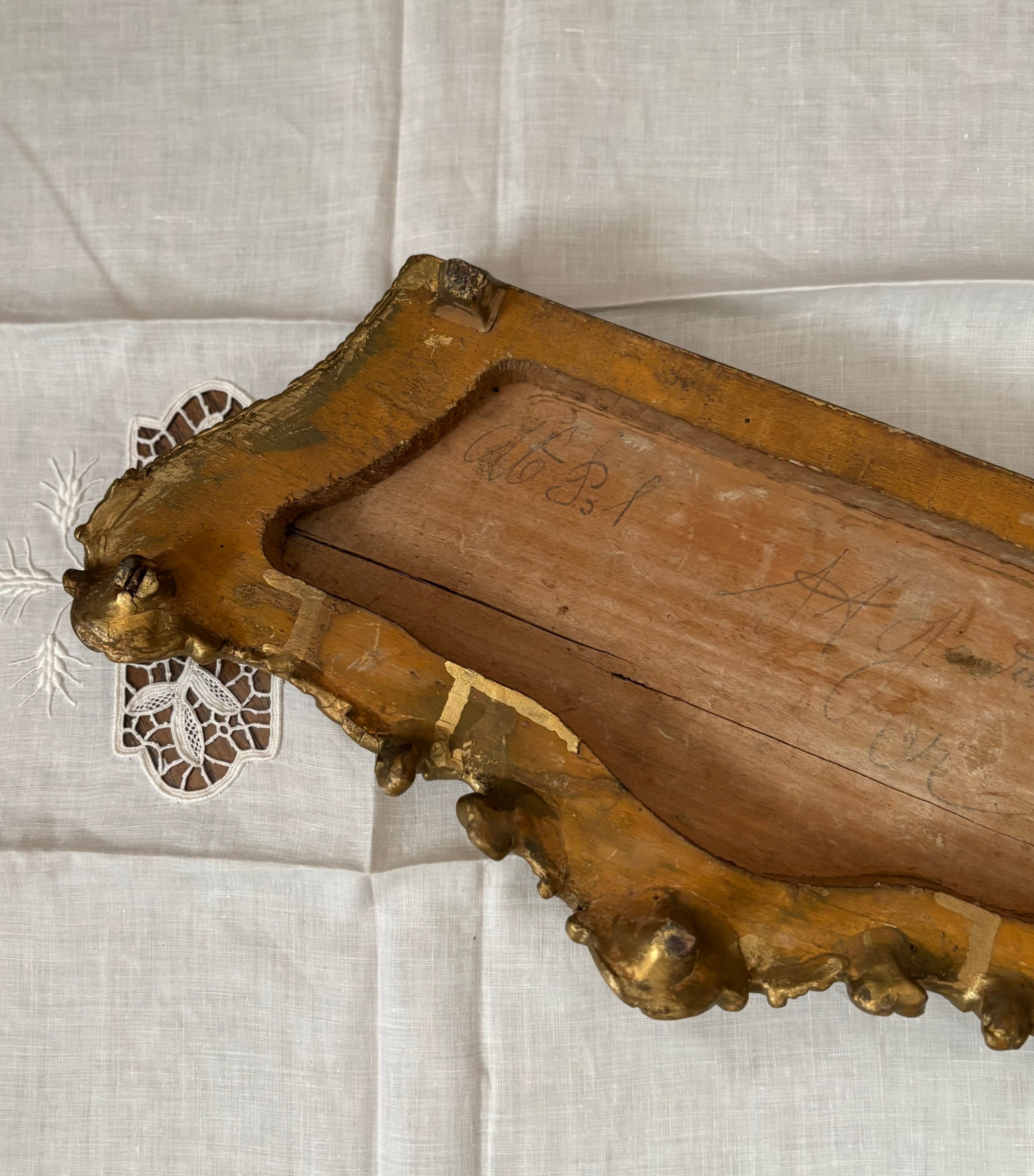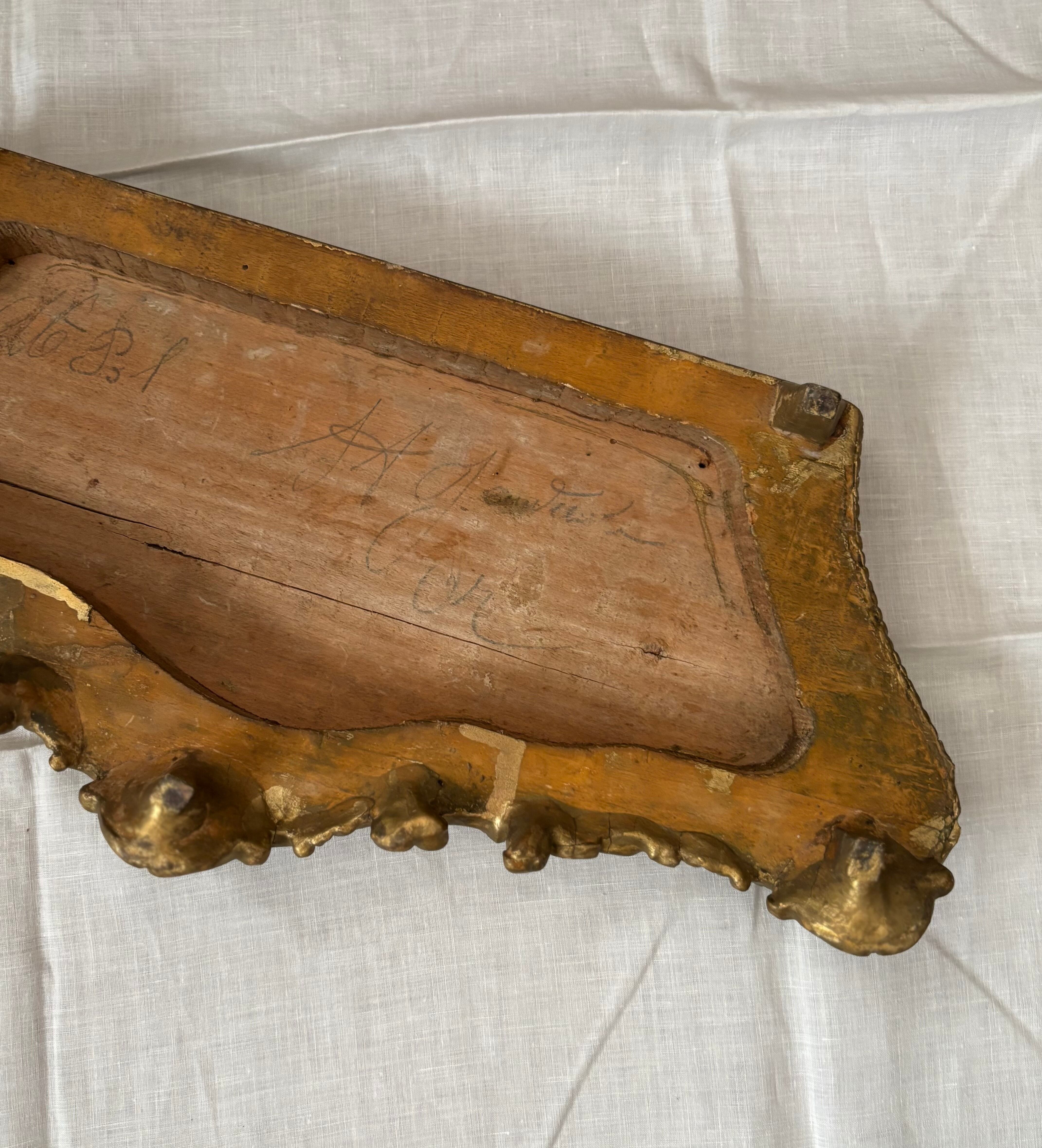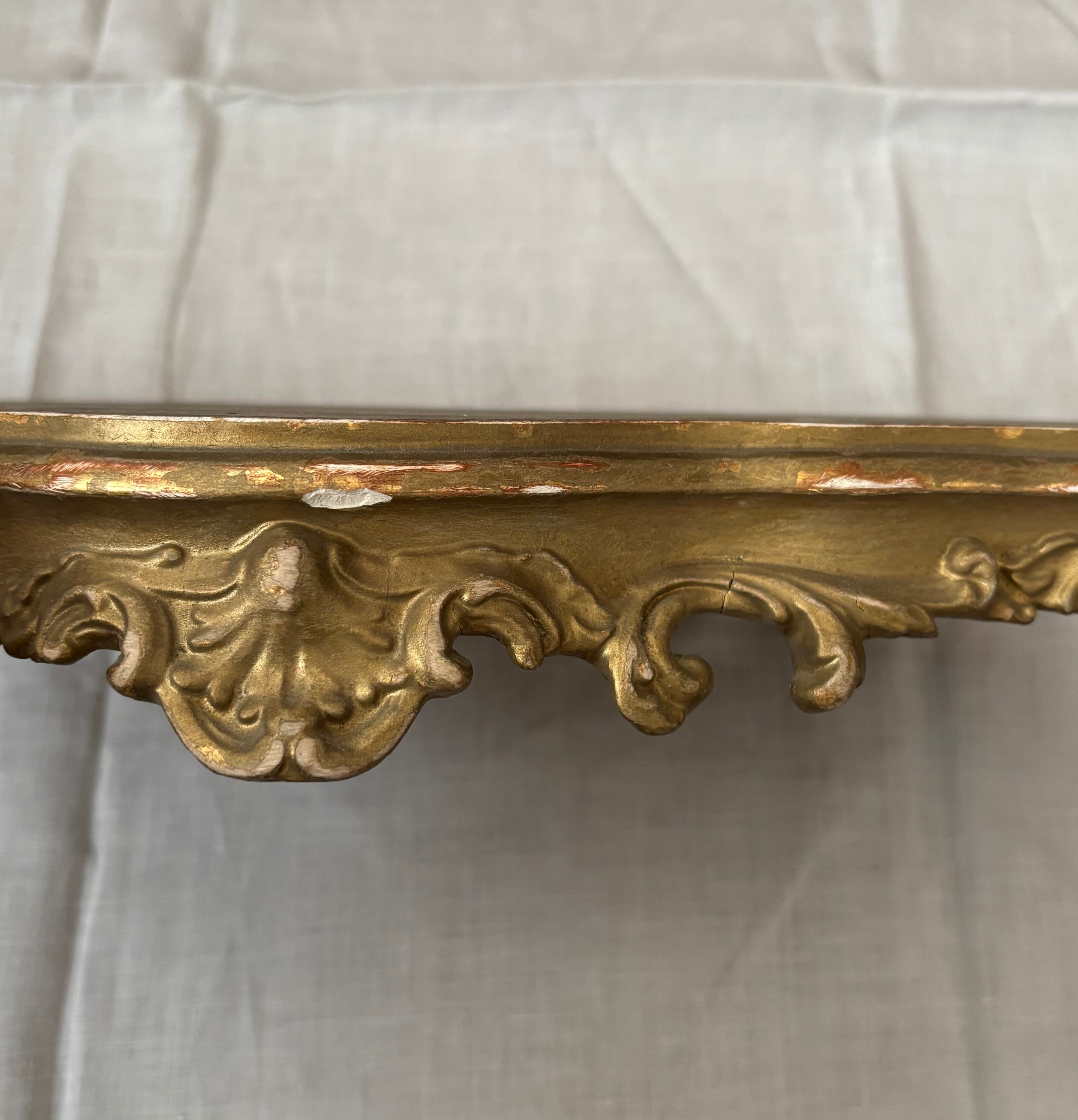おそらく元は像やオブジェを固定して使われていた名残として、天板に穴が見られます。金彩の剥がれや擦れ、木部の小傷・割れなど経年の痛みはありますが、適度な大きさがあり、オブジェやドール、ガラス小物などをディスプレイするととても映える存在感のある台座です。またディスプレイすることで天板のダメージは目立ちにくく、時を経たものならではの風合いとしてお楽しみ頂けたらと思います。