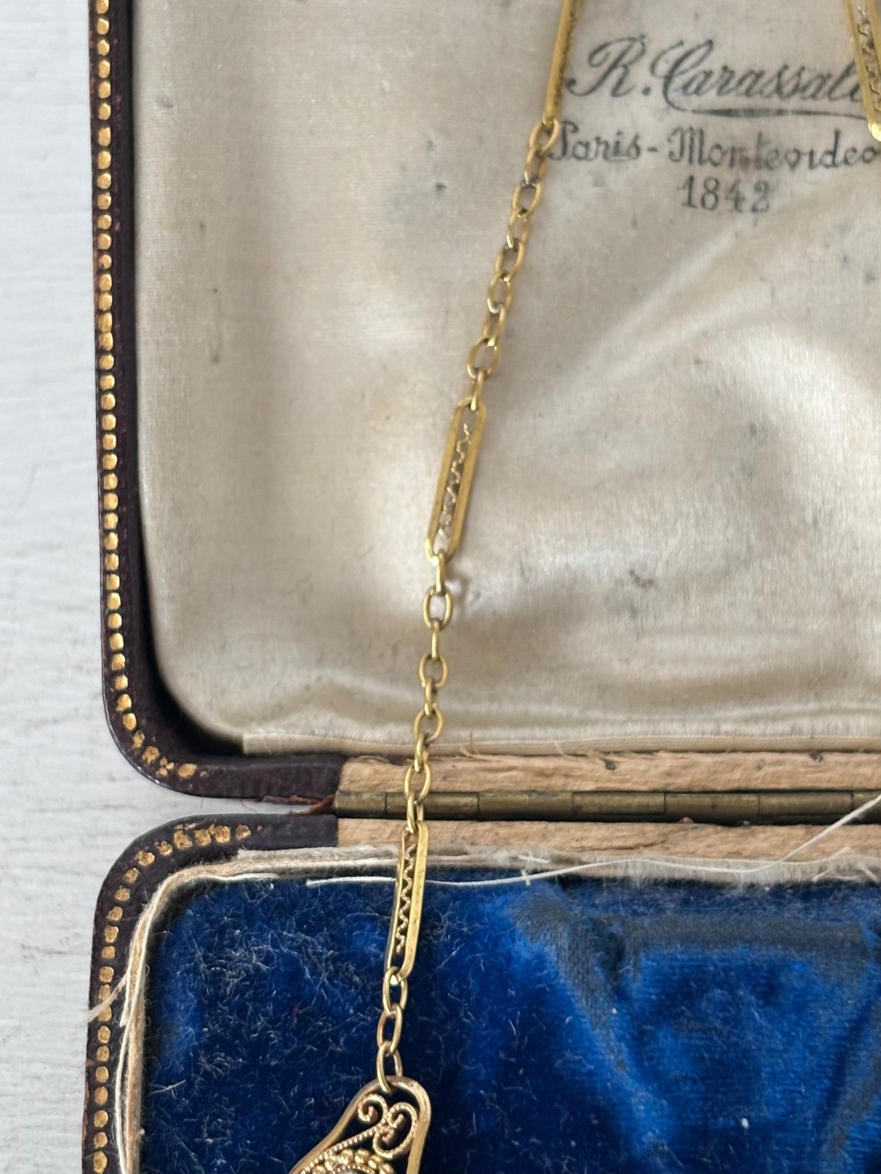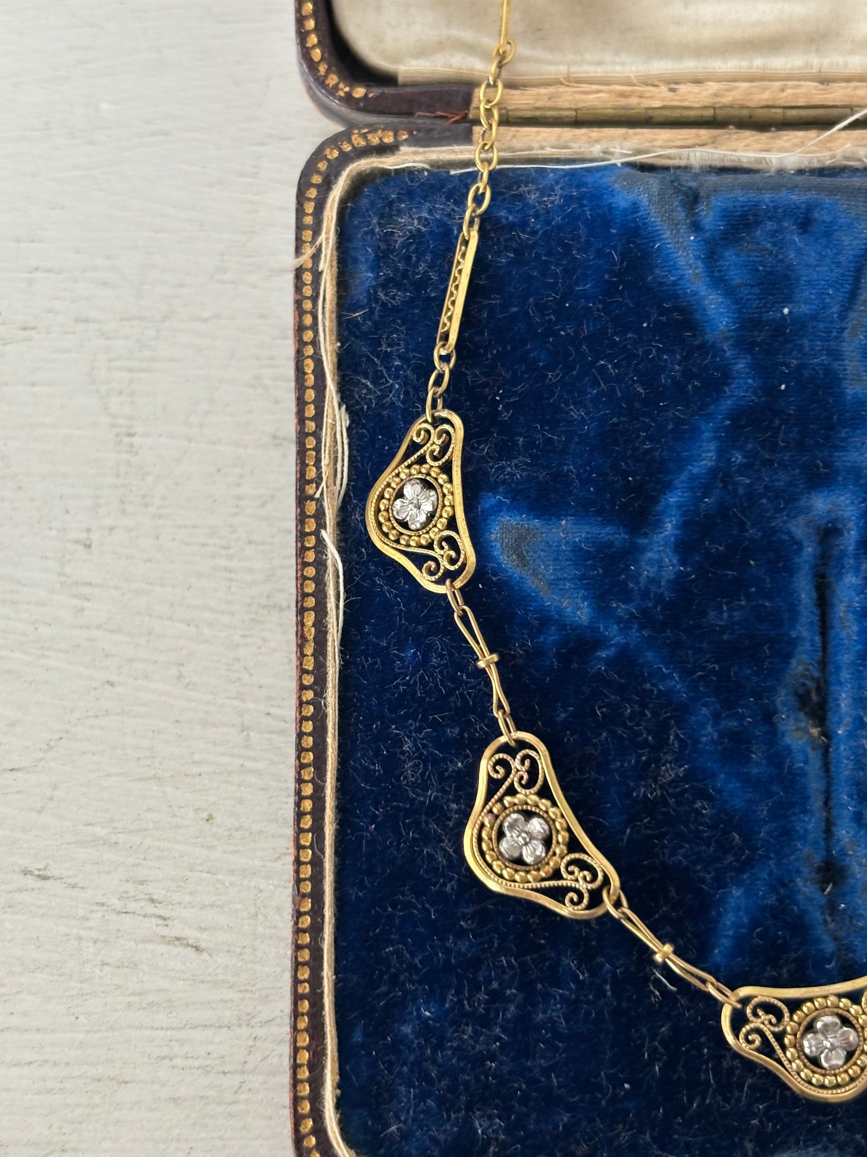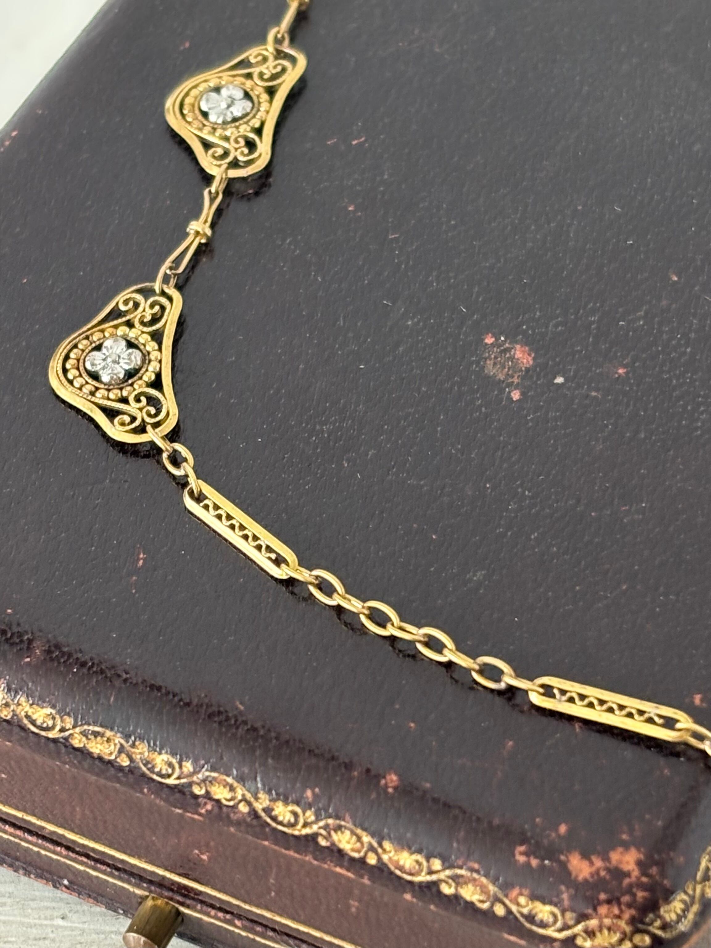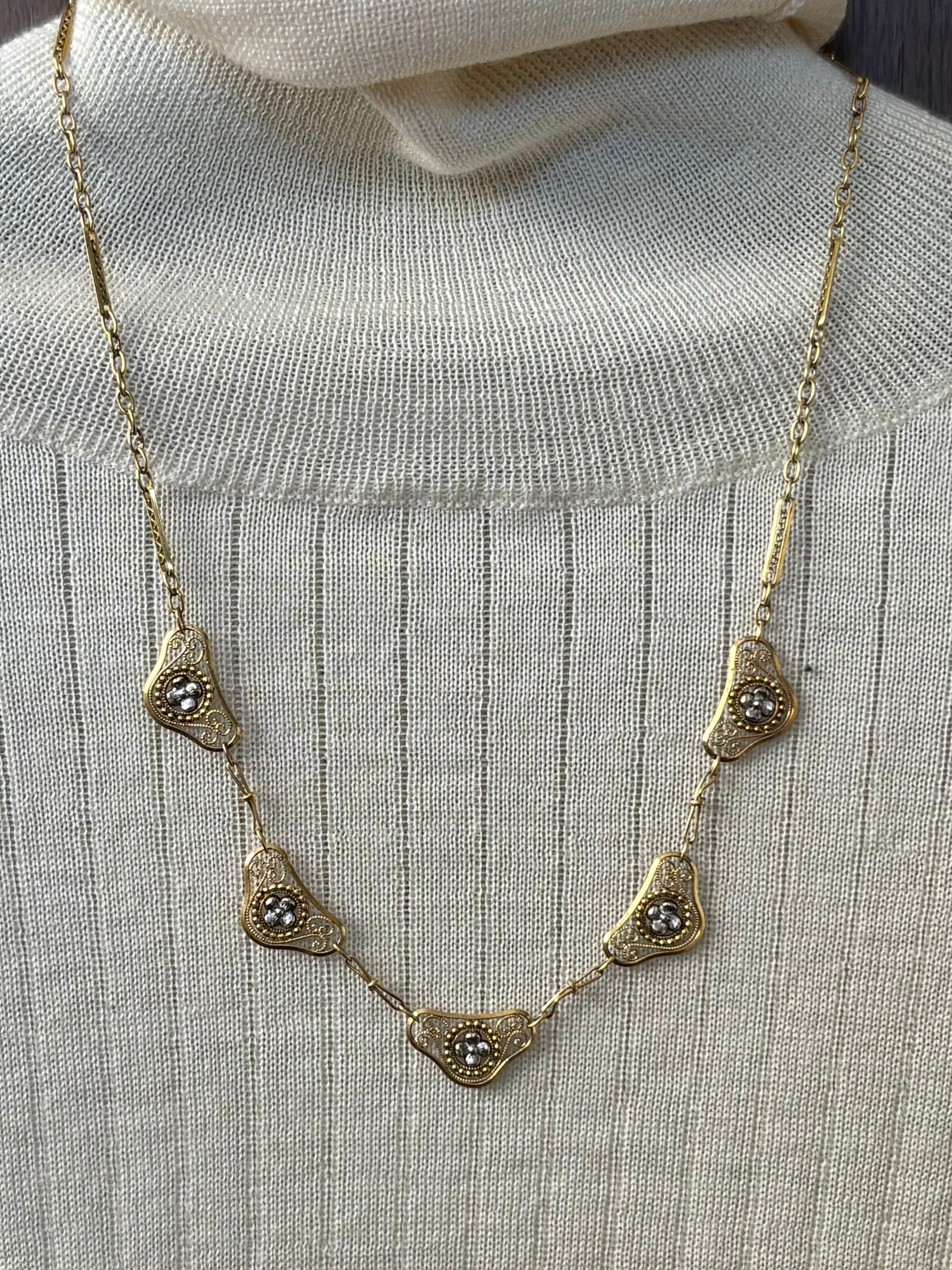 ORIA刻印、カトルフォイル(四弁花)モチーフのアンティークネックレス。