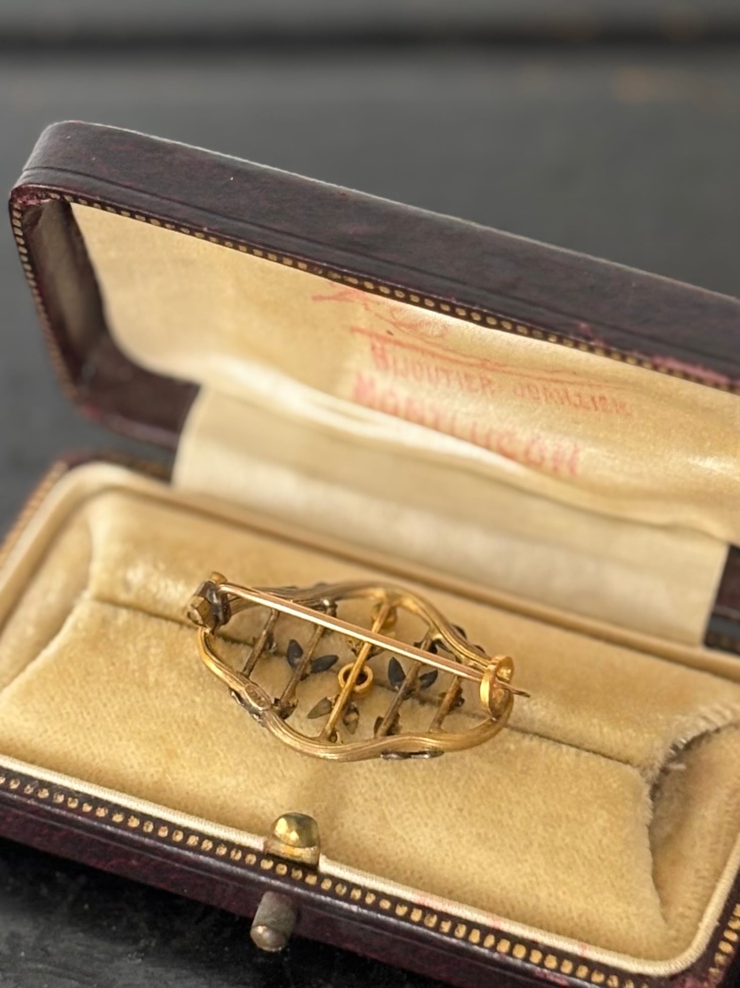 金張りならではのやわらかな色合いと、時を経た風合いが調和し、主張しすぎない上品さを備えたブローチです。