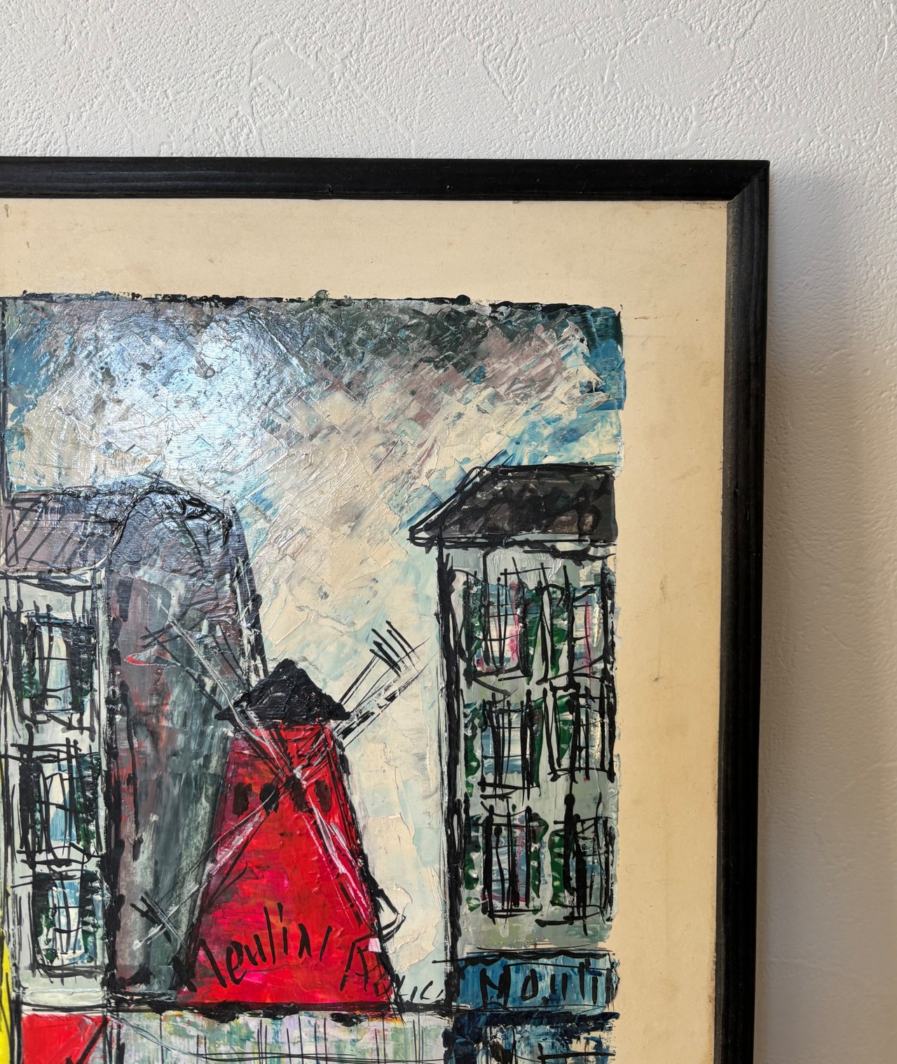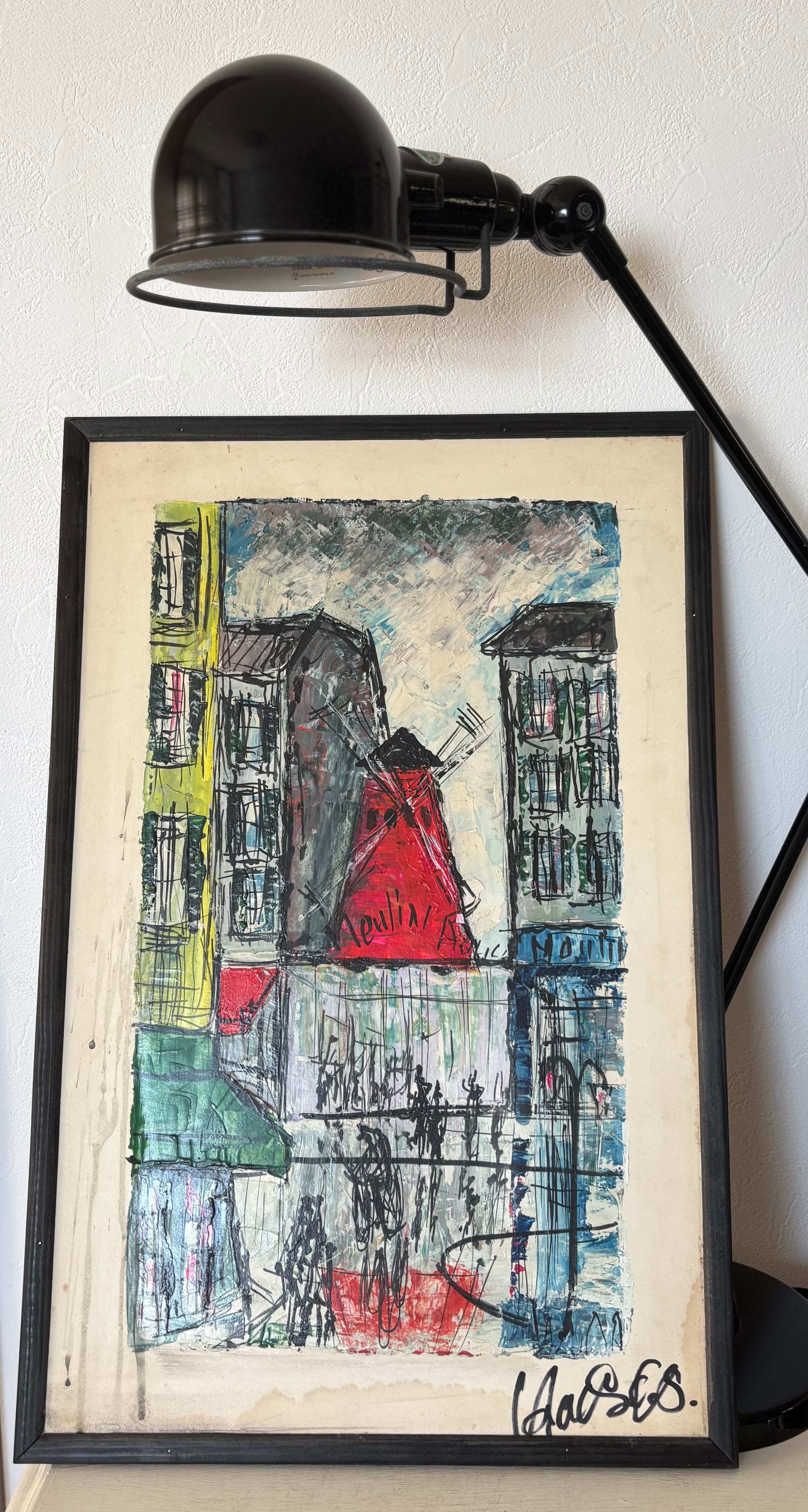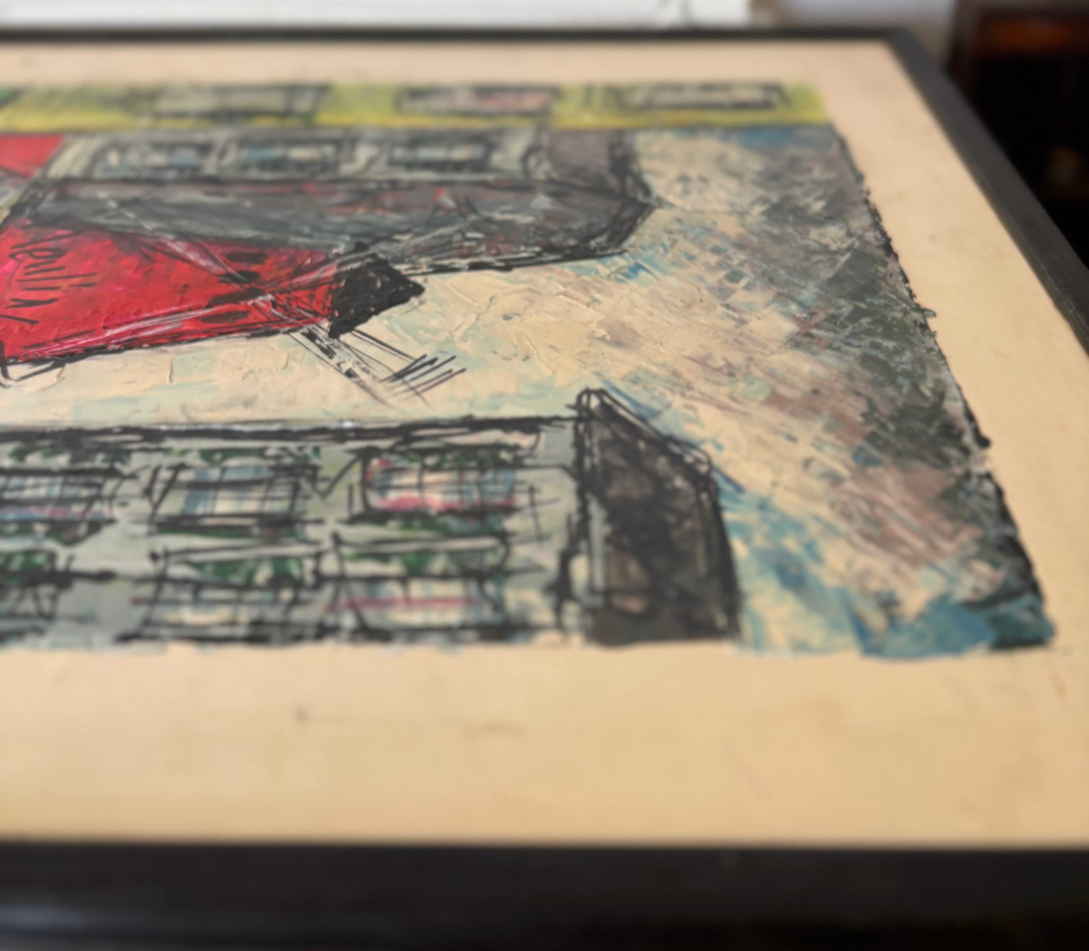 印象的な赤で、ムーラン・ルージュが描かれており、昼と夜、日常と非日常が交差するモンマルトルの空気感が表現されています。