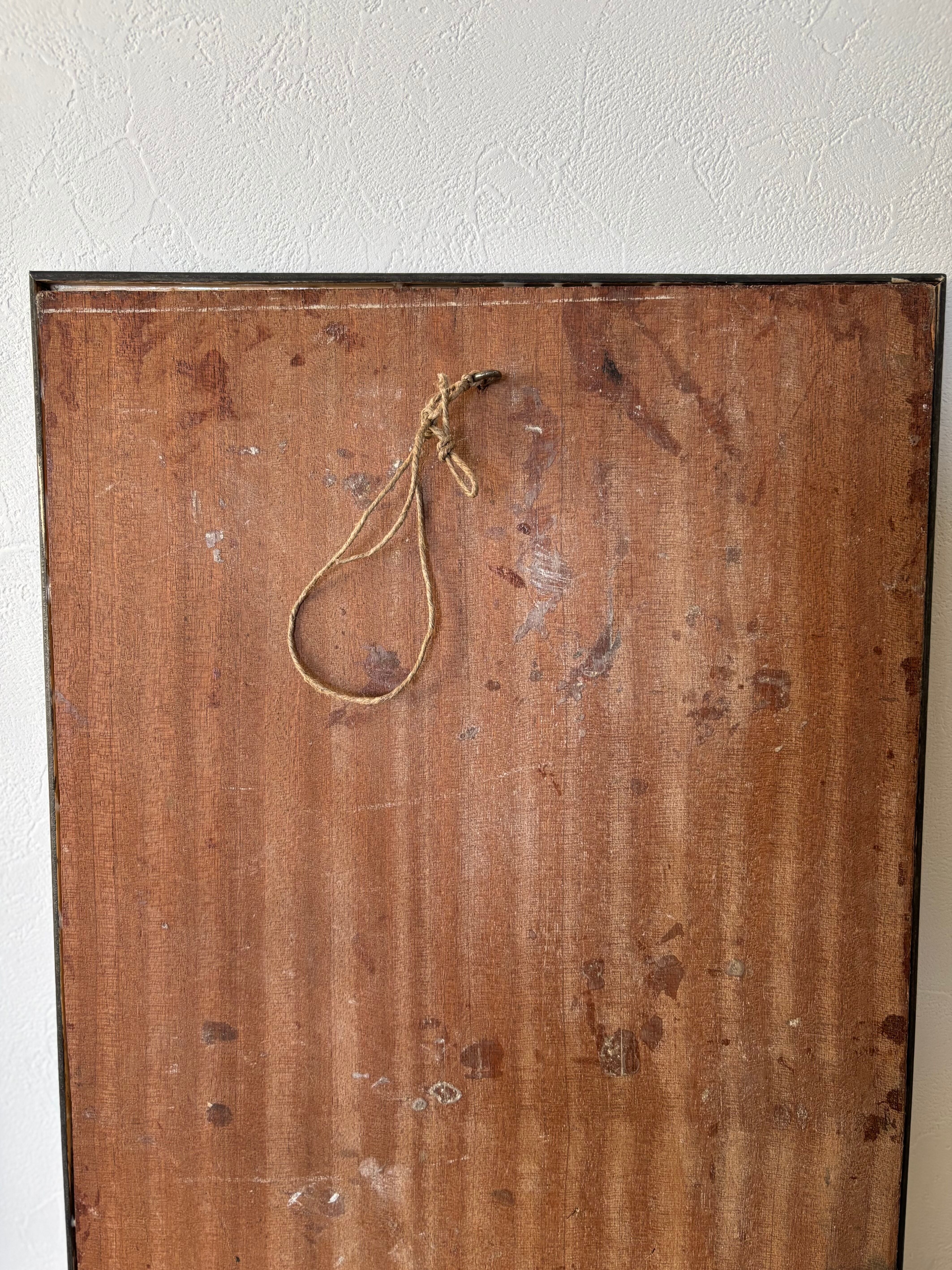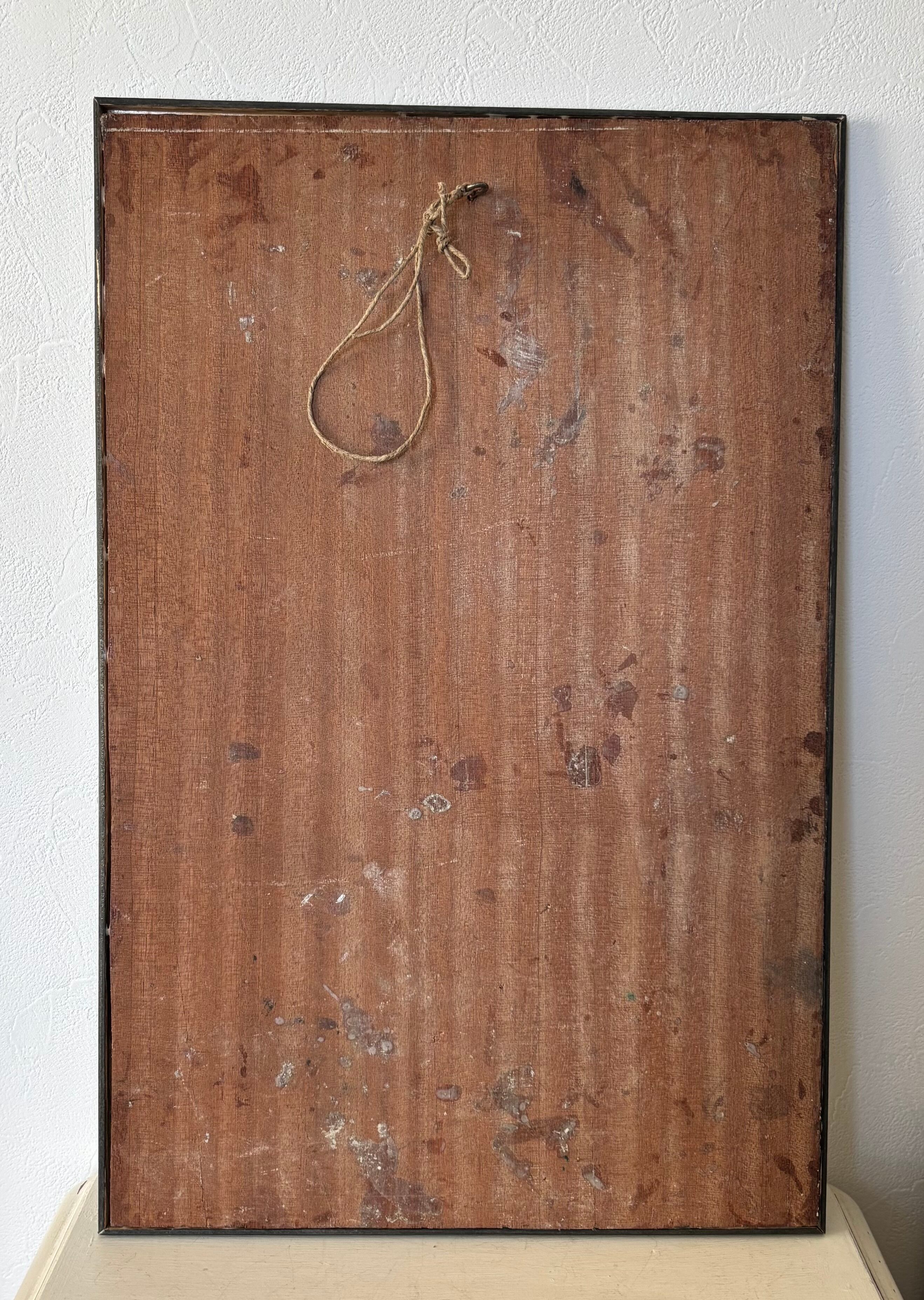支持体にはキャンバスではなく木製パネル(板)を使用。絵具の重なりや引っかきによる線、ハッチングを思わせる描写など、絵具と線描を組み合わせた表現主義的なタッチが特徴です。ガラスを入れない額装のため、筆致や素材感をダイレクトにお楽しみいただけます。