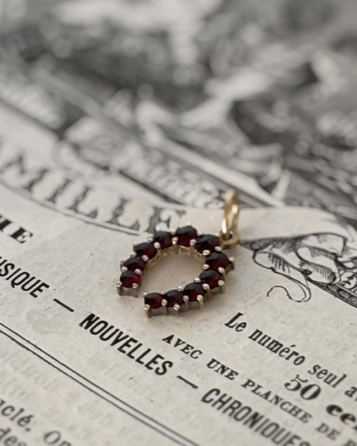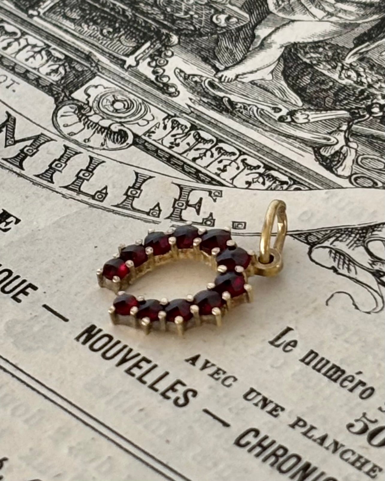 光を取り込み、ガーネット本来の色味と透明感を引き立てる、19世紀らしいクラシックな仕立てです。