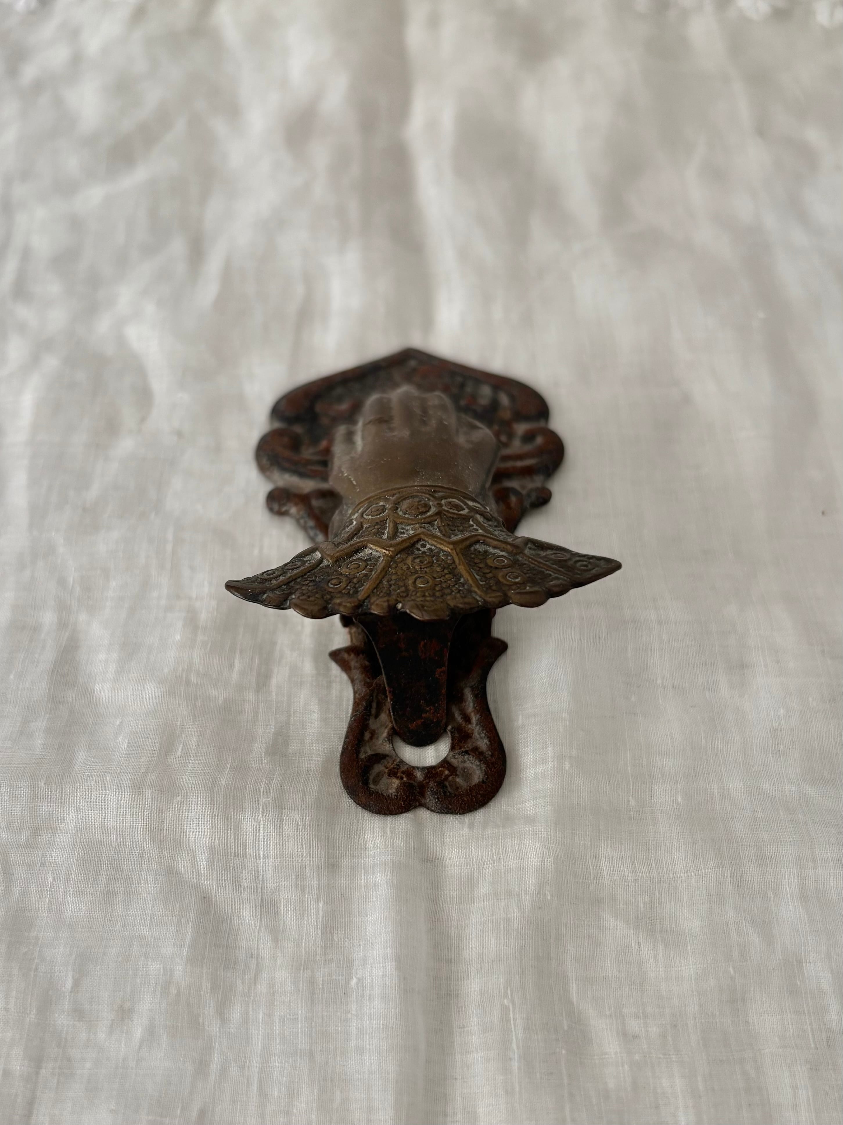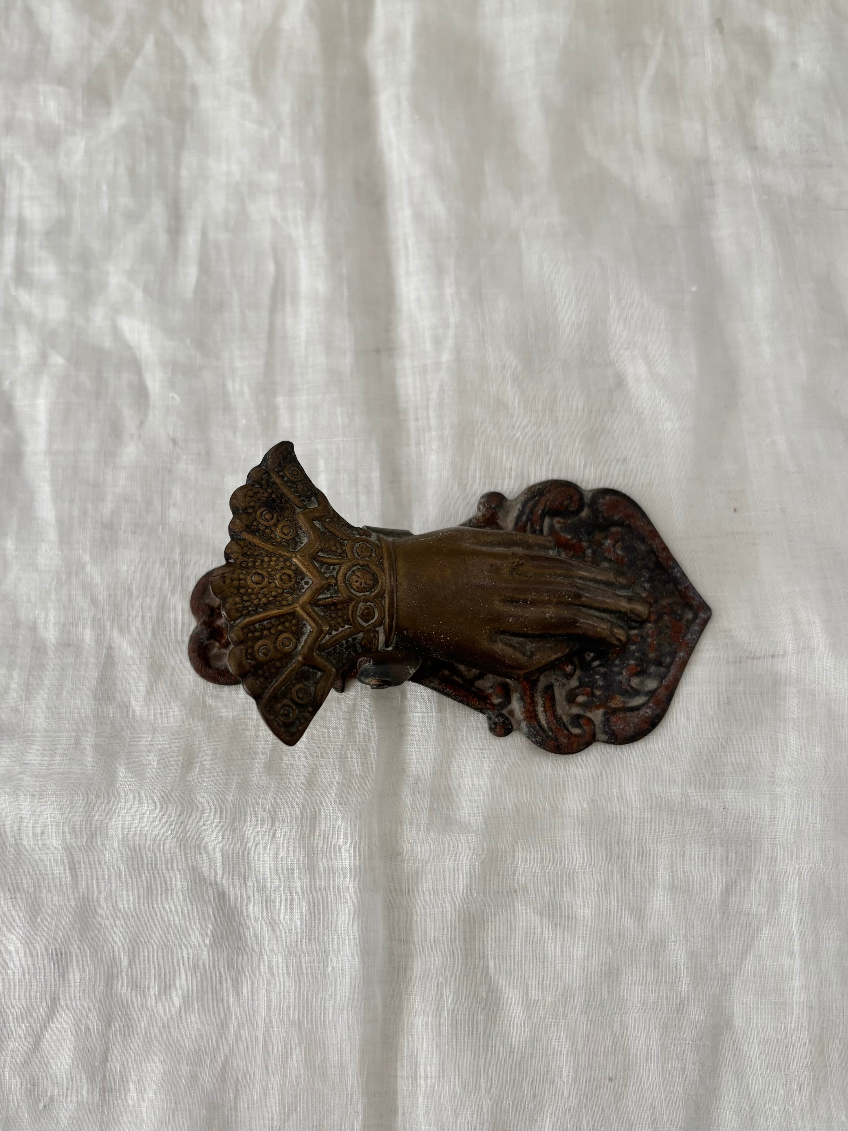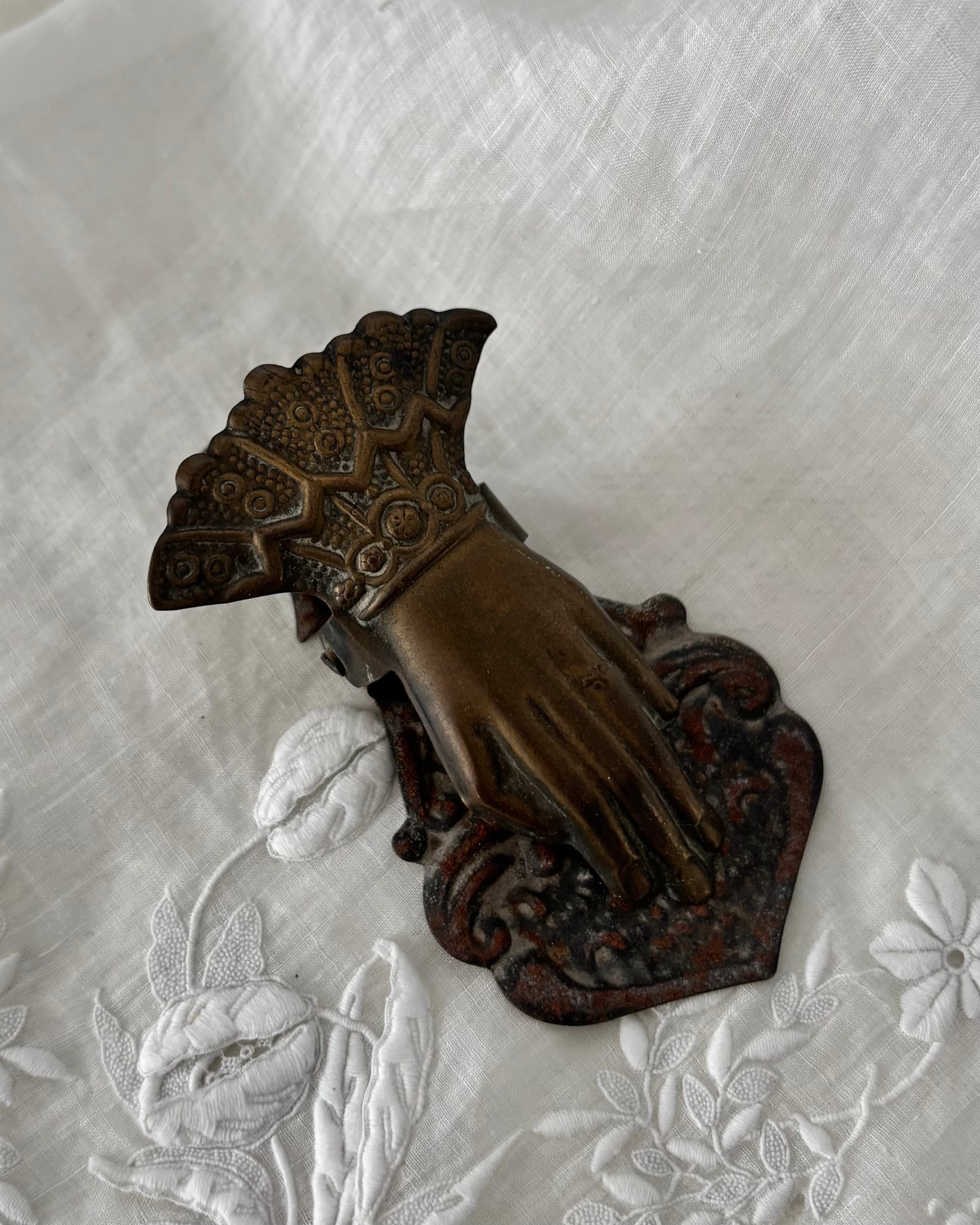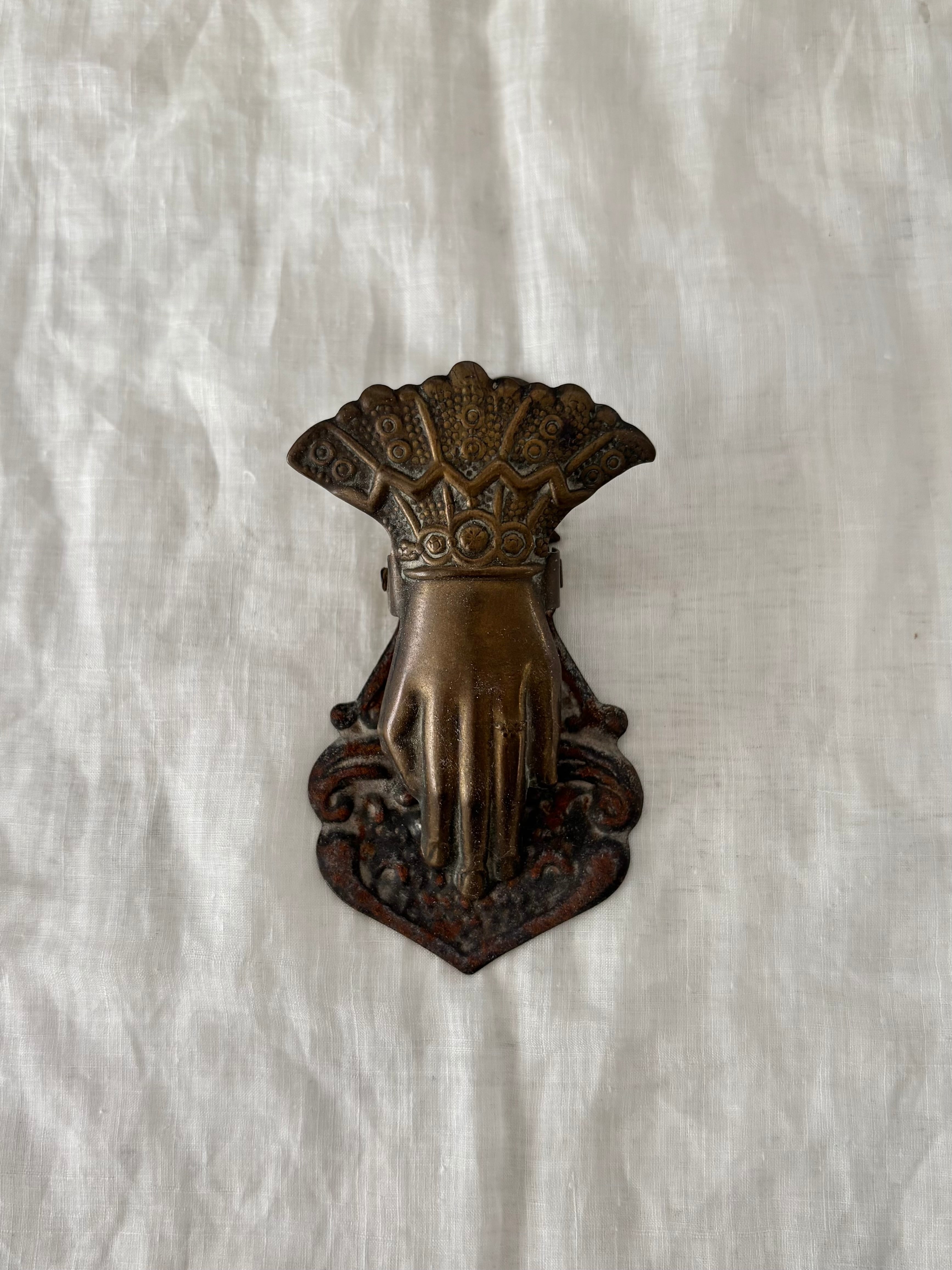 指輪をはめた手の造形と、袖口の繊細なデザインが美しい、古いハンドクリップです。