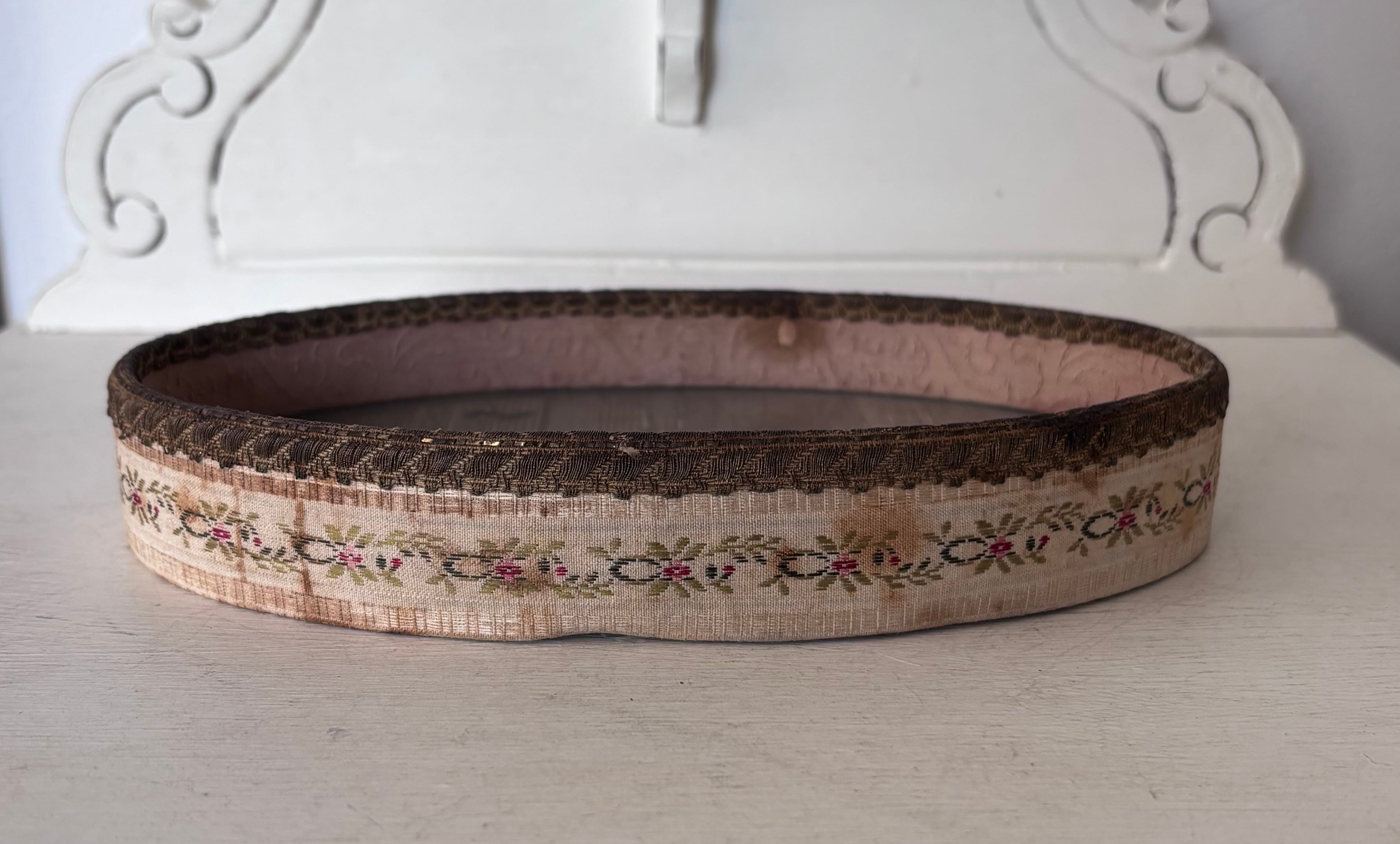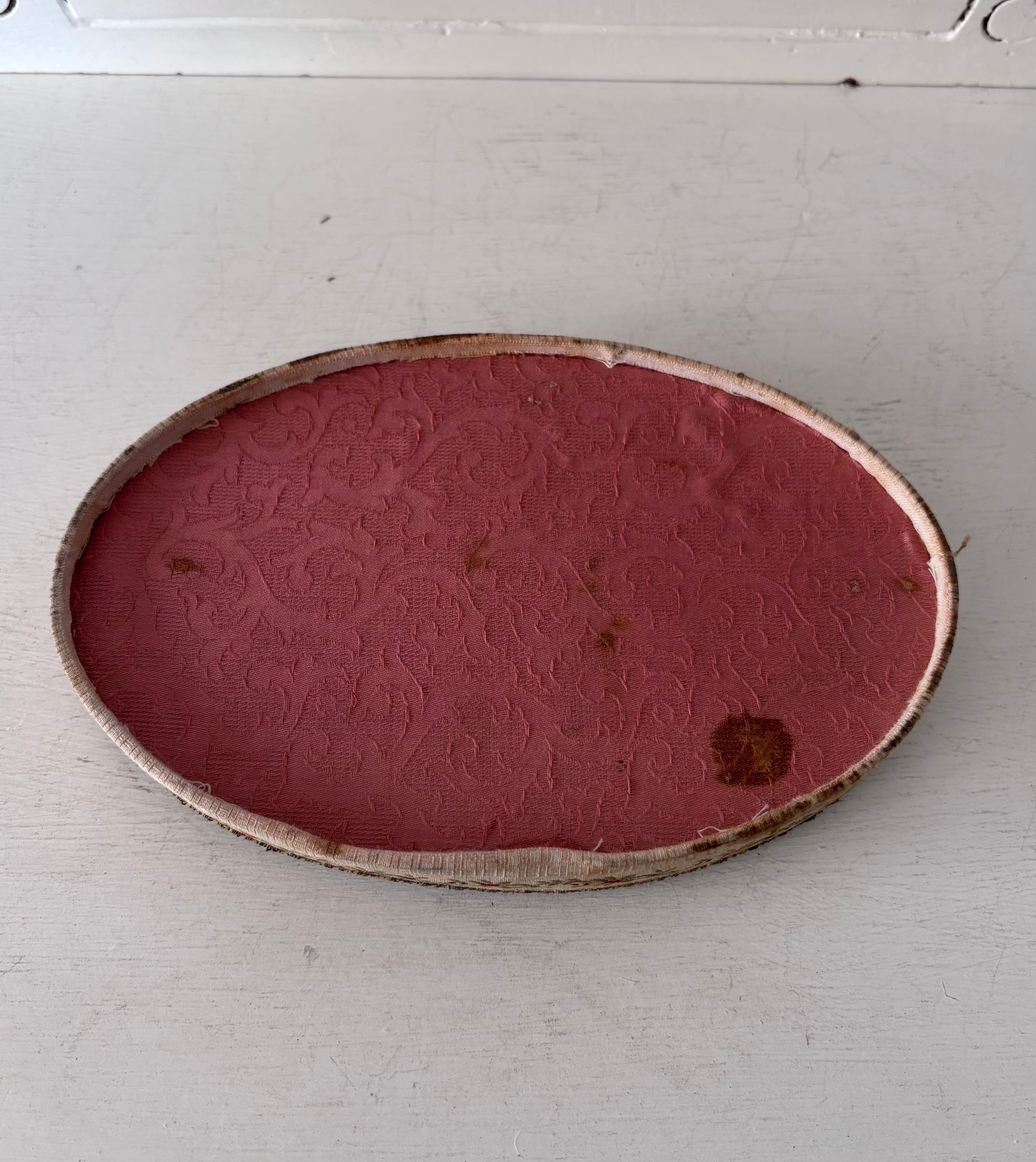 側面は小花のガーランド模様の布張り、縁にはブラウンのブレード(装飾テープ)があしらわれ、内側は当時らしい唐草模様の入ったピンクの布で仕上げられています。