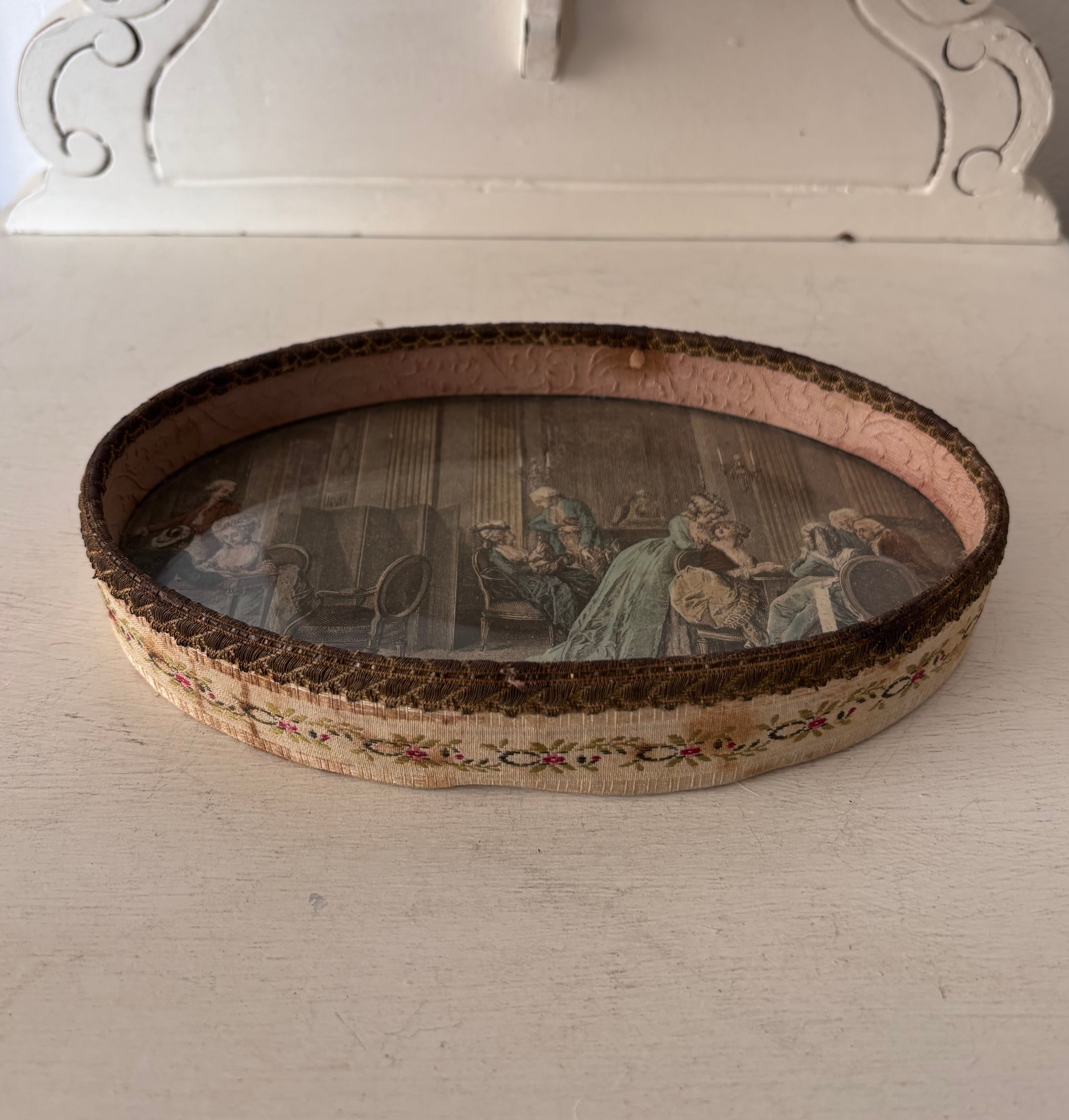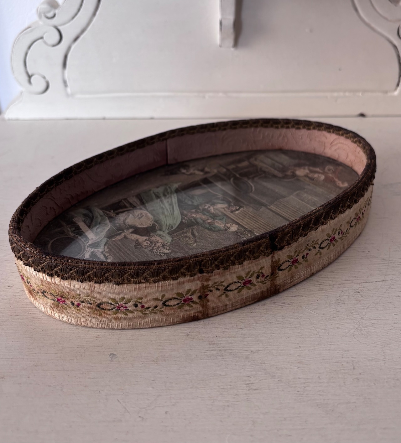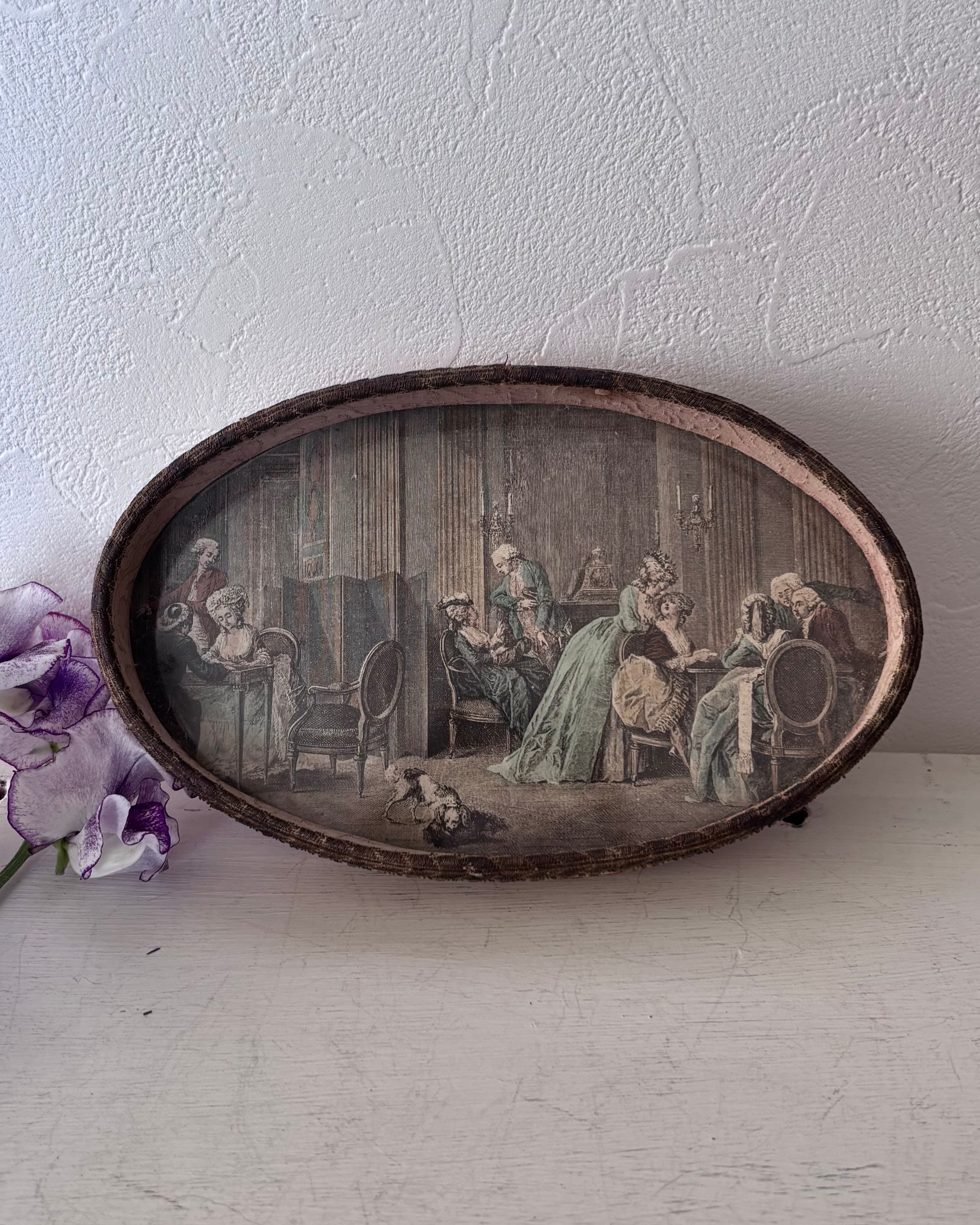 19世紀末〜20世紀初頭頃のフランスアンティーク、版画絵柄が美しい布張りオーバルトレイです。