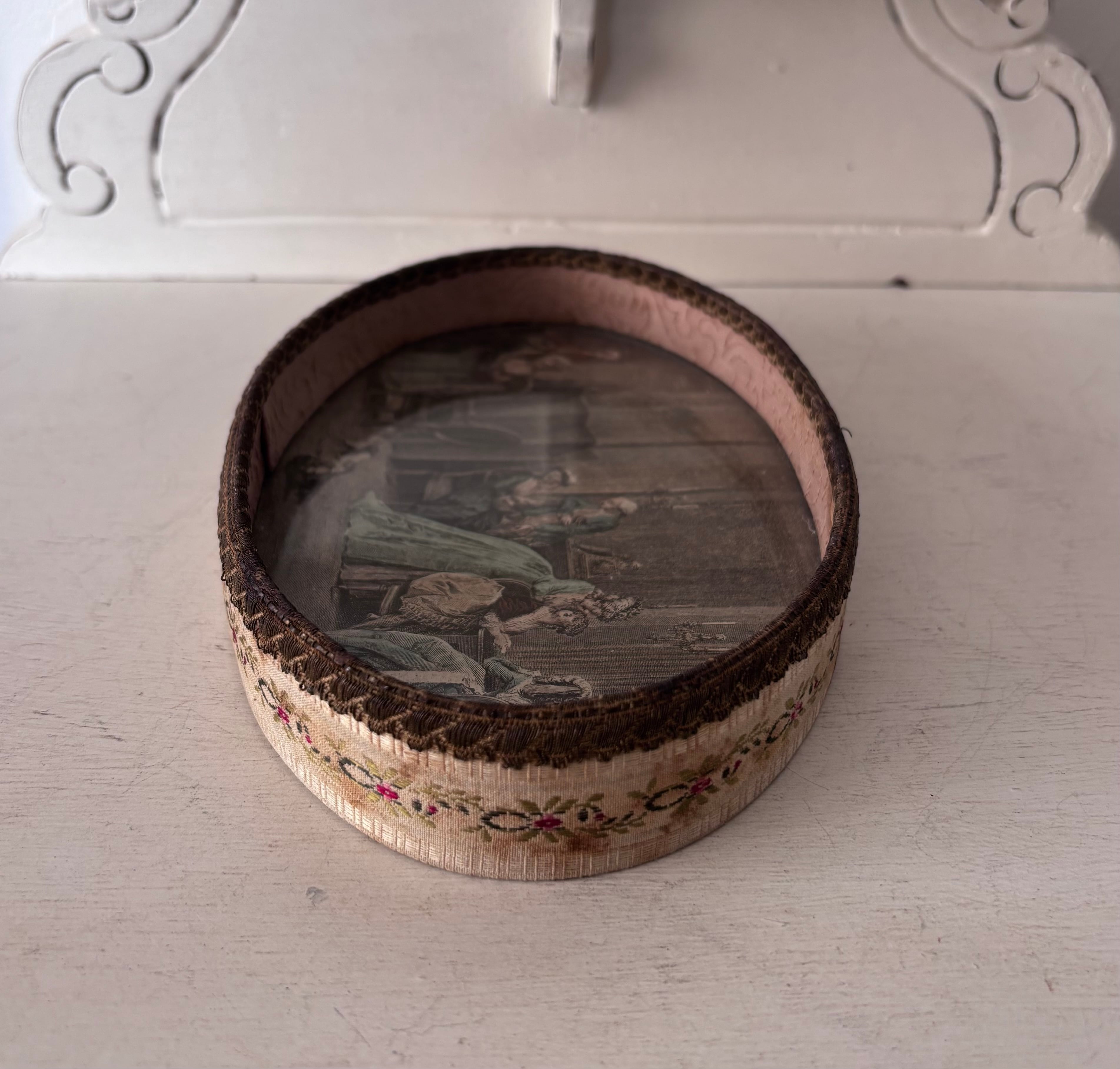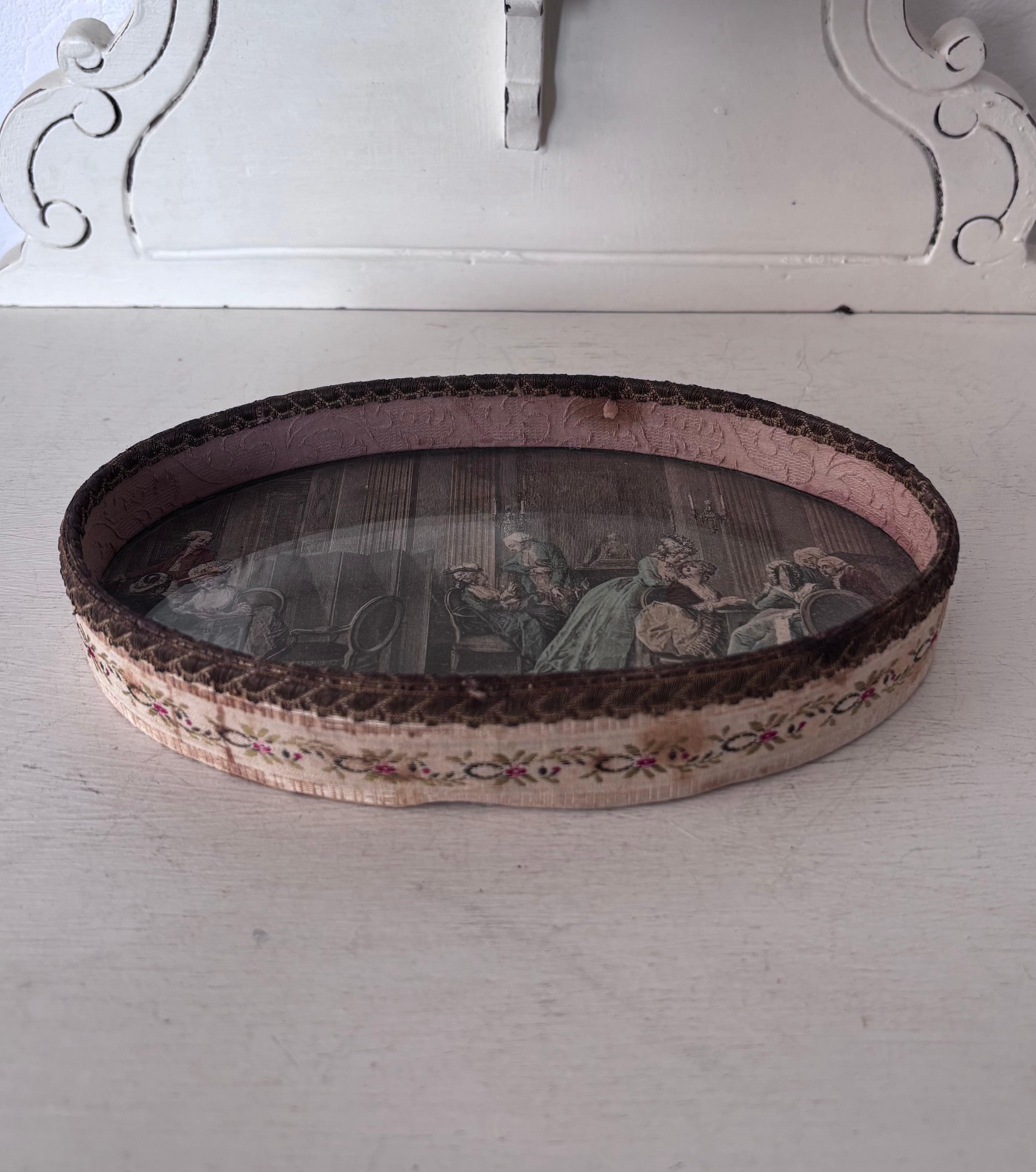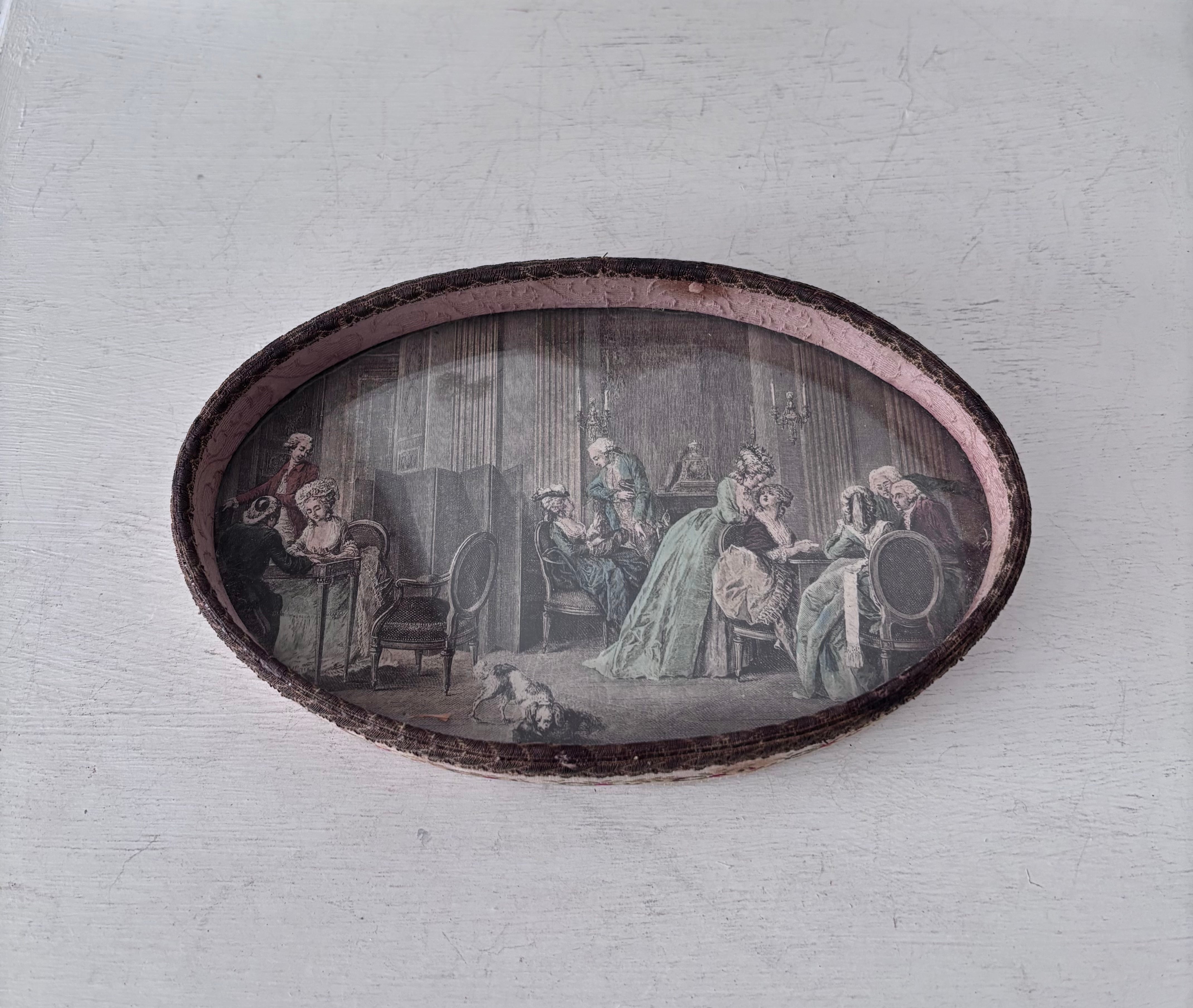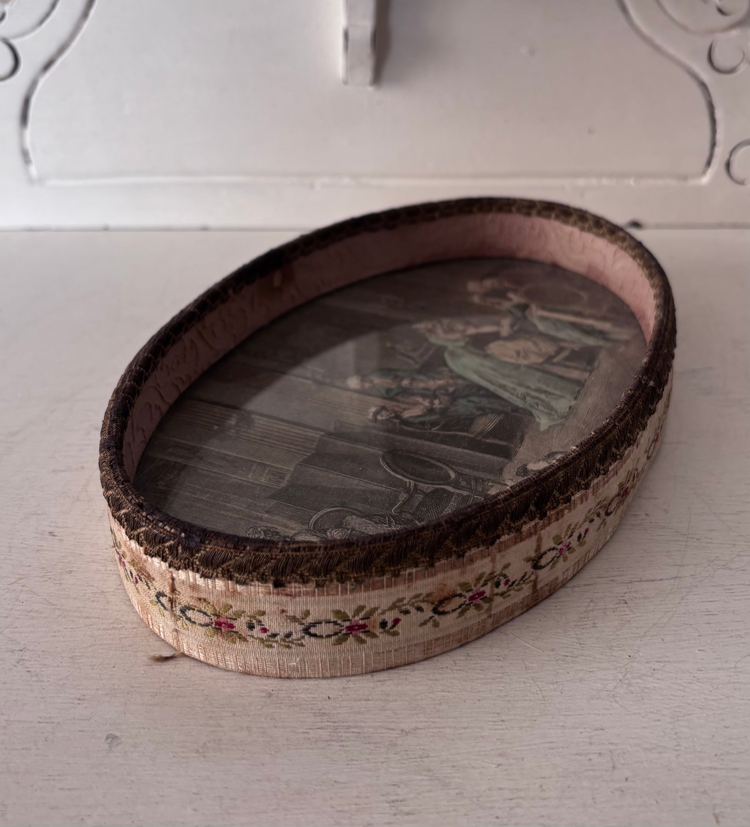 19世紀末〜20世紀初頭頃のフランスアンティーク、版画絵柄が美しい布張りオーバルトレイです。