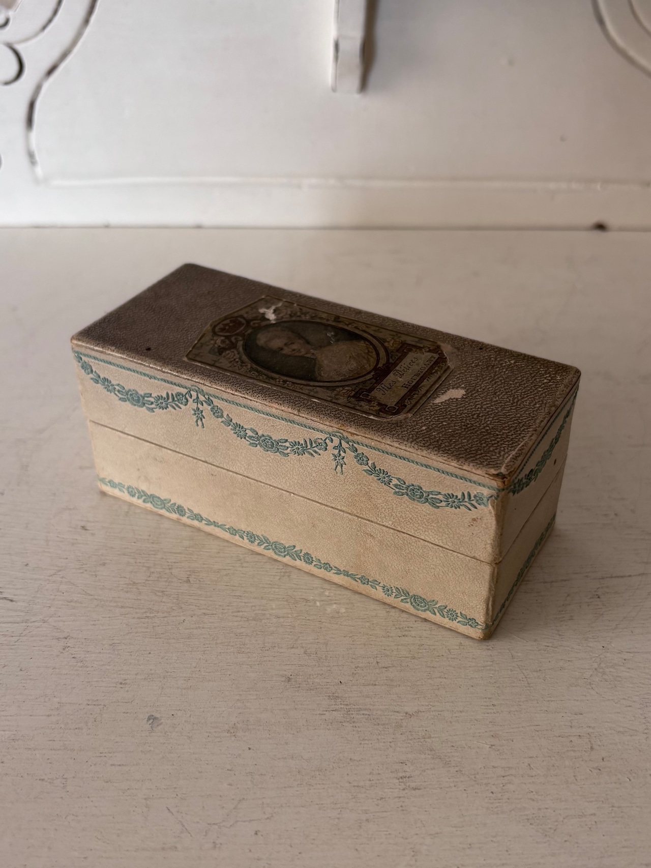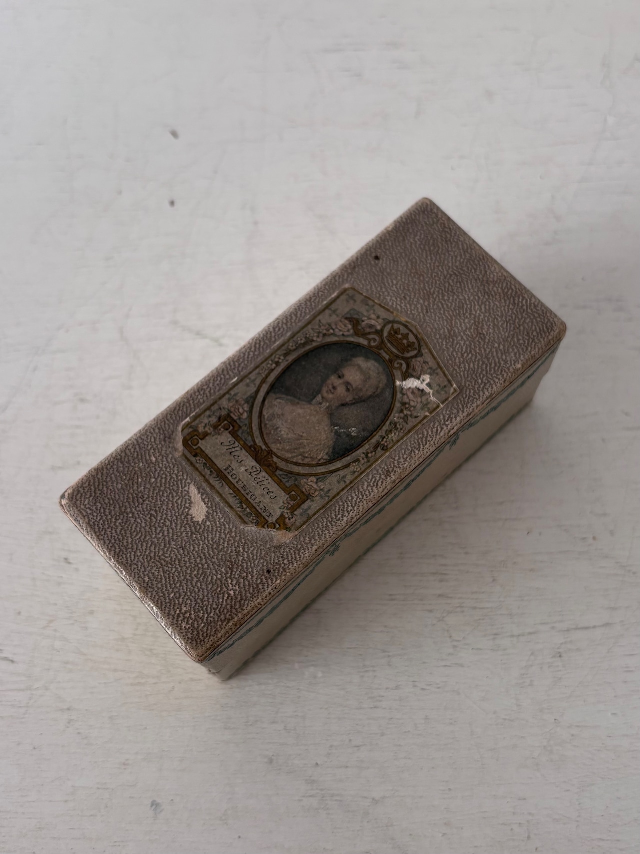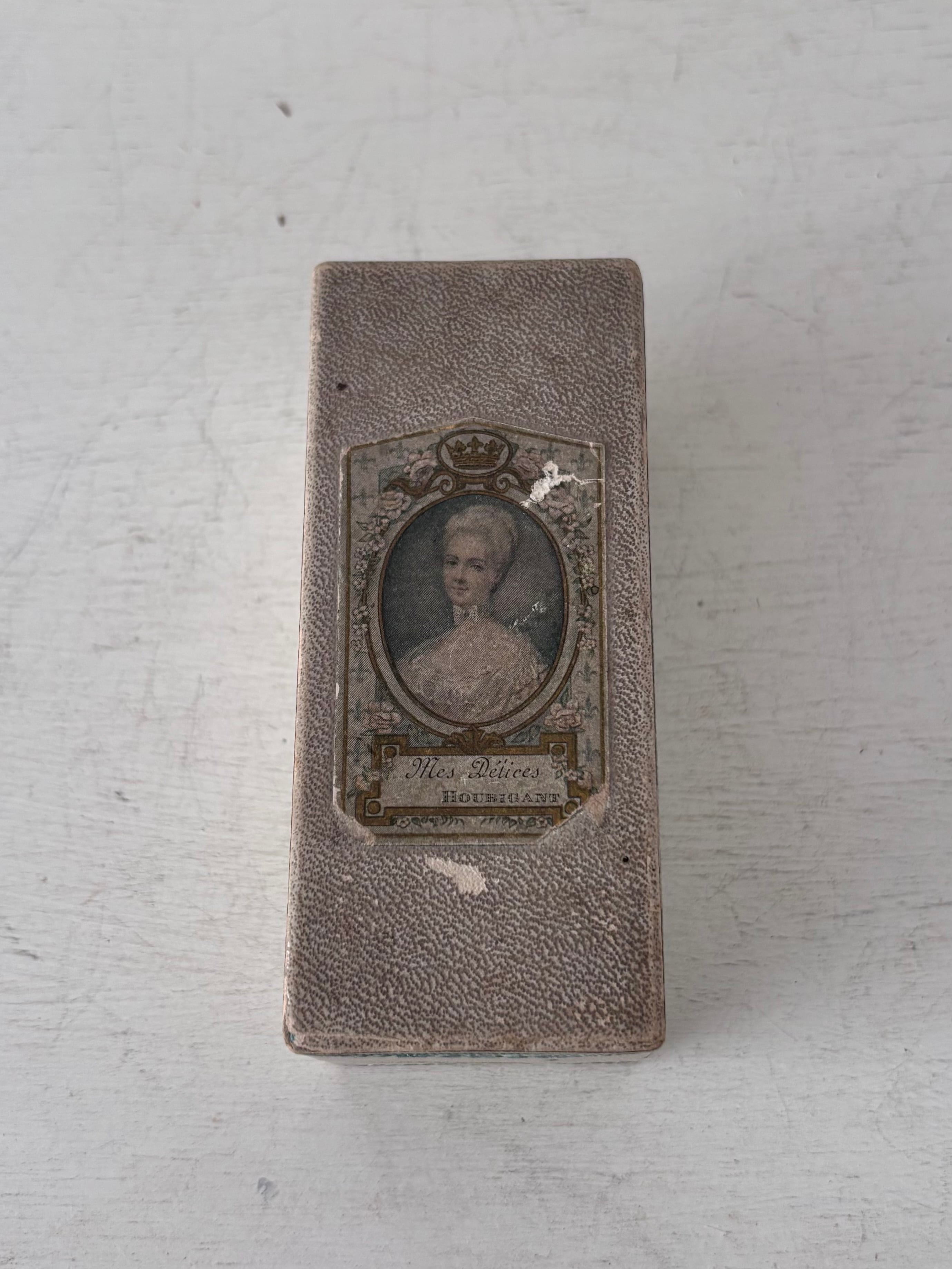 蓋の中央には、王冠モチーフに囲まれた貴婦人の肖像画が配され、水色のガーランド装飾が、箱全体をやさしく縁取っています。「Mes Délices(私の喜び)」という名前の通り、当時のフランスらしい優雅でロマンティックな雰囲気を感じさせます。