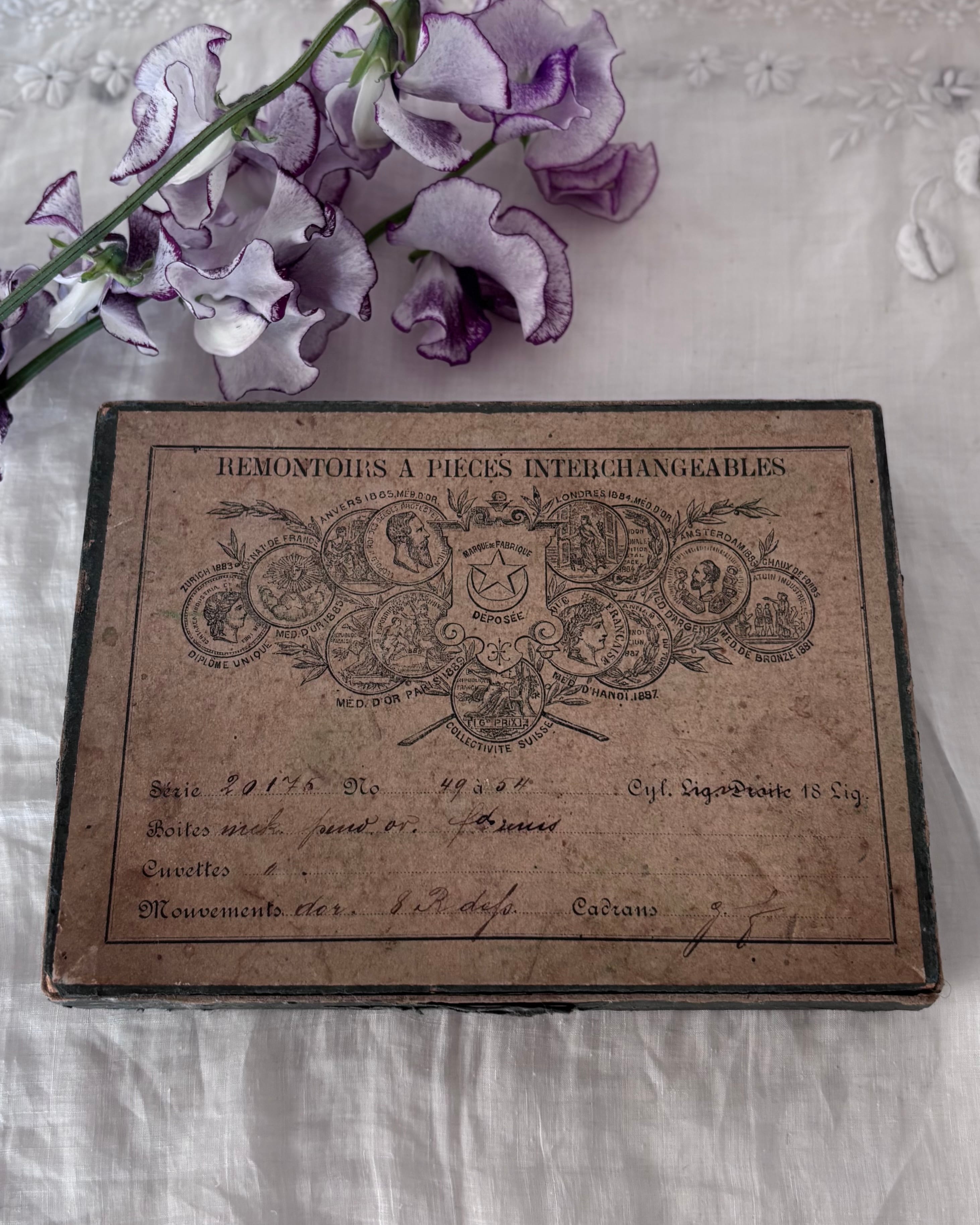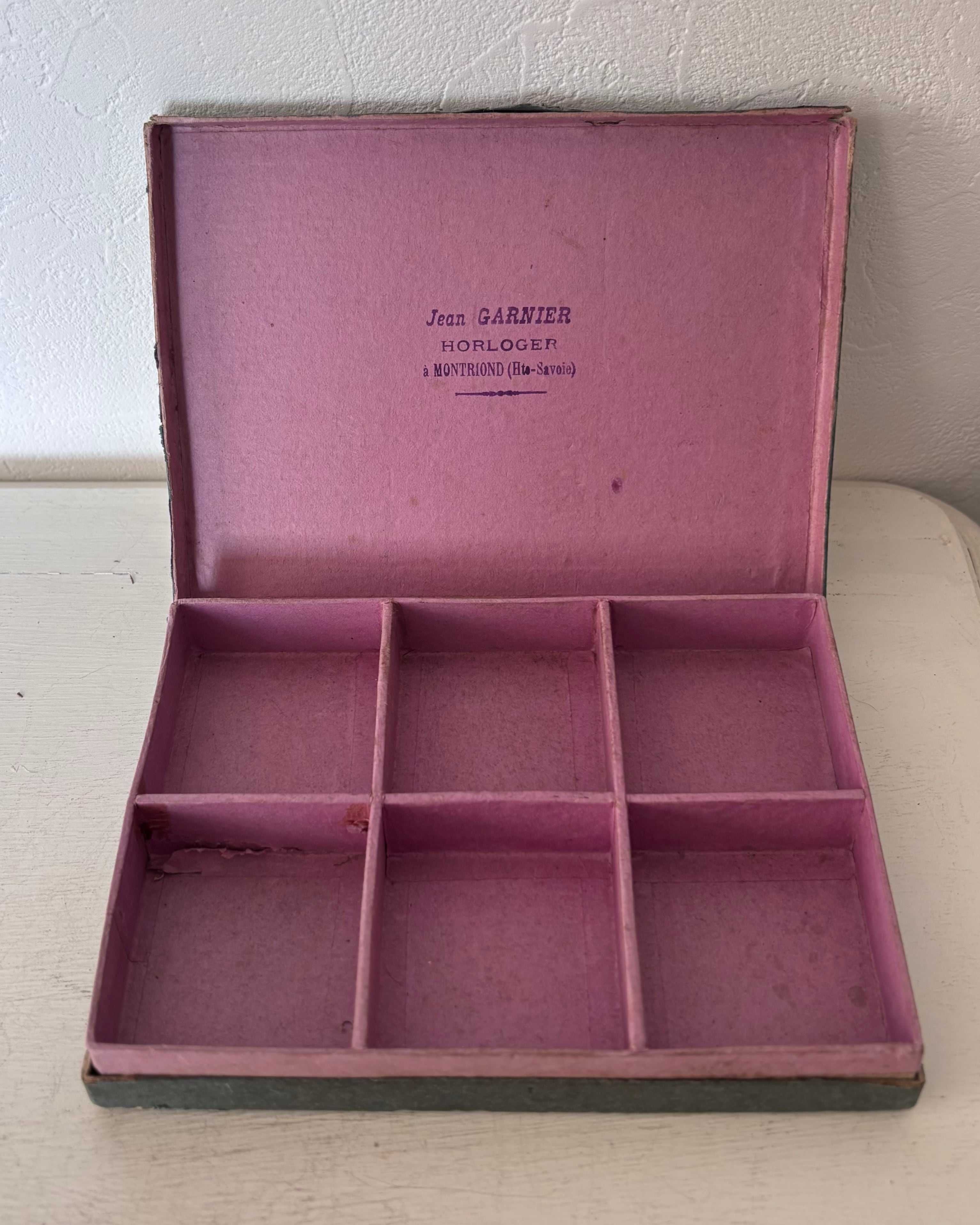 蓋の内側にはJean Garnier / Horloger à Montriond (Hta-Savoie)のスタンプが残っており、実際に時計修理や部品管理のために使われていたことがうかがえます。