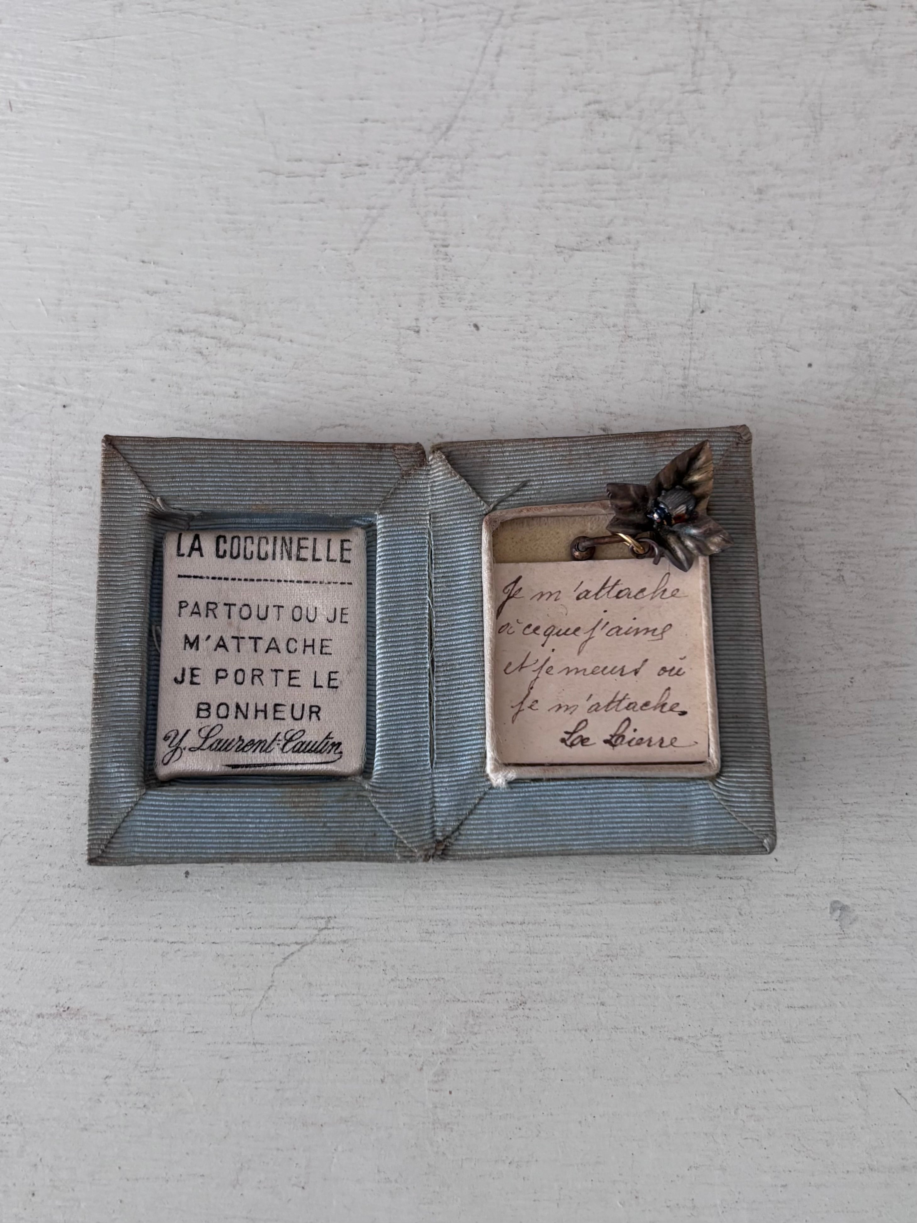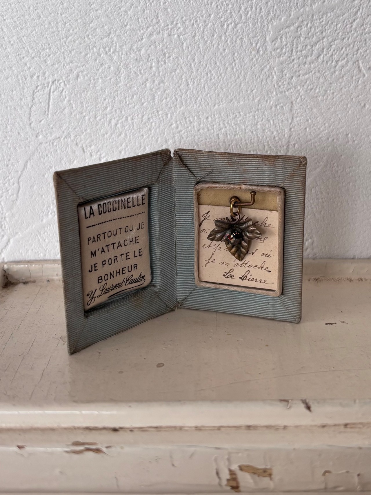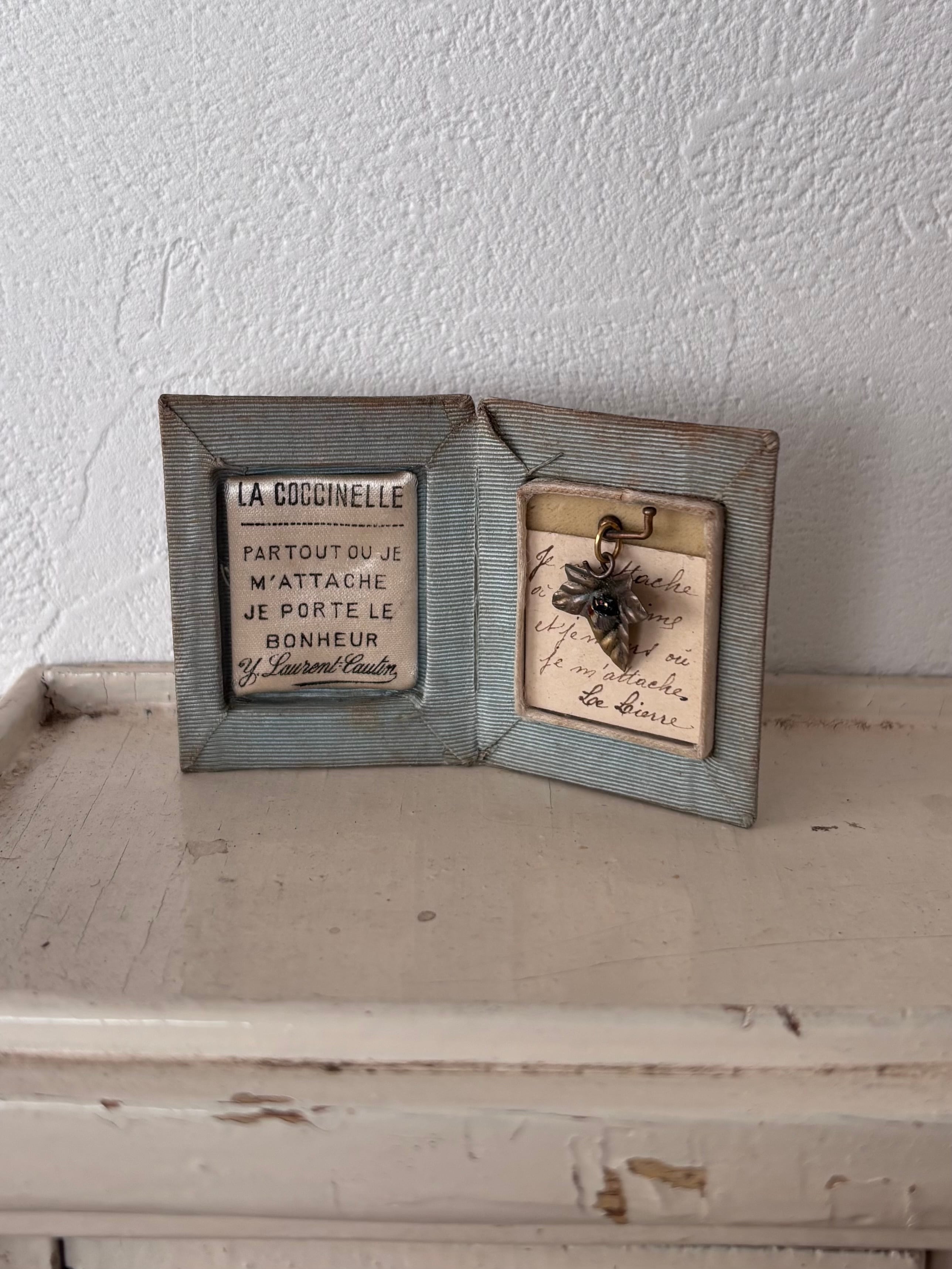 淡いブルーグレーの布張りが美しい、フランスの小さな二つ折りケースのお守りです。