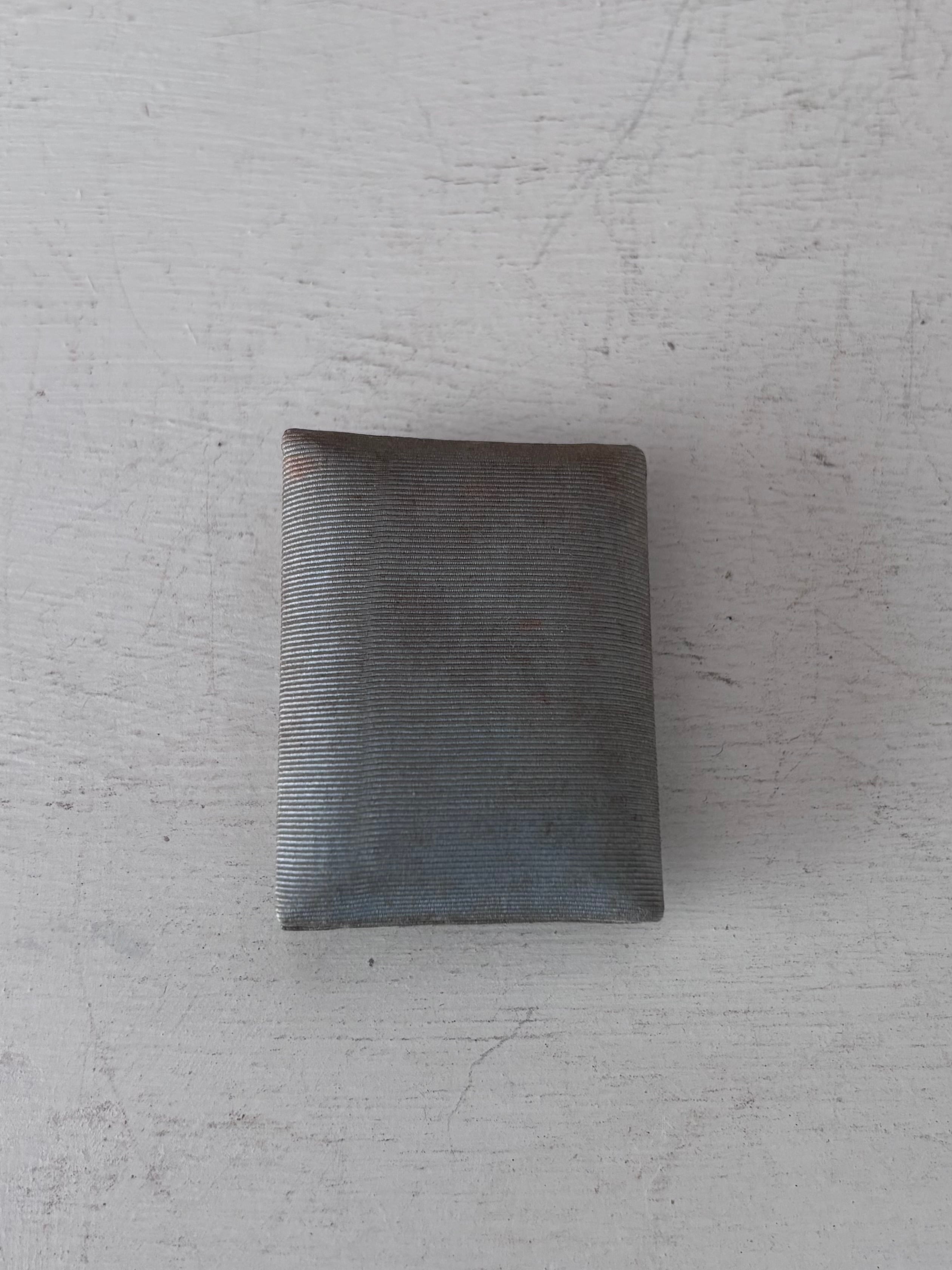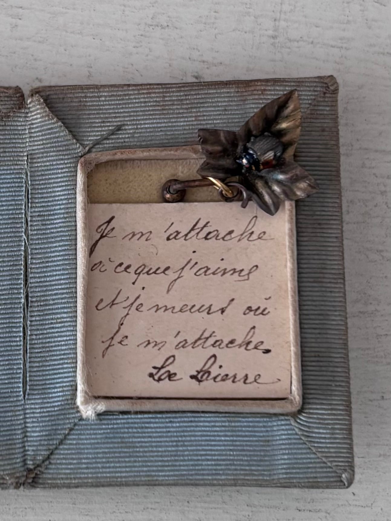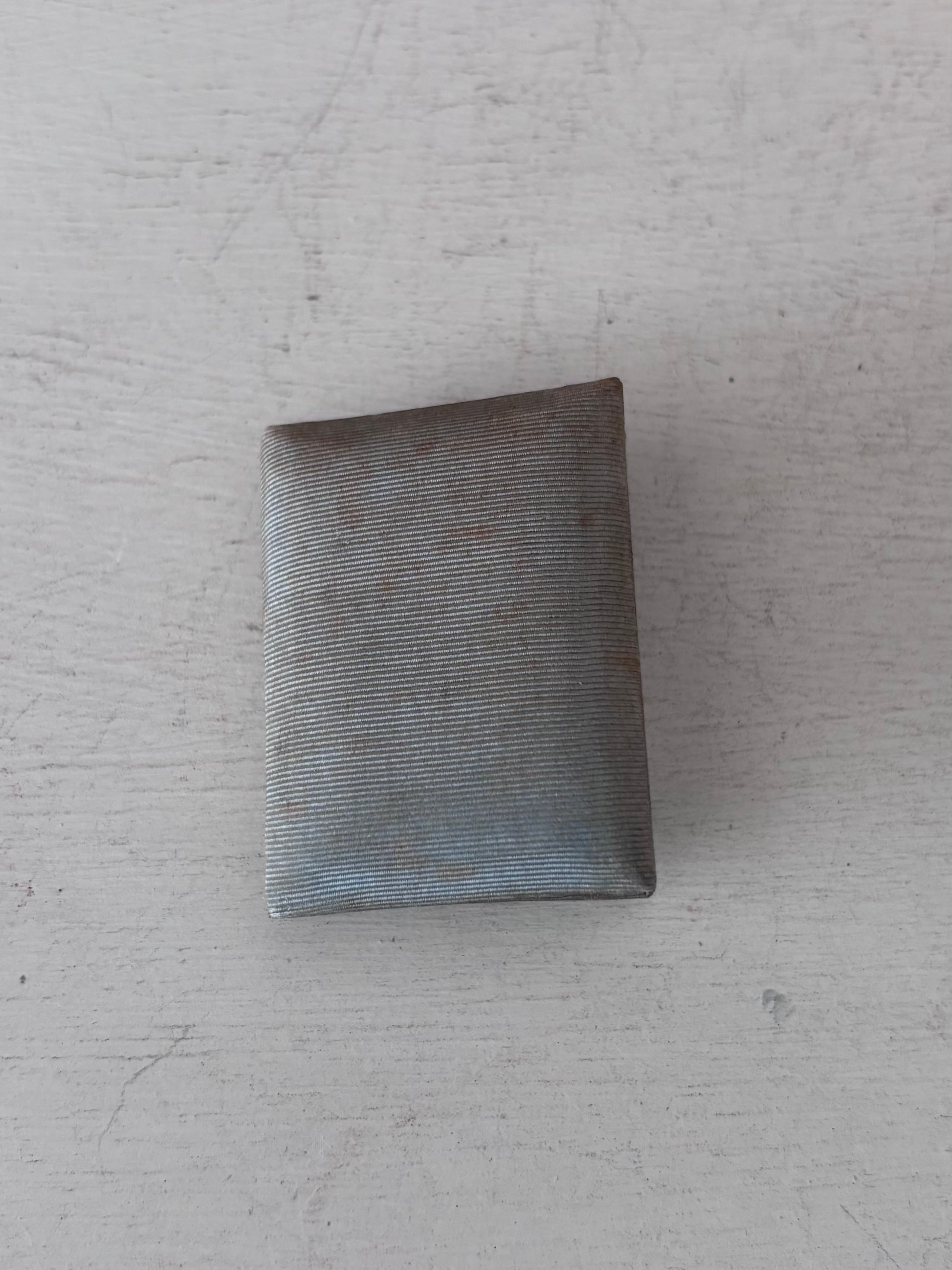 淡いブルーグレーの布張りが美しい、フランスの小さな二つ折りケースのお守りです。