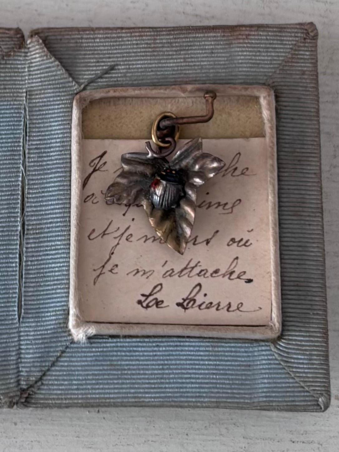 てんとう虫がとまる葉は、蔦(アイビー/lierre)。蔦は壁や木に絡みつきながら伸びることから、「離れない愛」「永く続く絆」「変わらぬ想い」を象徴する植物です。