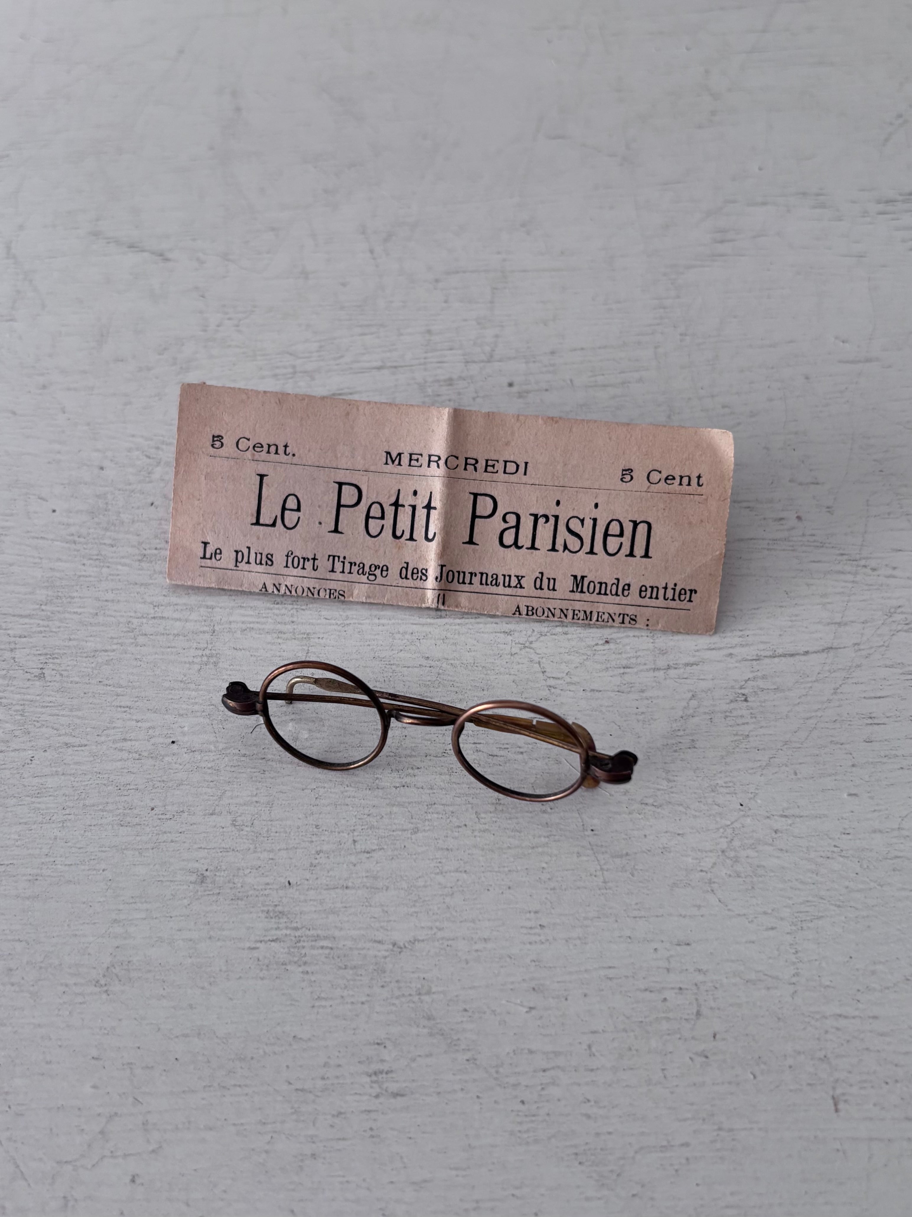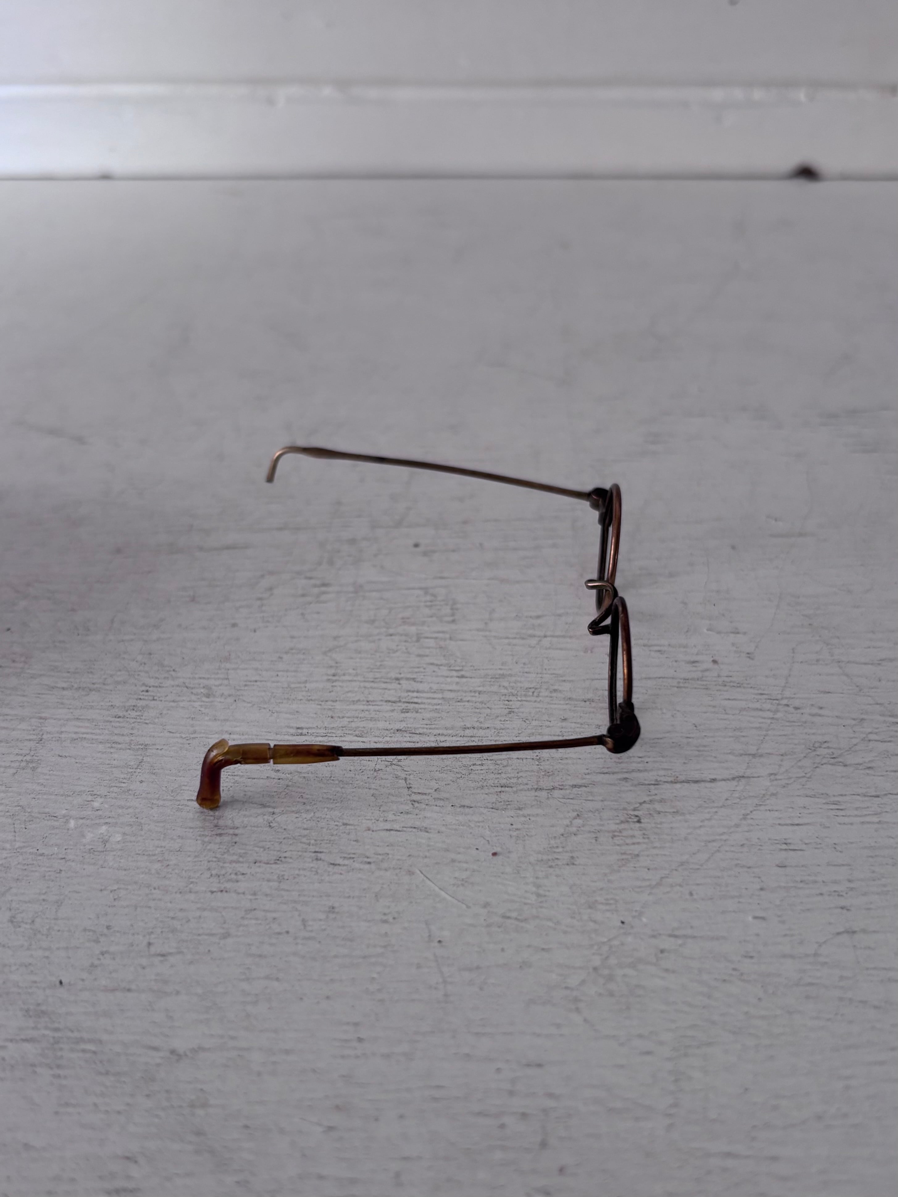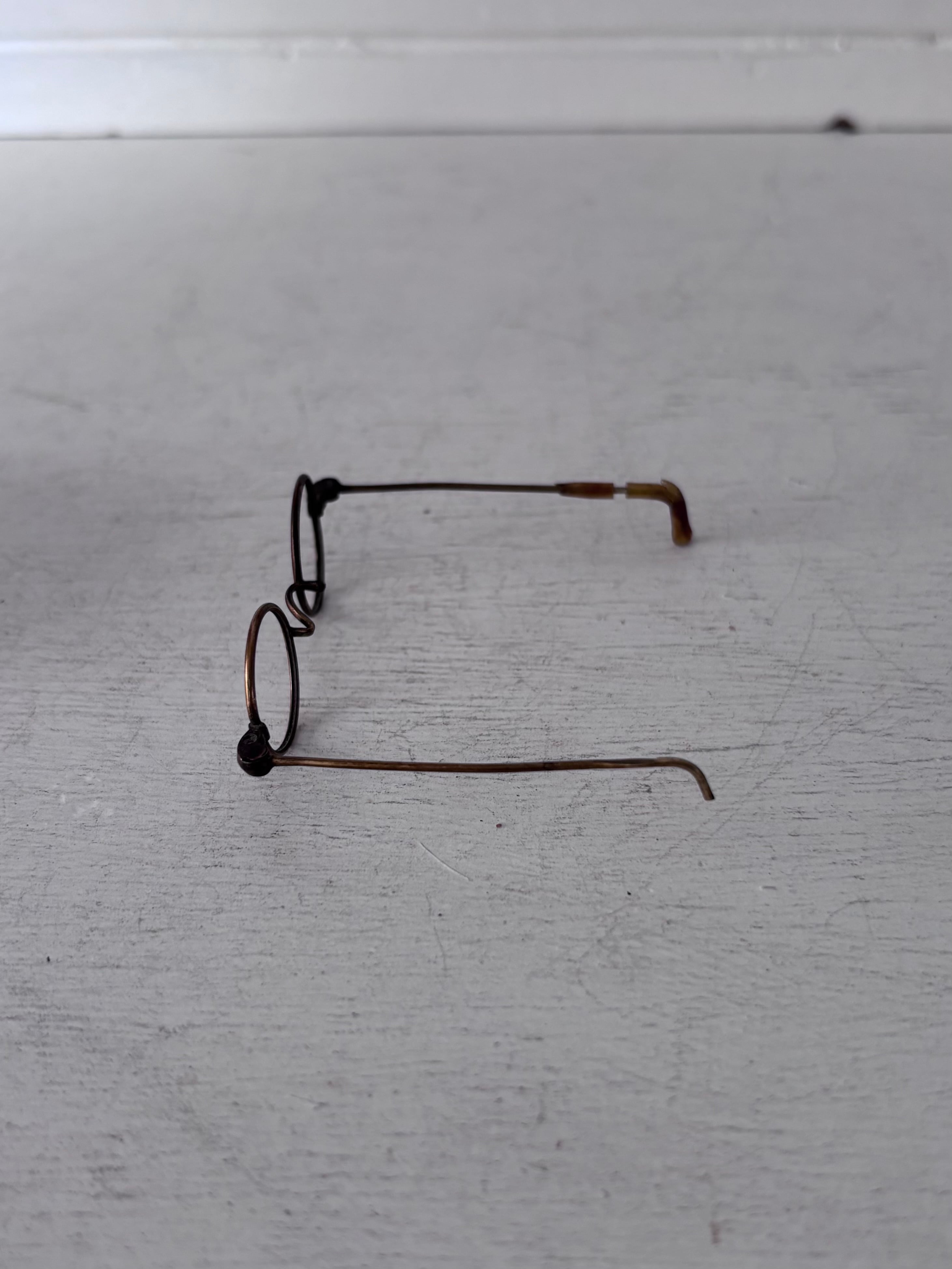 眼鏡は幅約5.5cmと小さく、ガラスは入っていませんが、細いワイヤーフレームと、耳に沿うように強くカーブしたテンプルが特徴で、当時ならではの古い構造です。