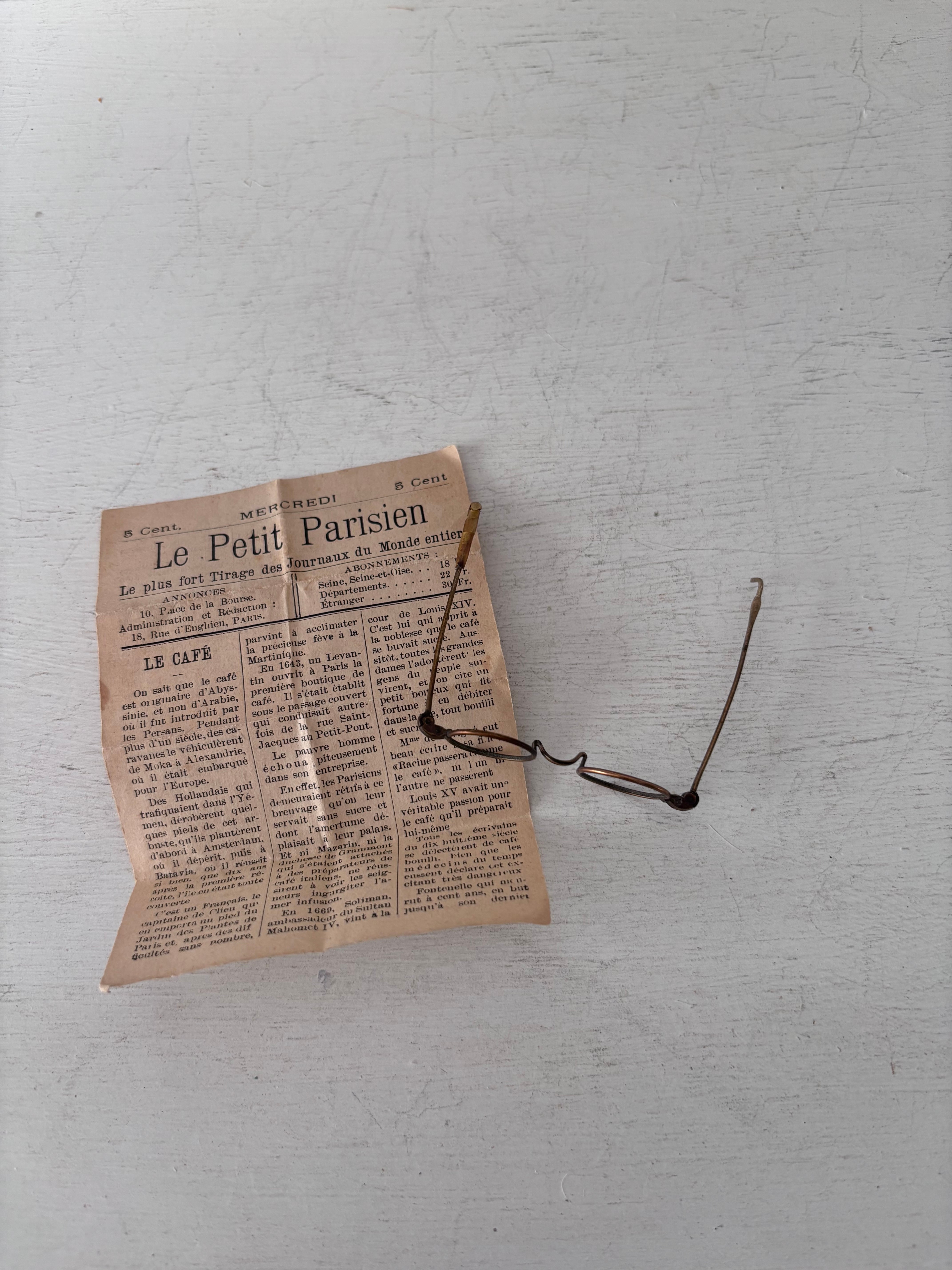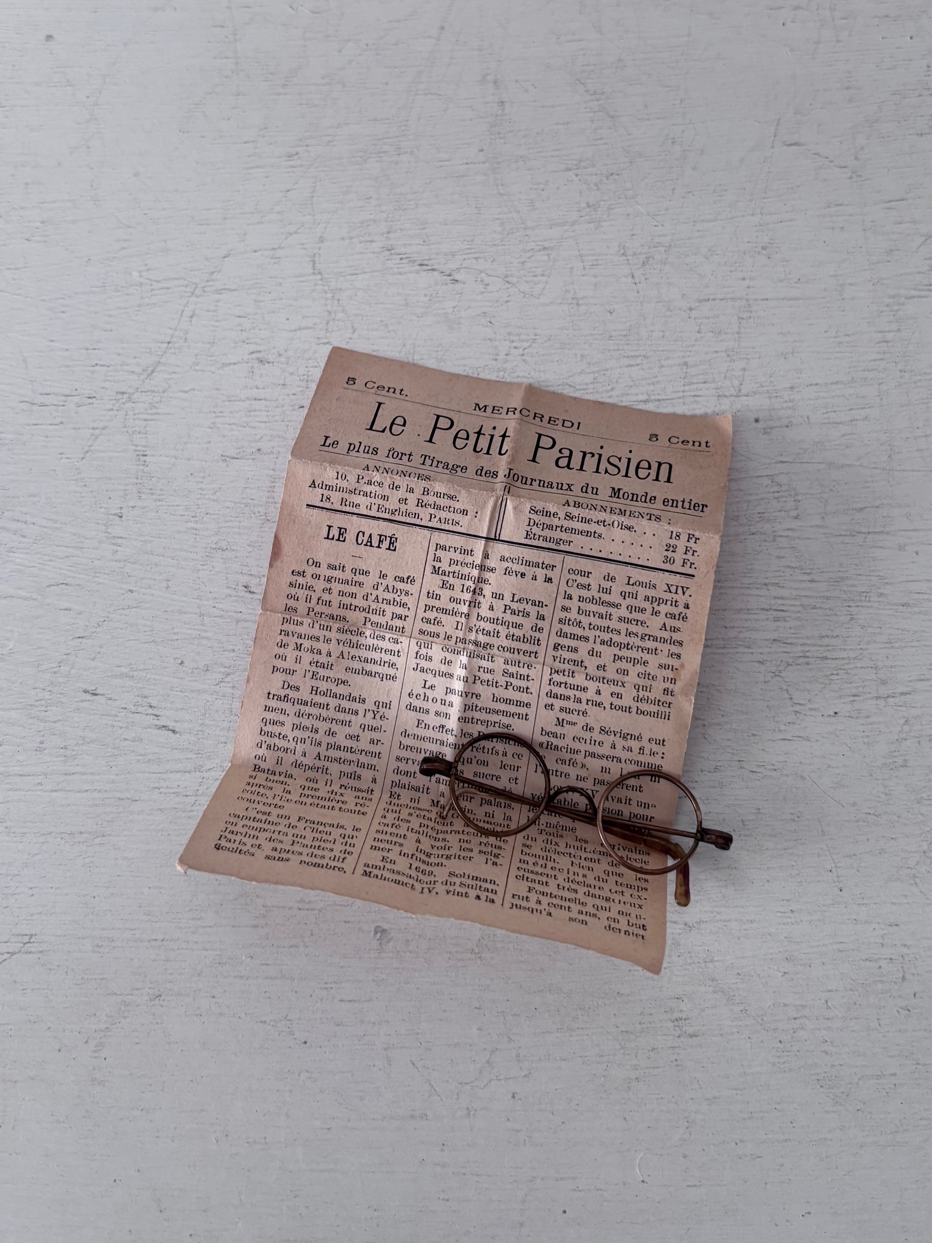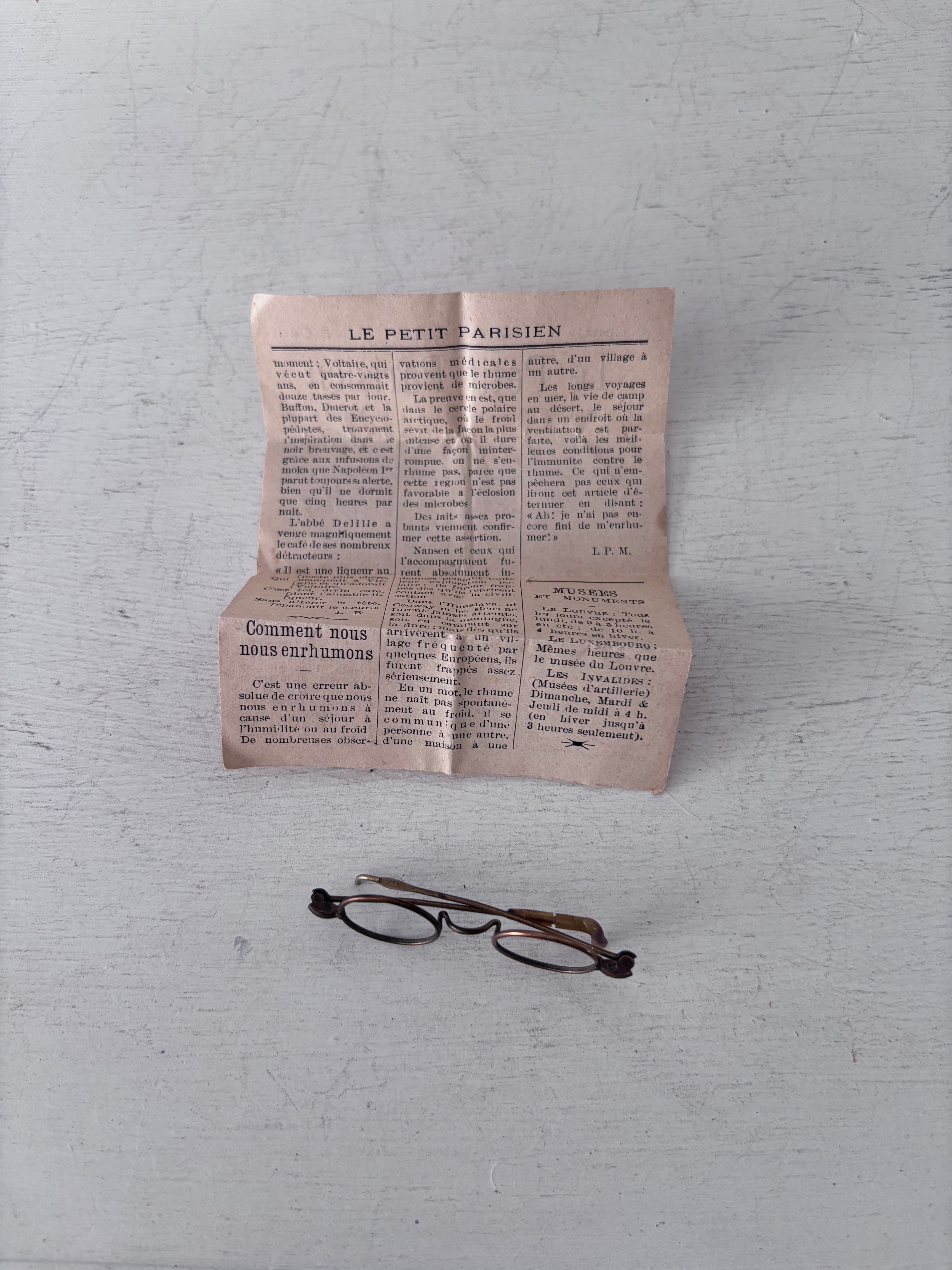新聞紙は、フランスの大衆紙 Le Petit Parisien MERCREDI(水曜日発行)の紙面で、活版印刷による文字組みや紙質から、20世紀初頭の雰囲気を残しています。