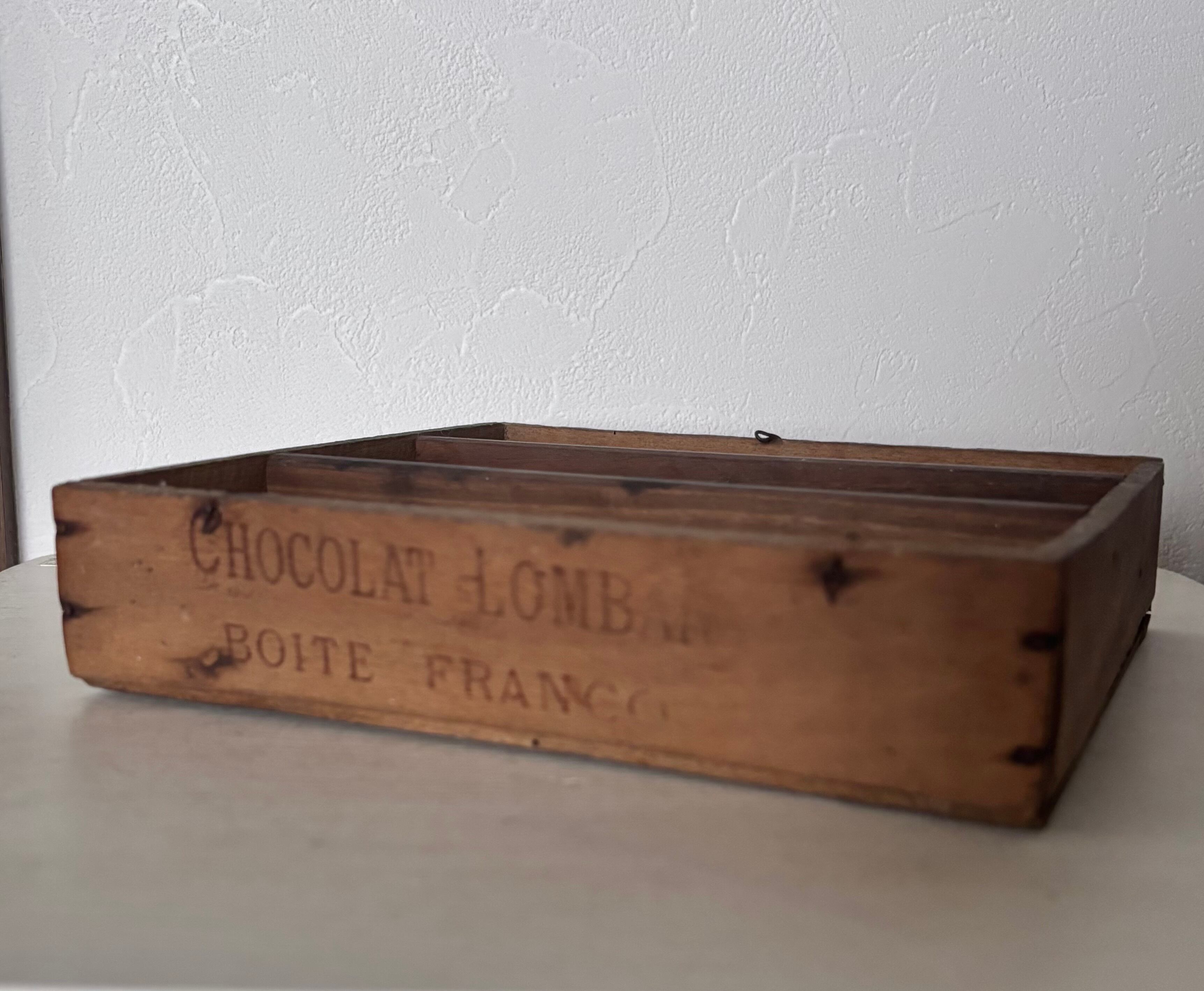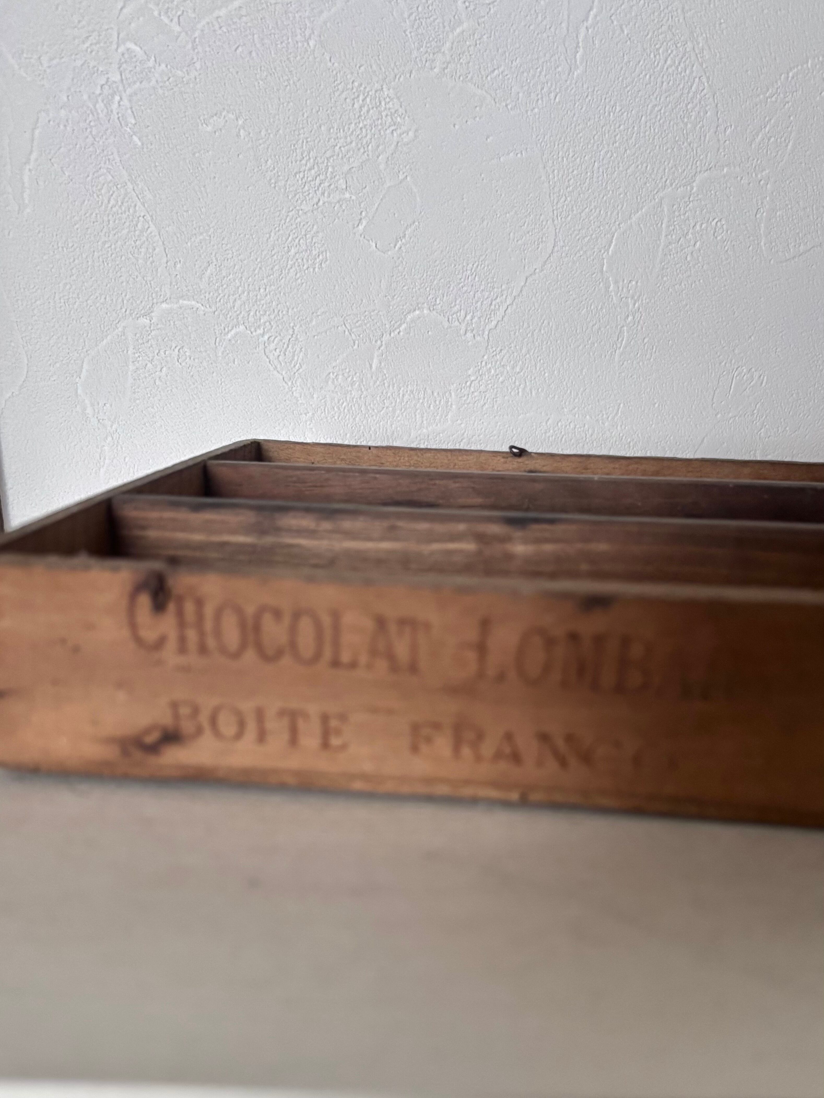 CHOCOLAT LOMBAR BOITE FRANCE (焼き印表記) の名が残る、業務用として使われていた木製ボックスで、焼き印や内側のシミ、木の表情から、工房で使われていた頃の手仕事の気配が、今も残されています。