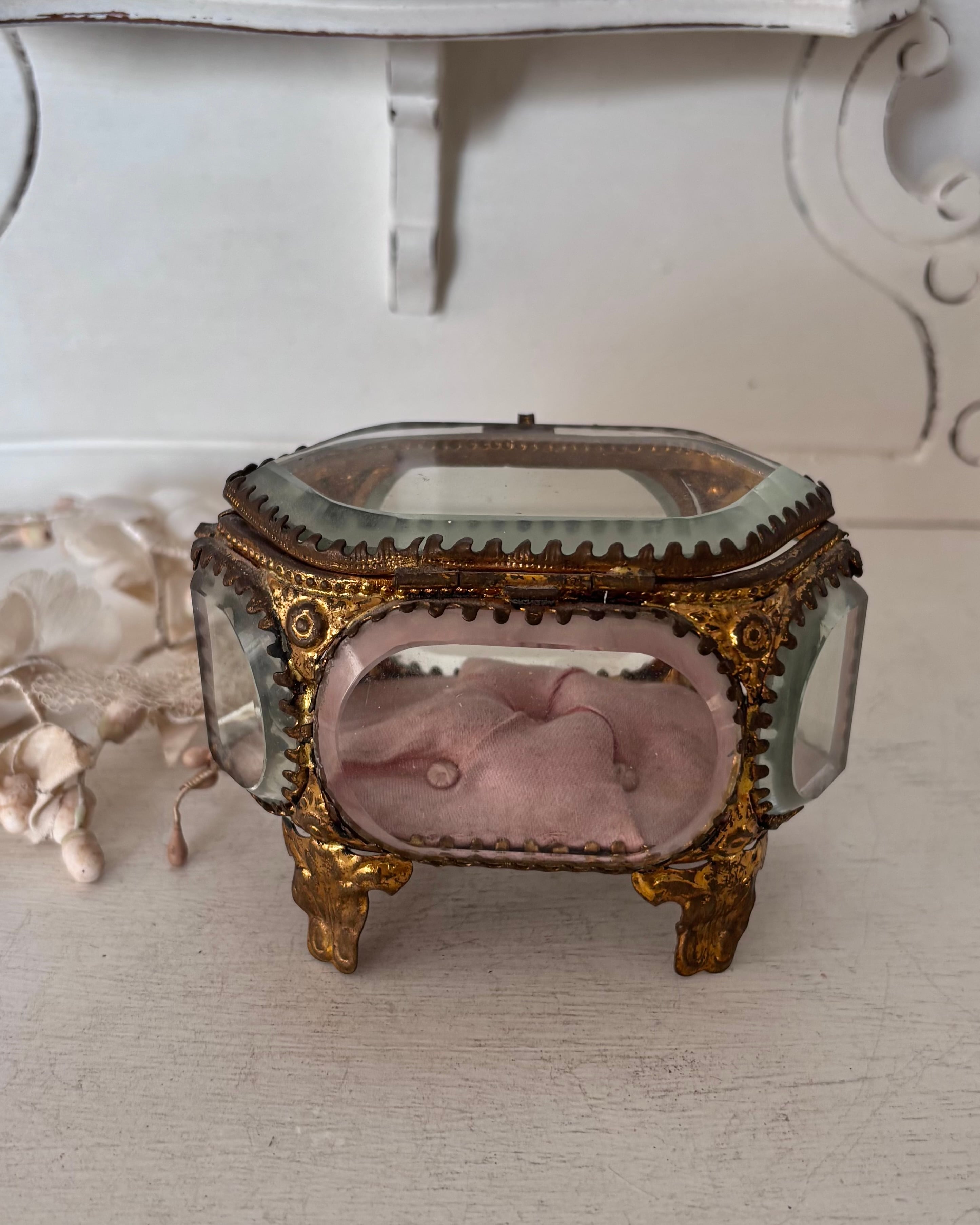面取りガラスと繊細な金色フレームで仕立てられた、ガラスのジュエリーケース。クラシカルな脚のフォルムとやわらかなピンクのクッションが、ロマンティックな雰囲気です。