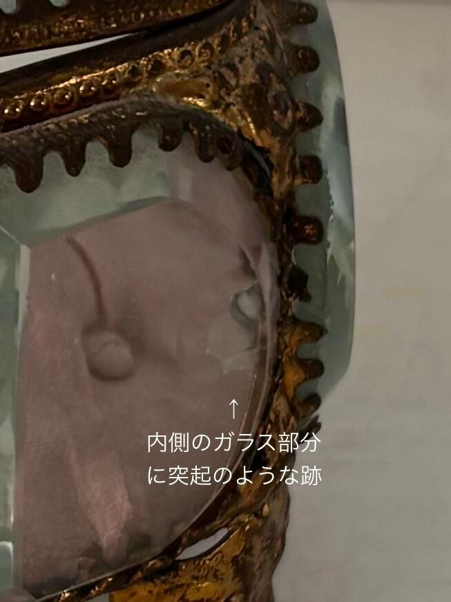 経年によりガラスに小傷、フレームには歪み、変色や金色の摩耗、細かな擦れが見られます。また内側のクッションには汚れやわずかなヨレがあり、長い年月を経たアンティークならではの表情が見られますが、破れなど大きな破損はなく、時を重ねた風合いとしてお楽しみいただけるコンディションです。