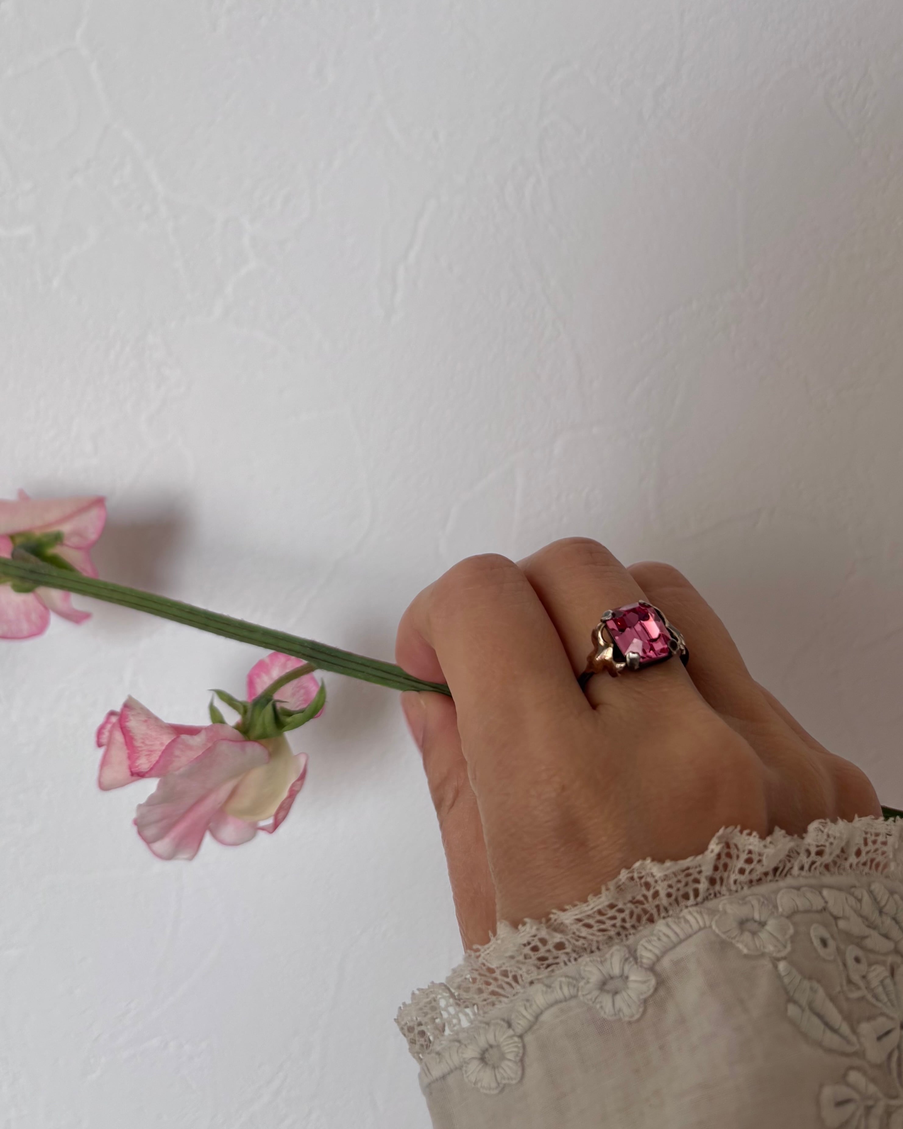 大粒なローズピンクのフレンチラインストーンが印象的で、光の角度によって表情を変える華やかなリングです。