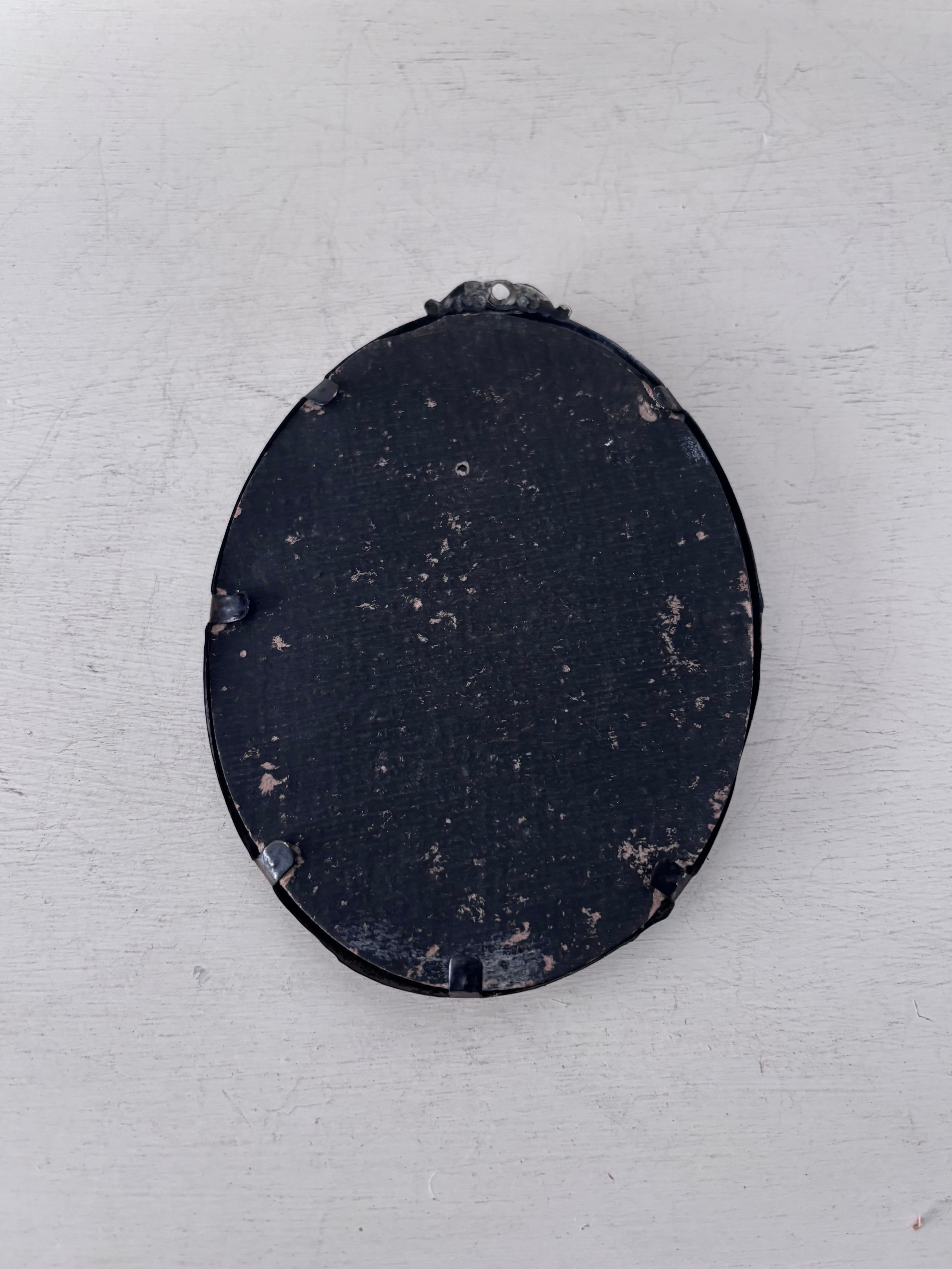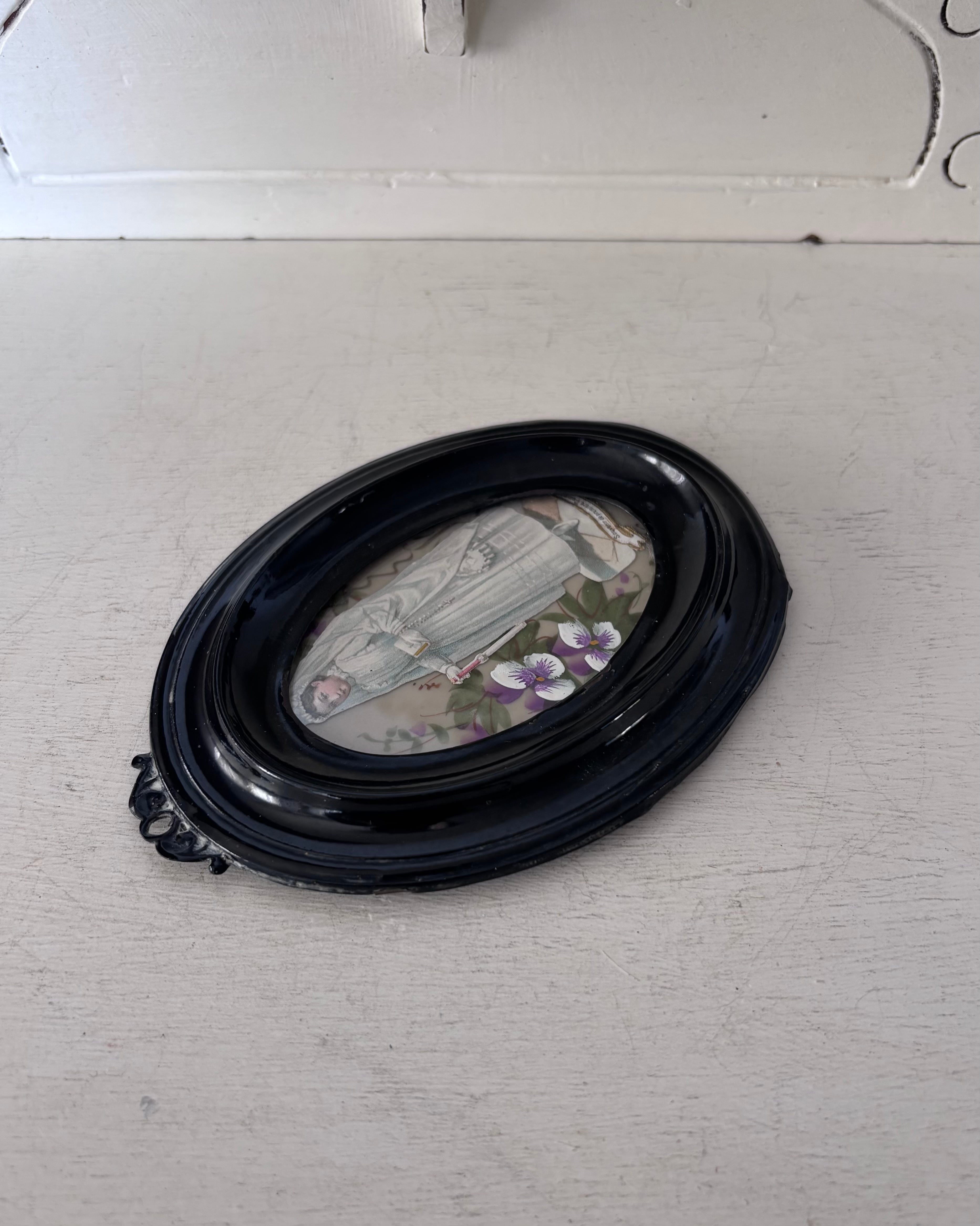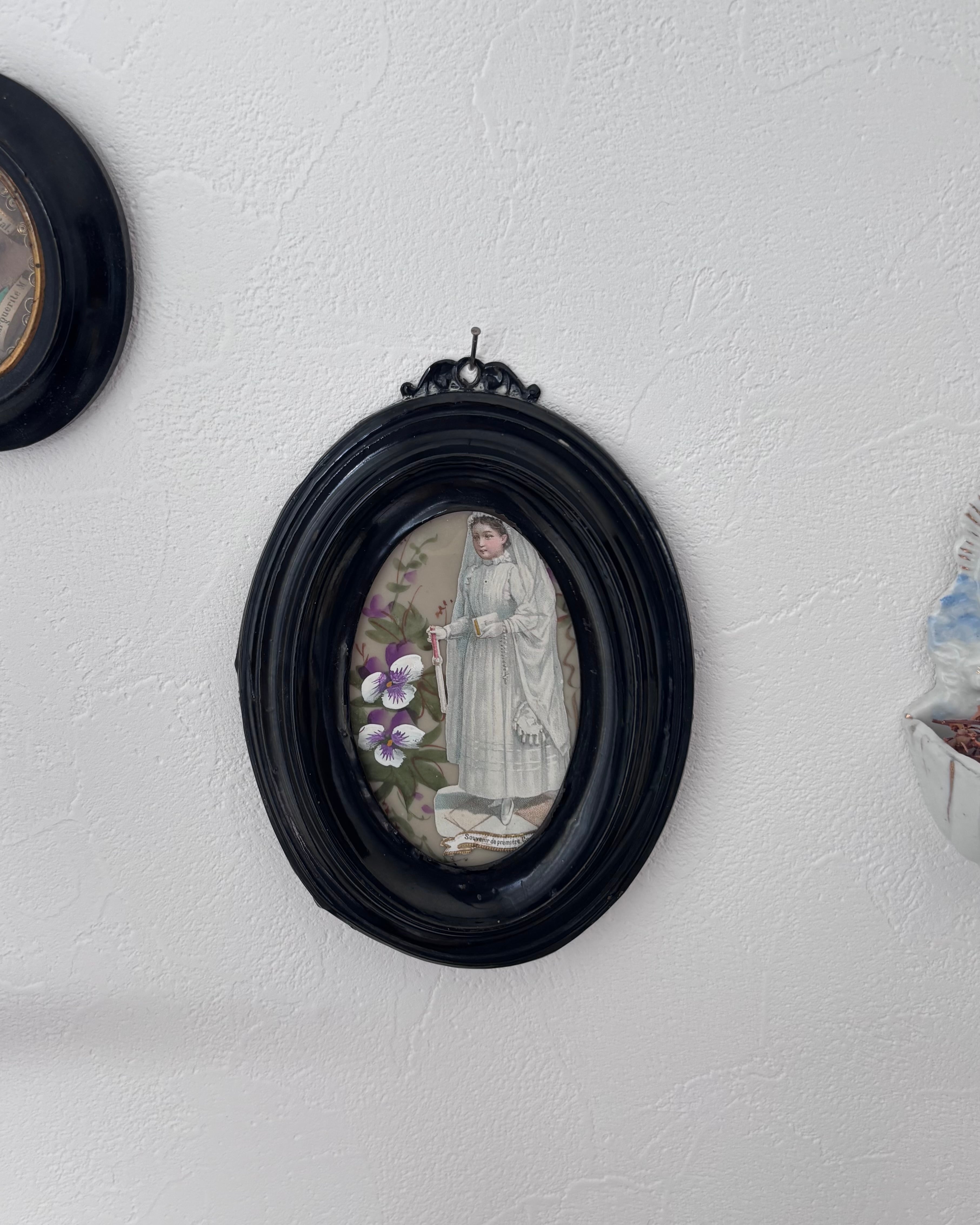 立体的な黒いフレームは20世紀初頭の初期プラスチックの樹脂系素材。深みのあるノワールカラーと厚みのある立体的な縁取りが、まるで小さな祭壇のように中央のカードを引き立てています。軽やかな素材ながら、側面には段差のあるモールディングが施され、陰影の美しい立体感を感じさせます。また装飾性のあるトップの小さなハンギングループがクラシカルな雰囲気です。