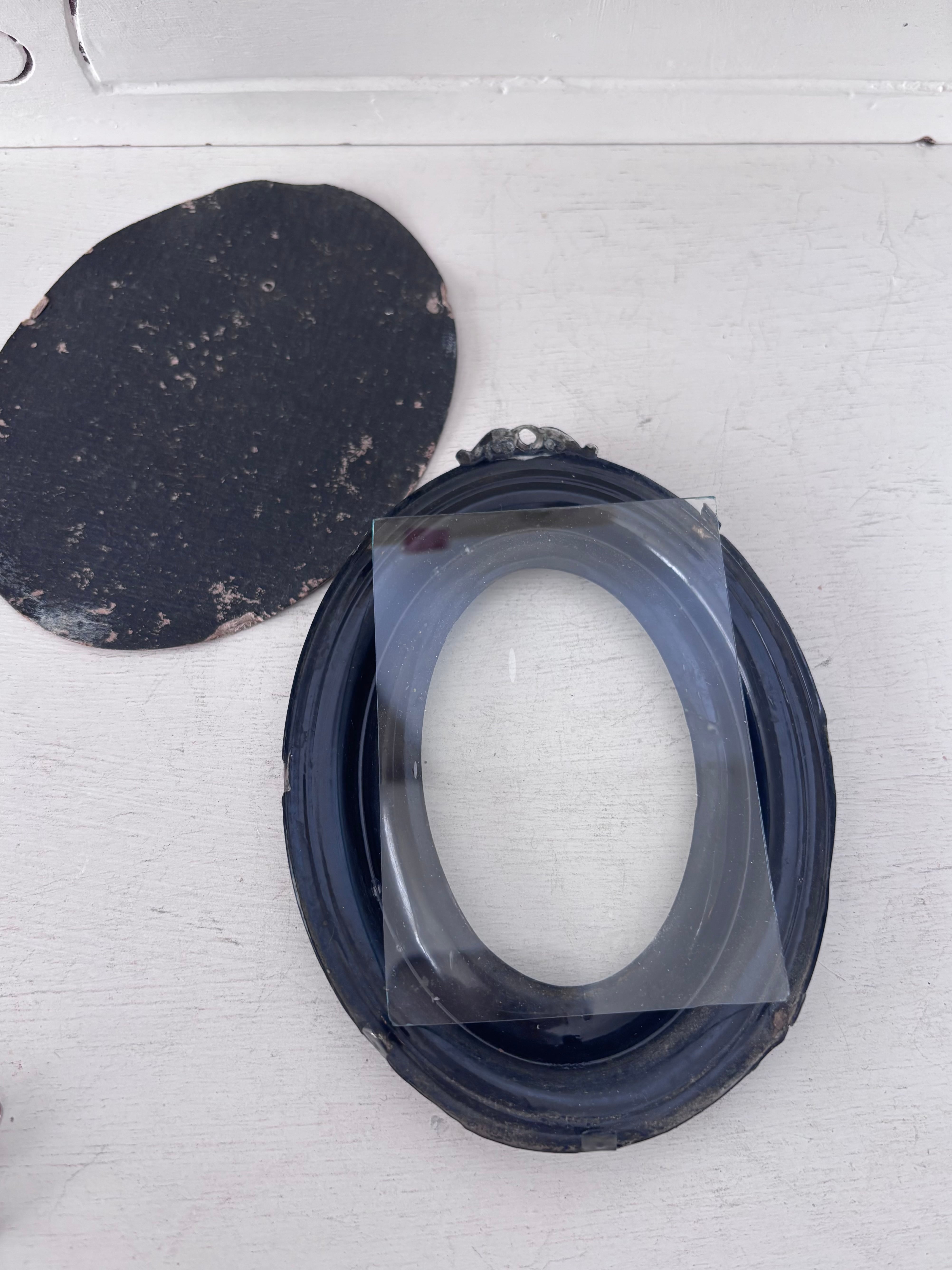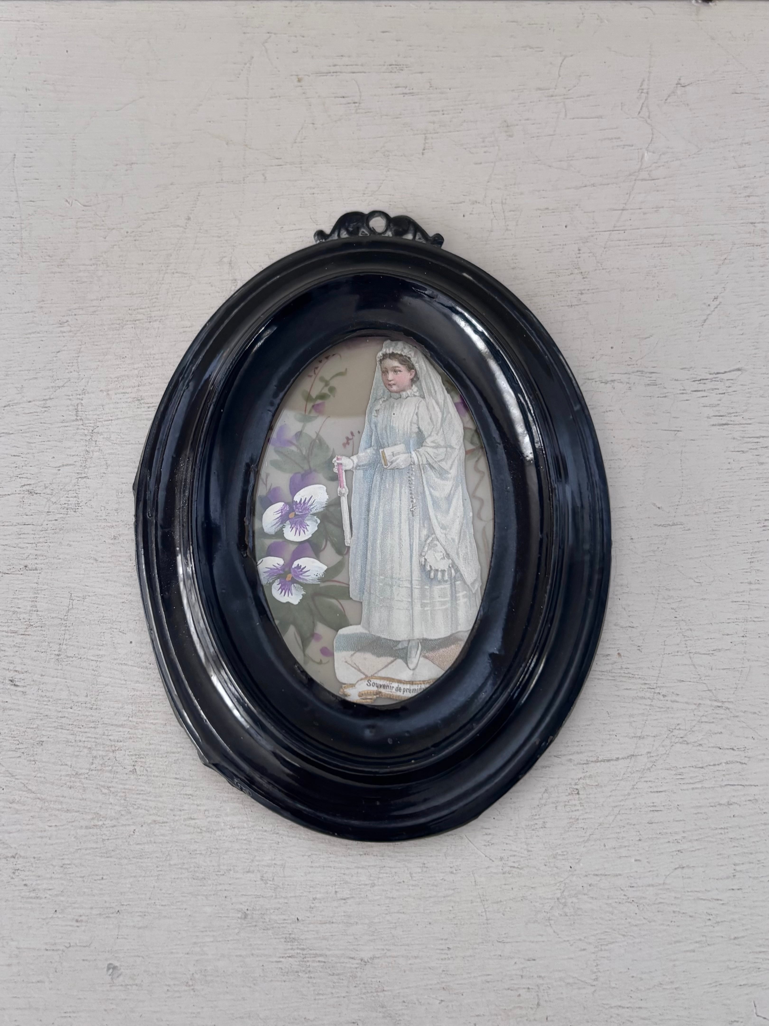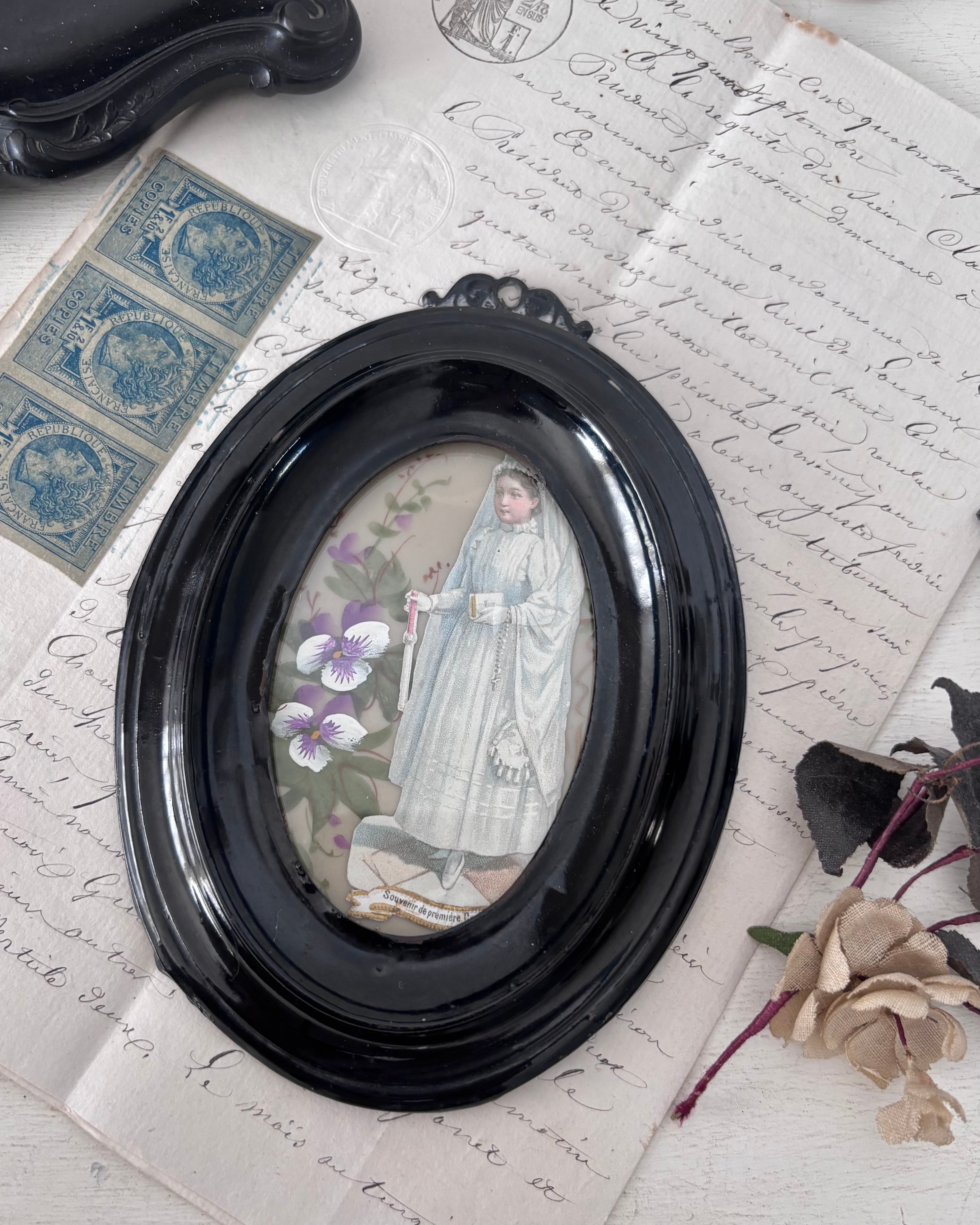 立体的な黒いフレームは20世紀初頭の初期プラスチックの樹脂系素材。深みのあるノワールカラーと厚みのある立体的な縁取りが、まるで小さな祭壇のように中央のカードを引き立てています。軽やかな素材ながら、側面には段差のあるモールディングが施され、陰影の美しい立体感を感じさせます。また装飾性のあるトップの小さなハンギングループがクラシカルな雰囲気です。
