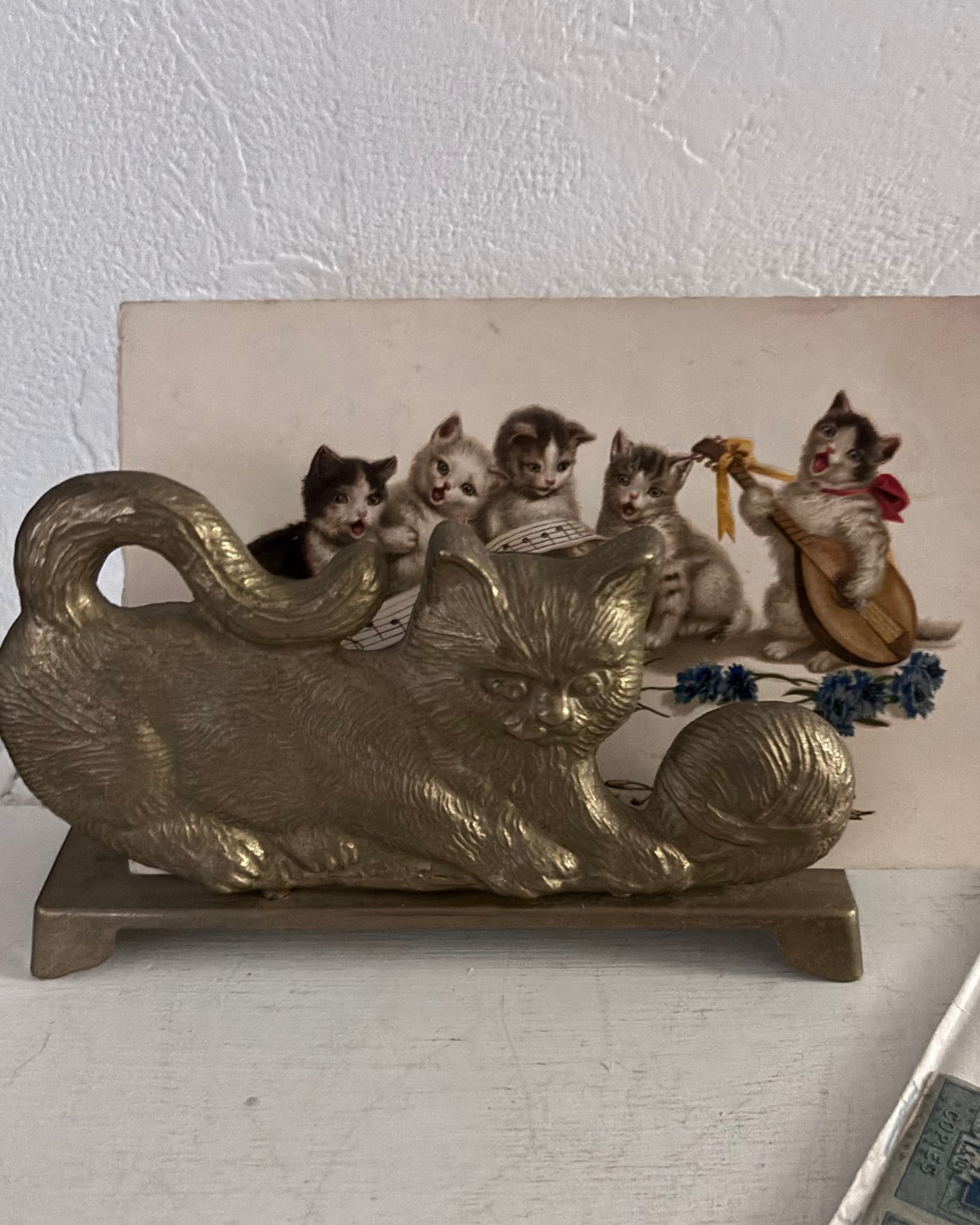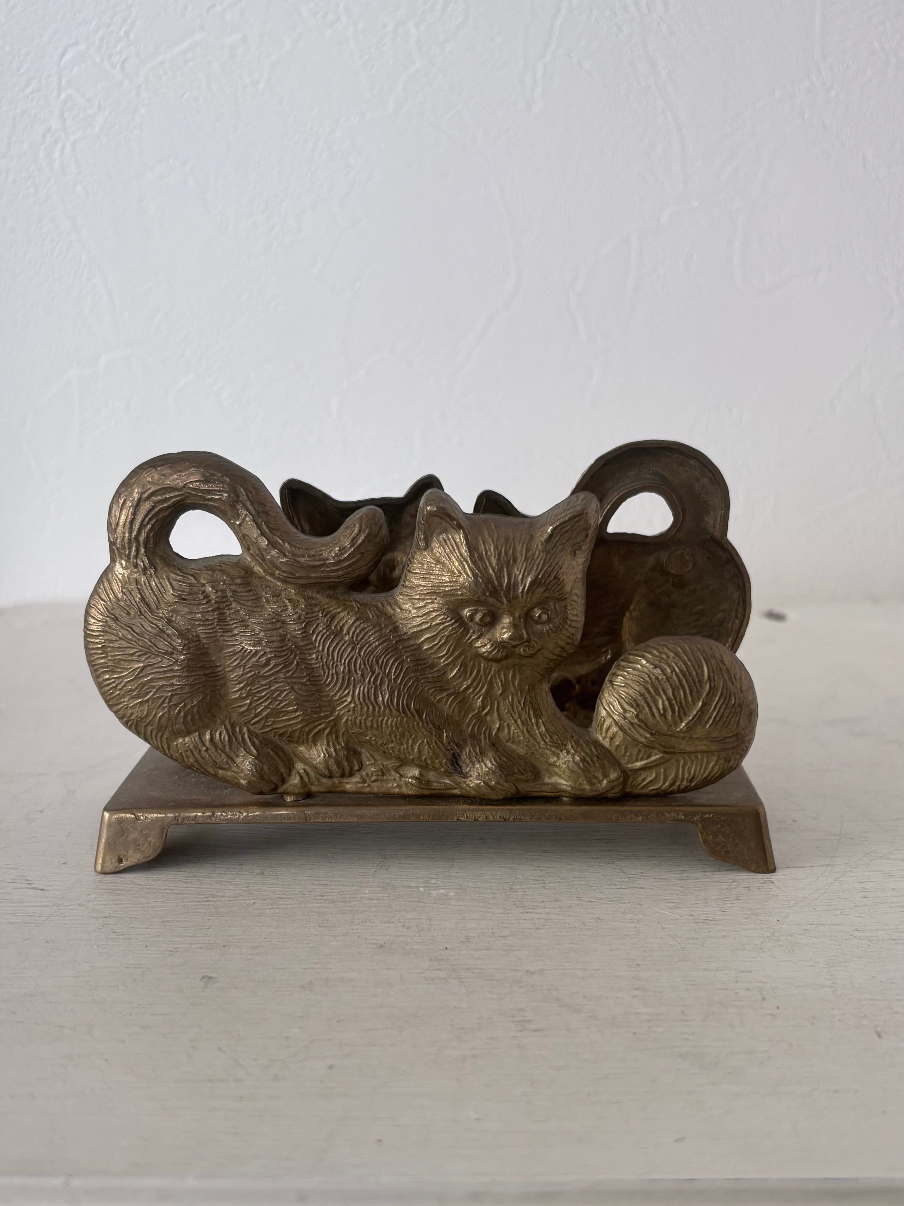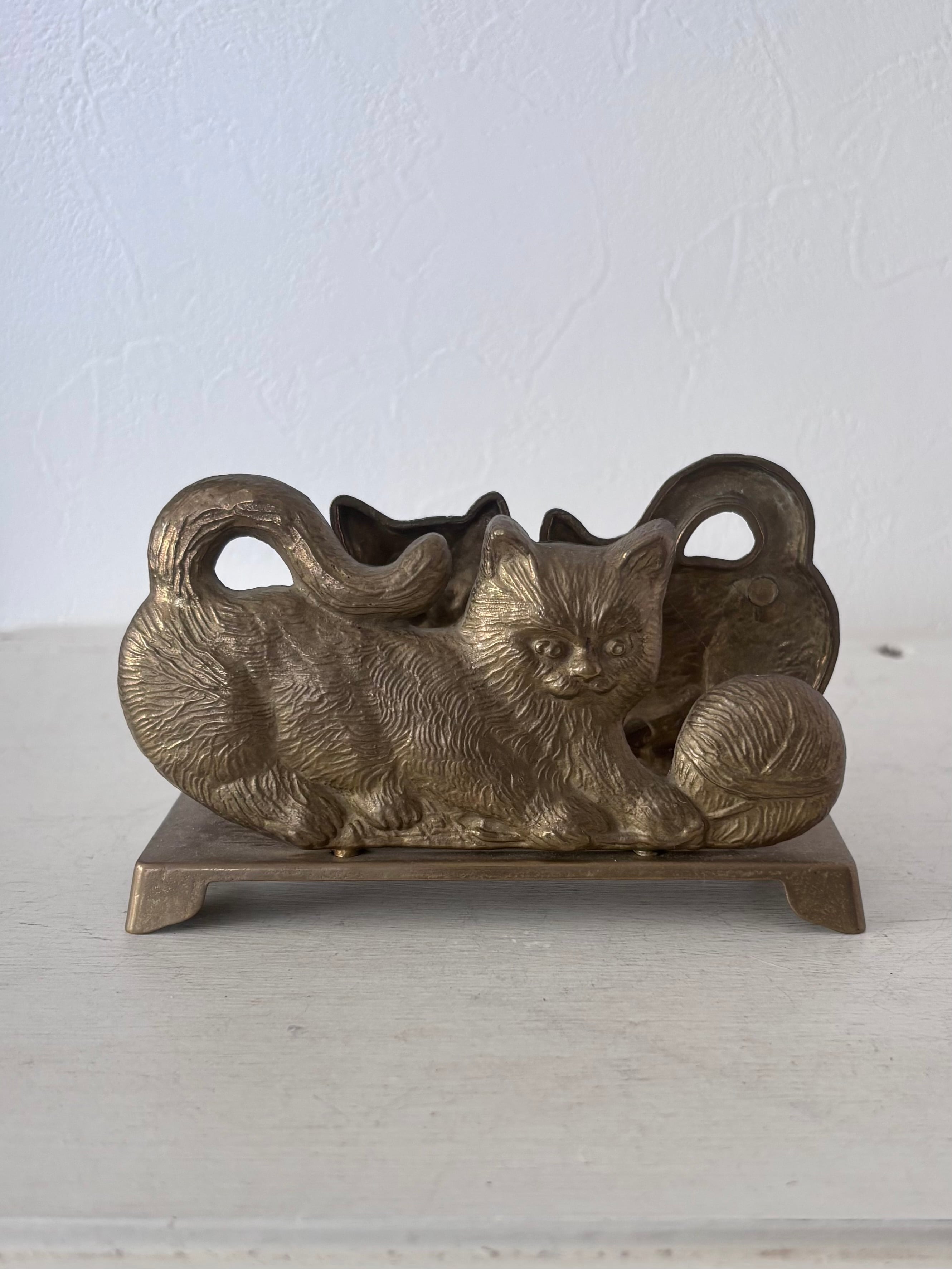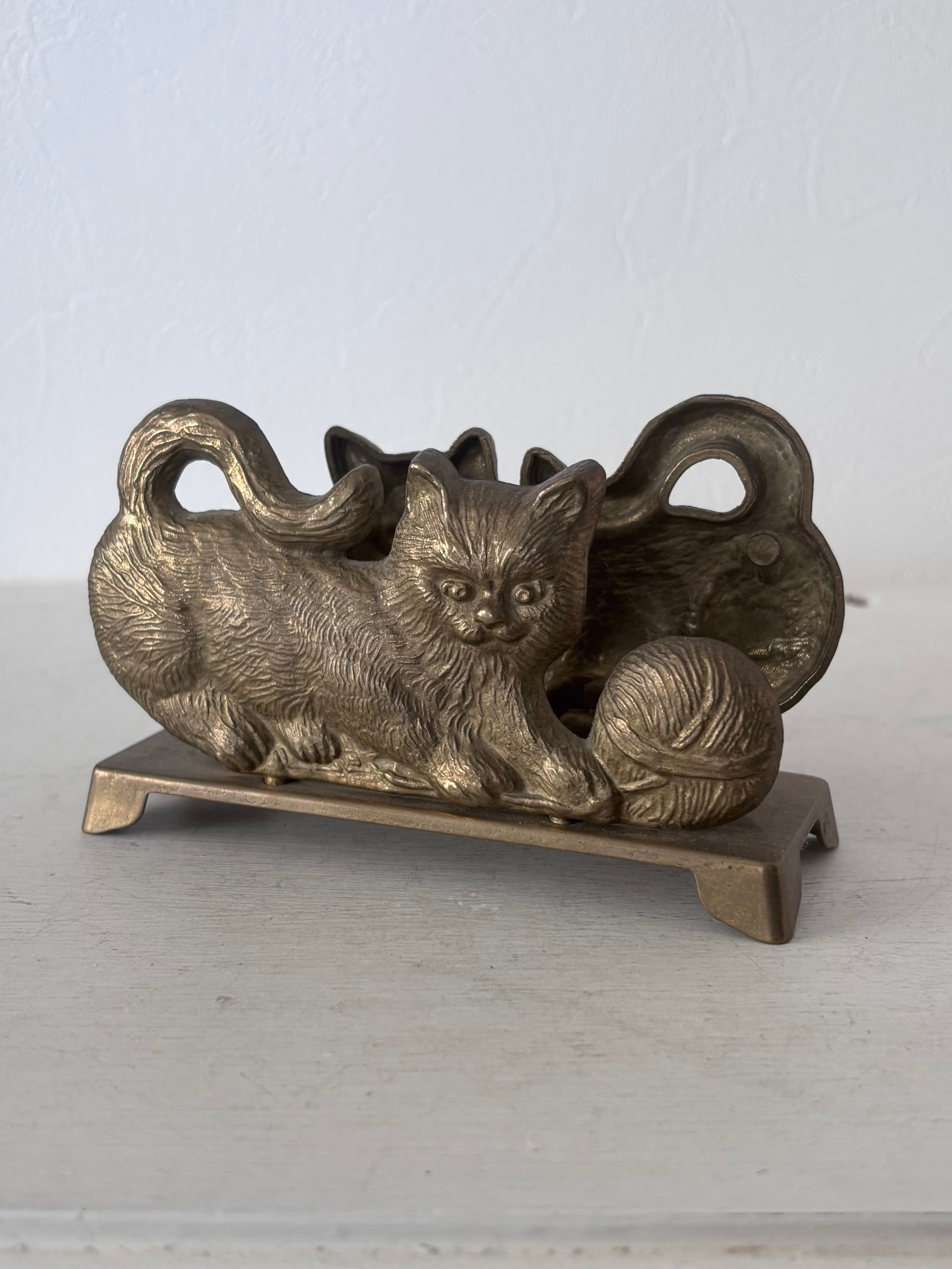 毛糸で遊ぶ猫が背中合わせで寄り添う、ブロンズトーンのヴィンテージスタンド。卓上でナプキンを挟む愛らしいデスクアクセサリーです。毛並みのレリーフは柔らかく、光を受けるたびに落ち着いた陰影が浮かびます。
