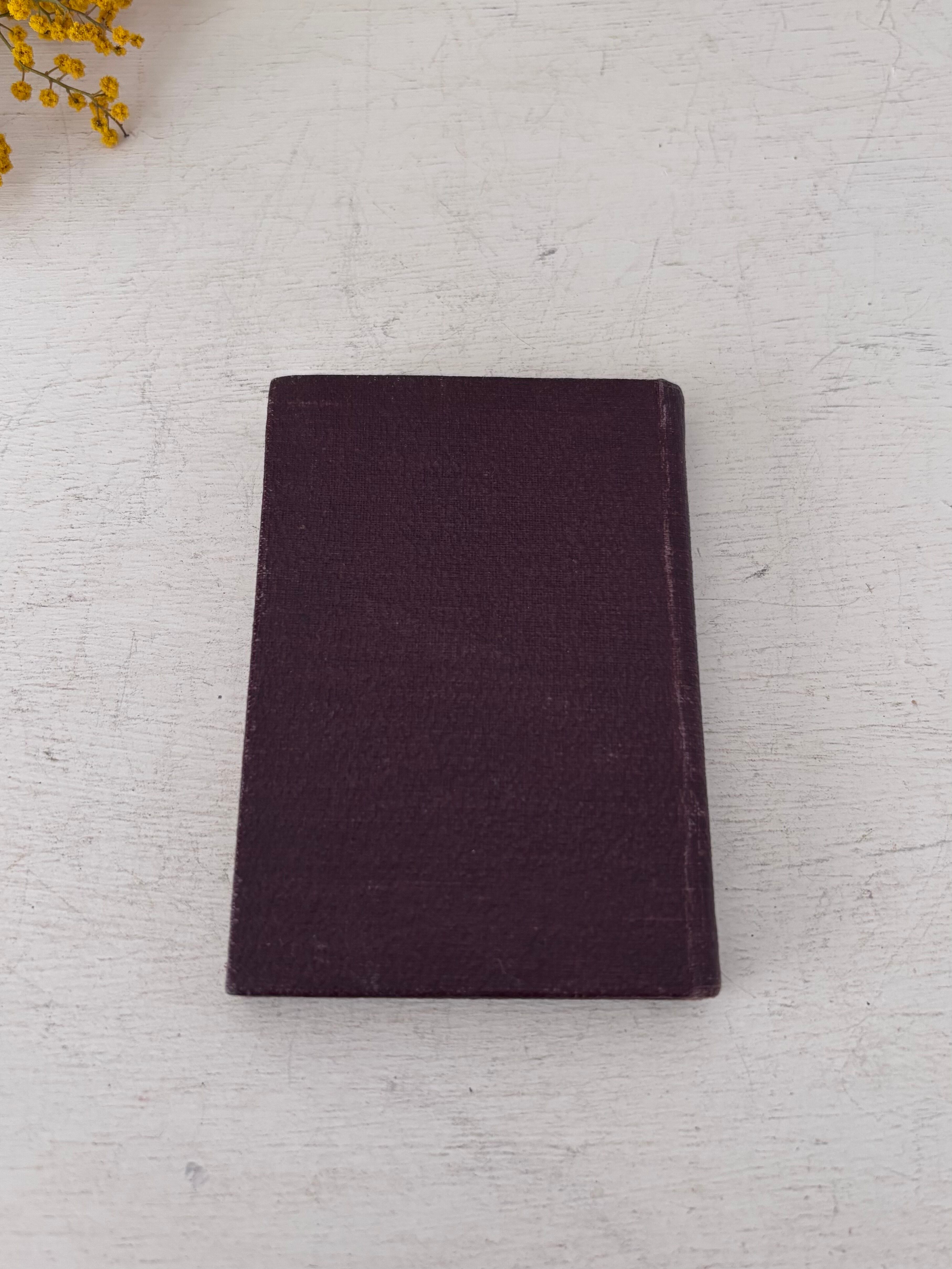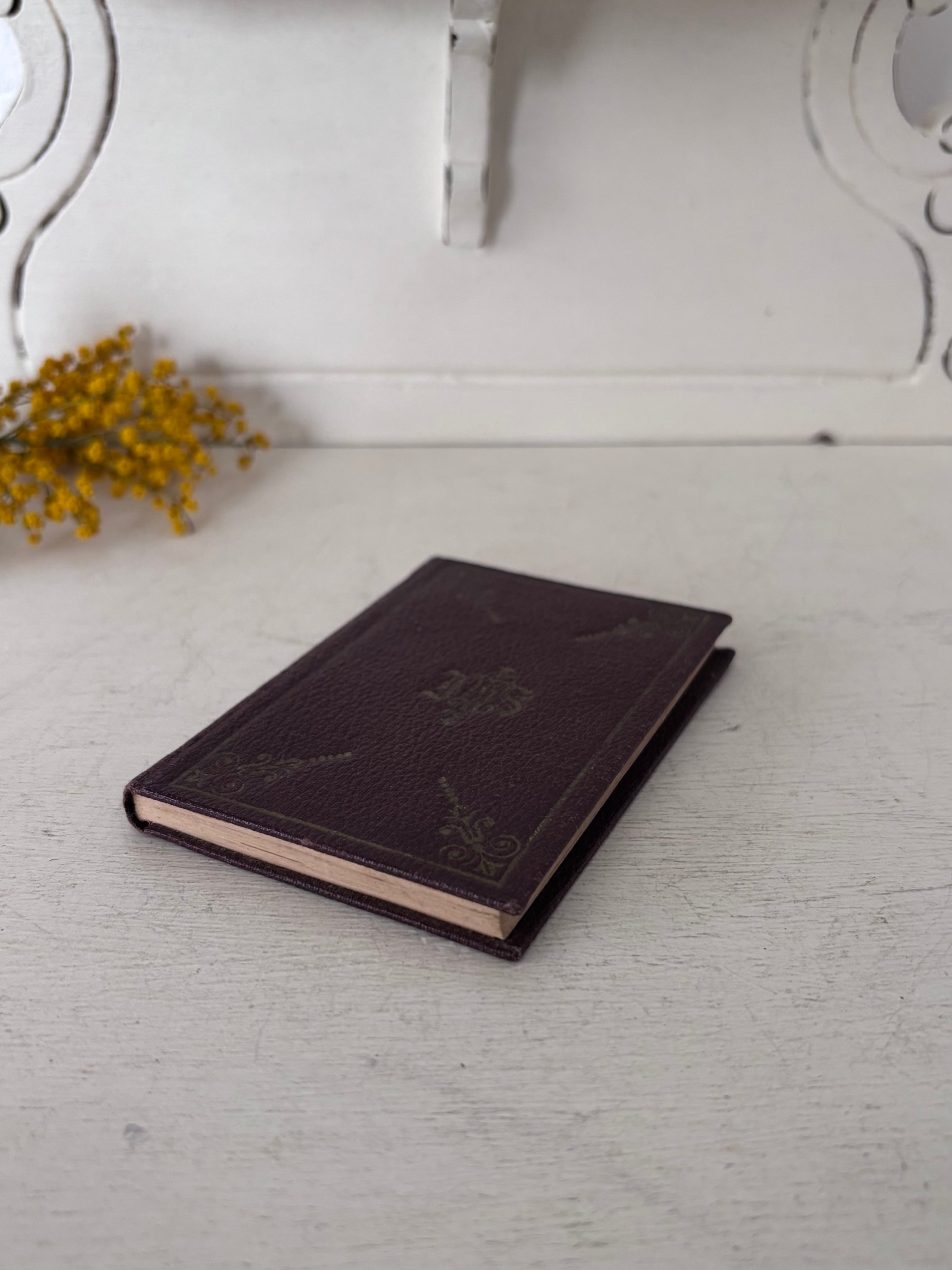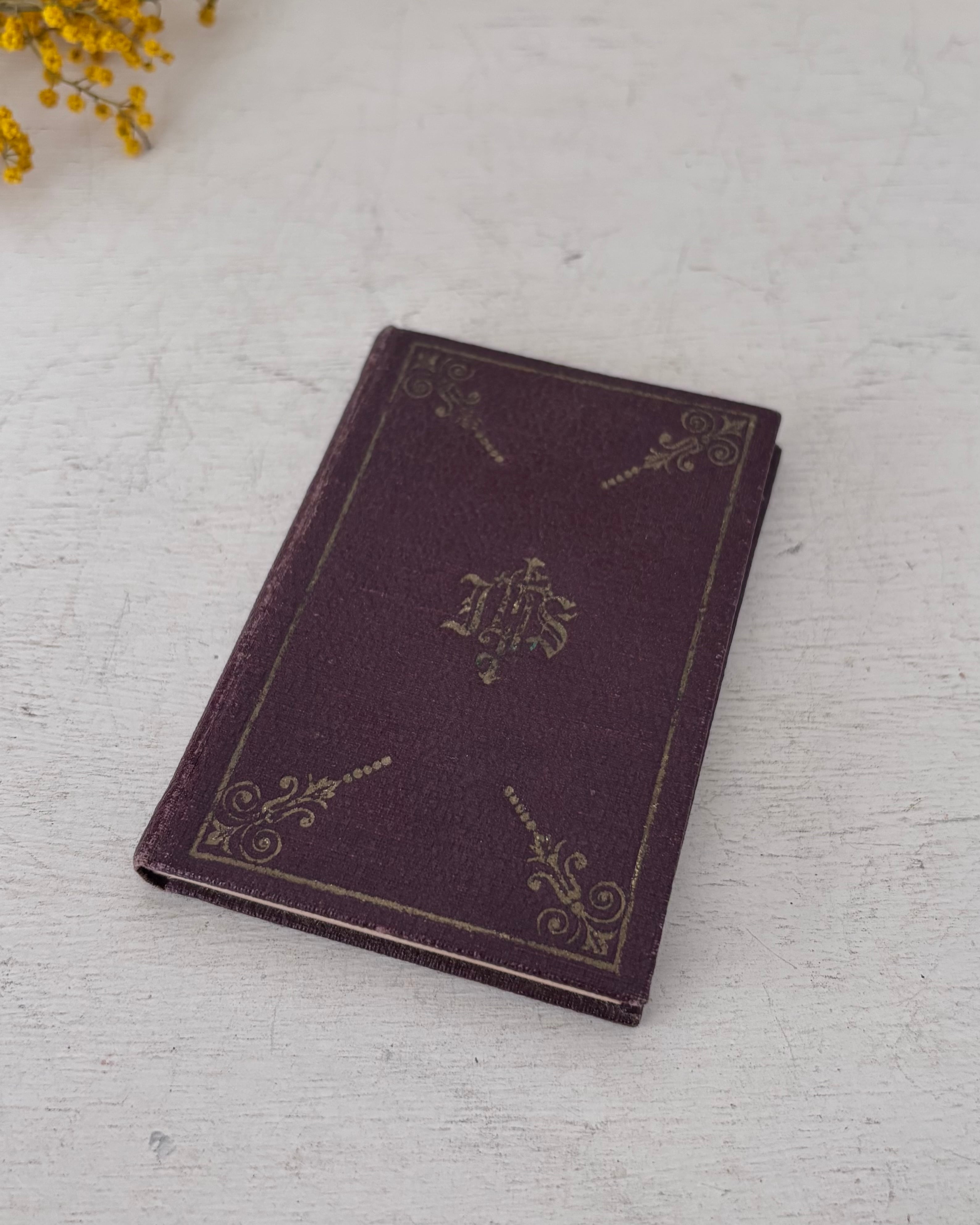 深いボルドーカラーの表紙には、繊細な金彩装飾とIHS(イエスの聖名) のモノグラムが施され、フランスの古い宗教書らしい静かな美しさを感じさせる装丁です。