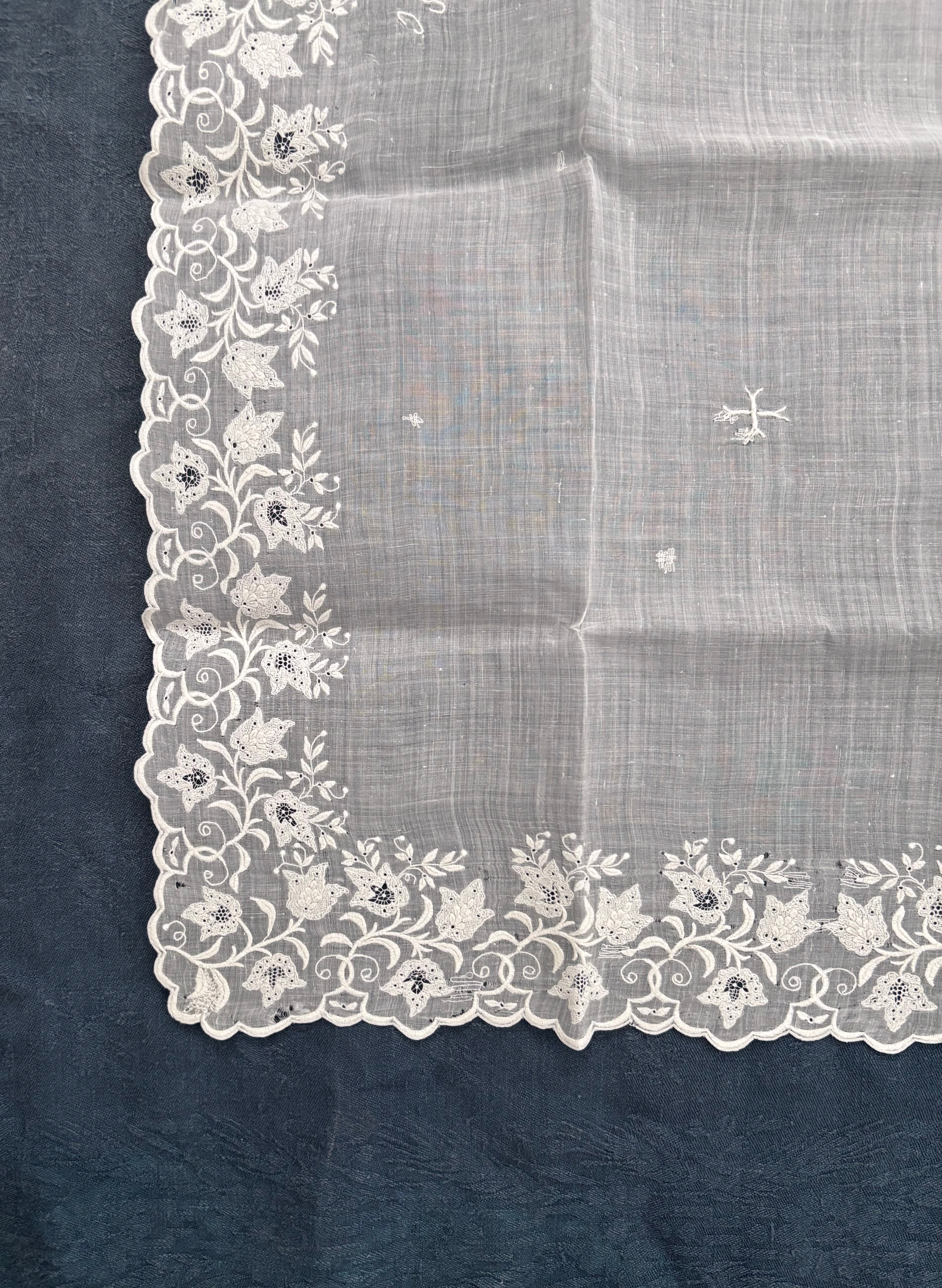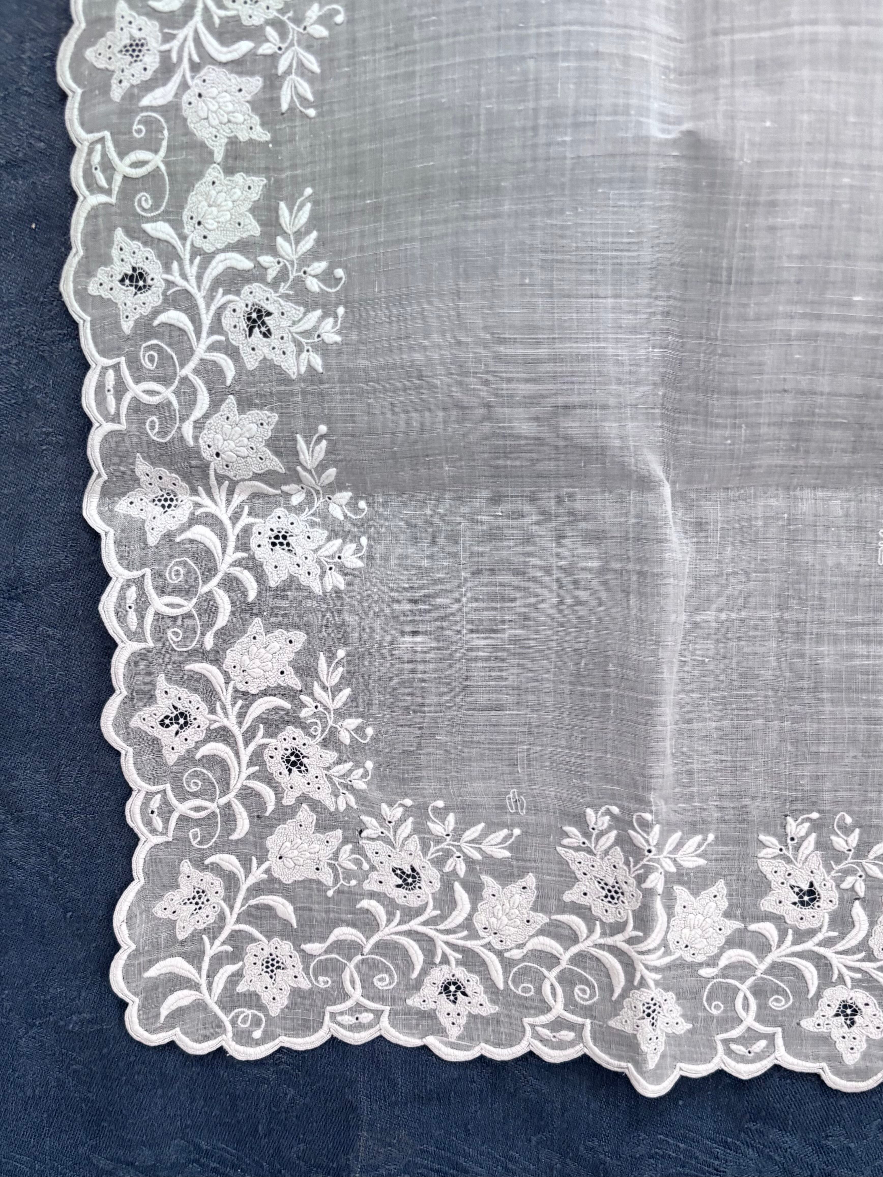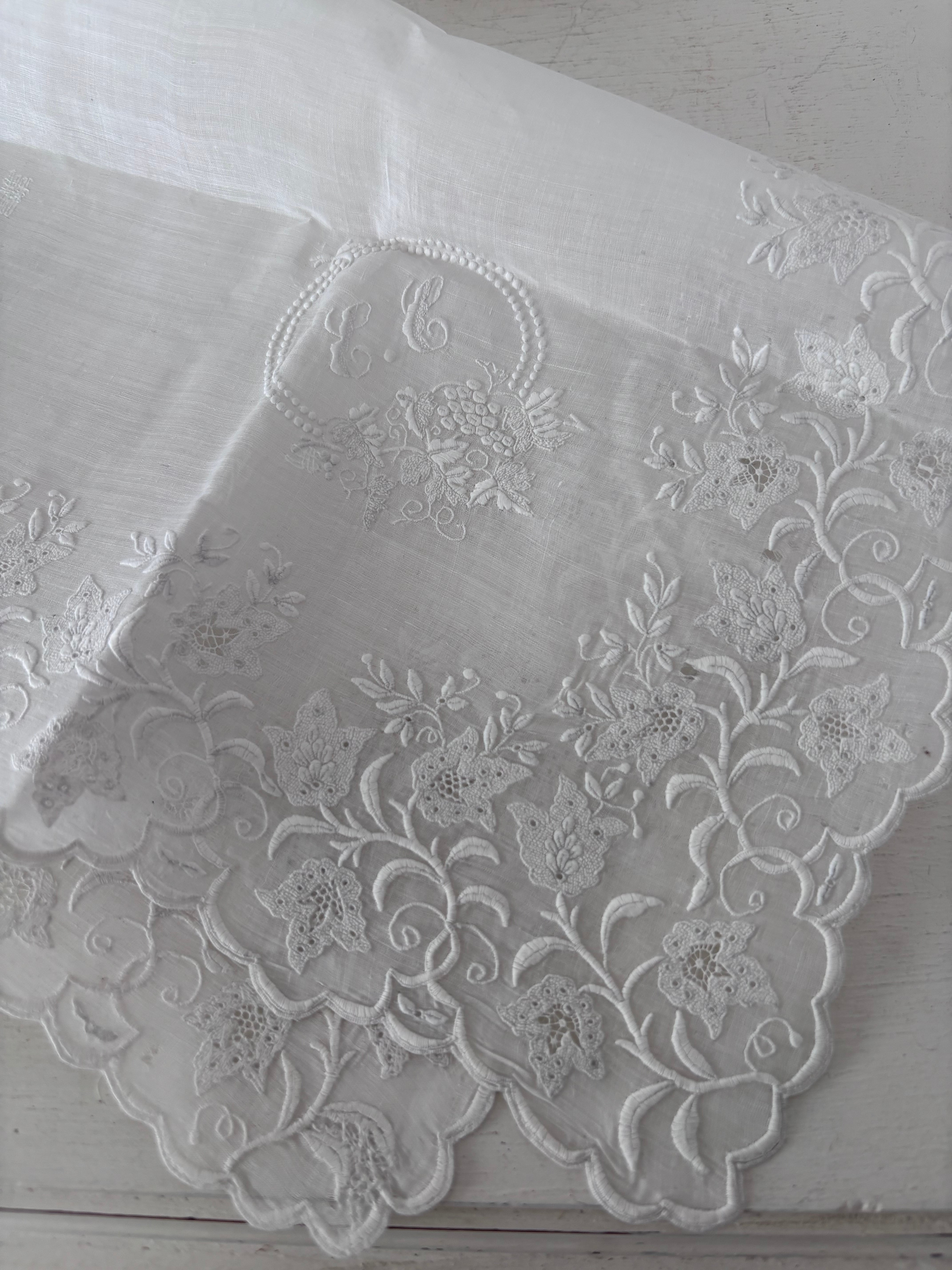 細かな機械刺繍とスカラップの縁取りが、優雅な雰囲気です。