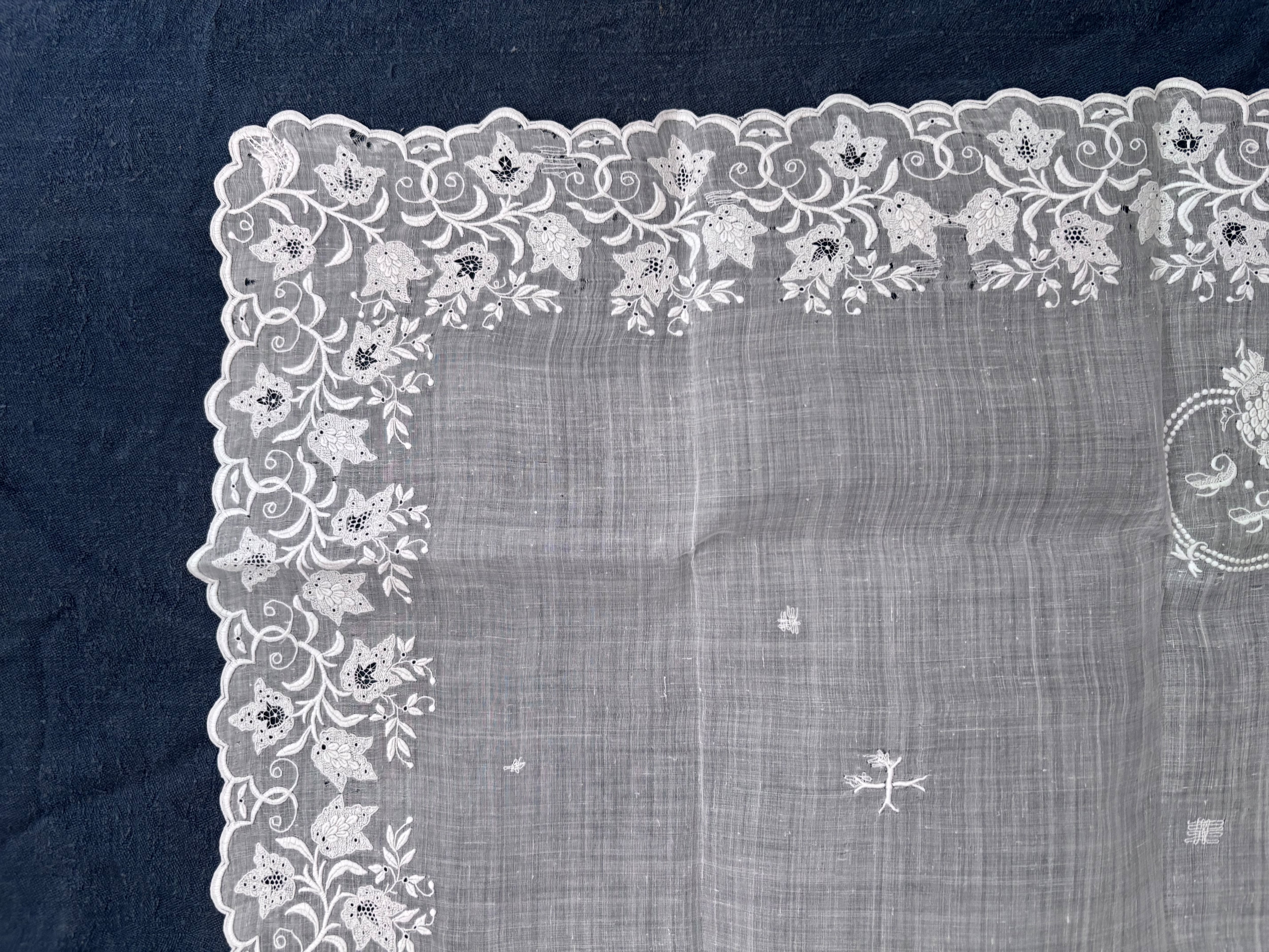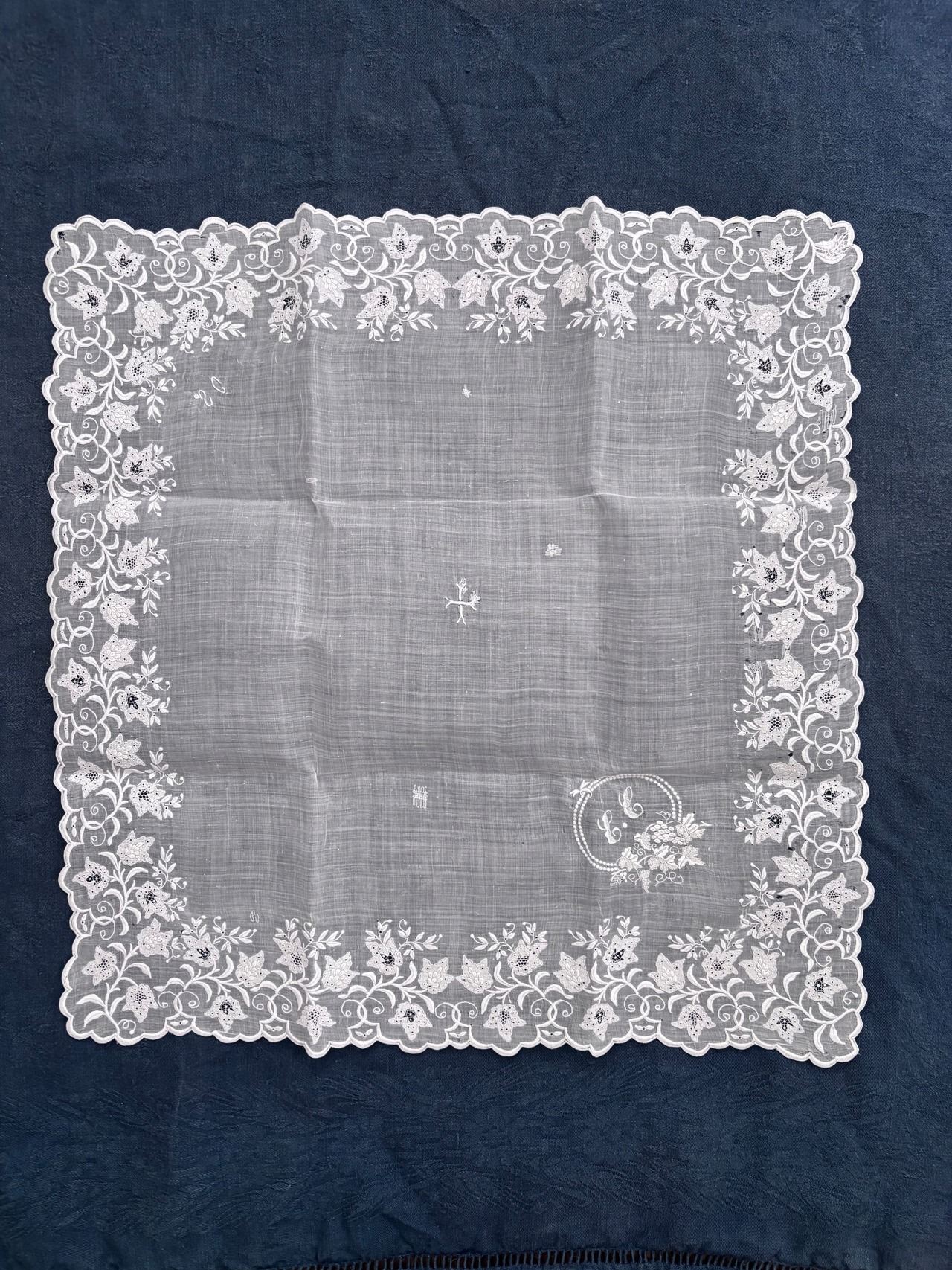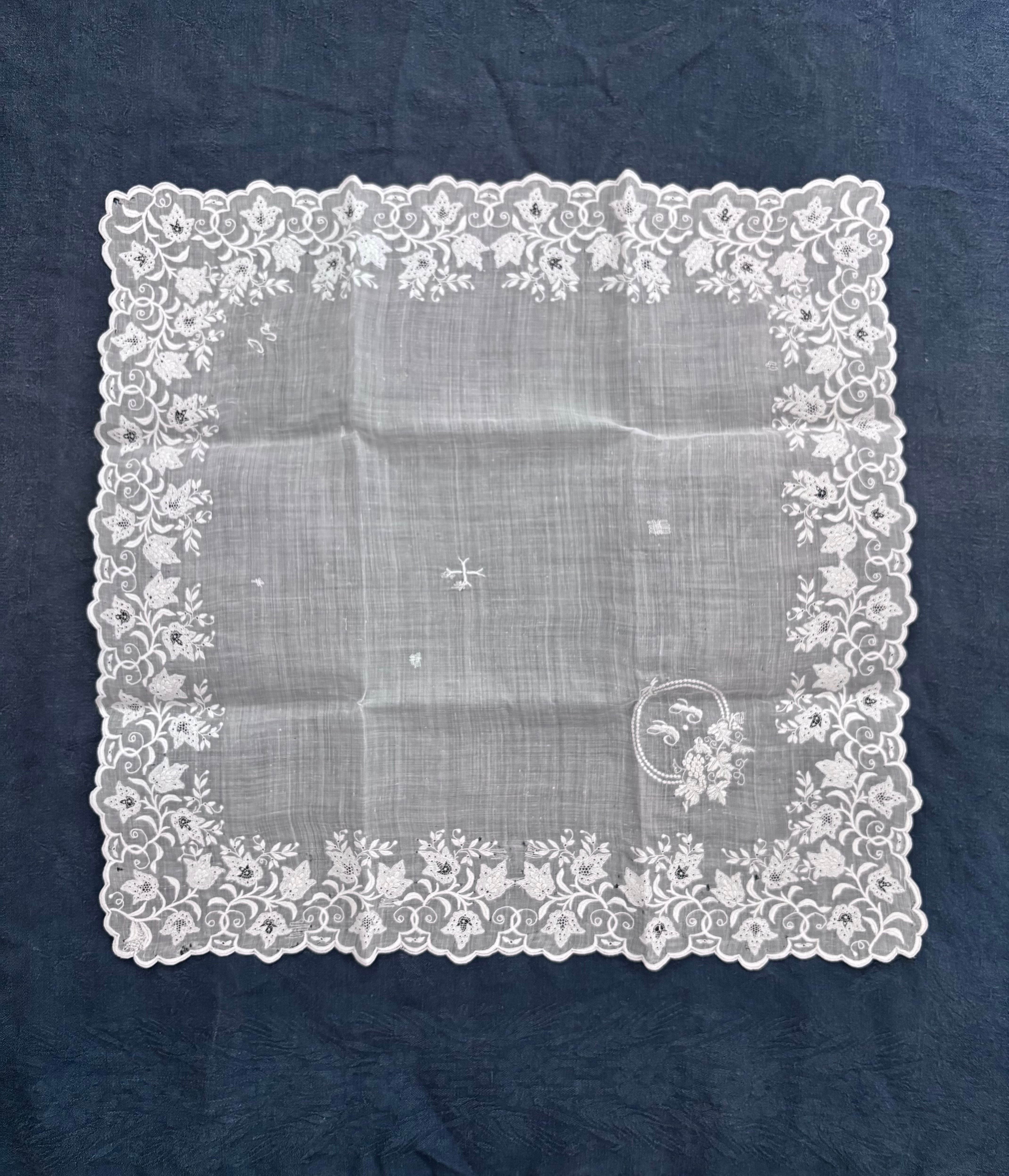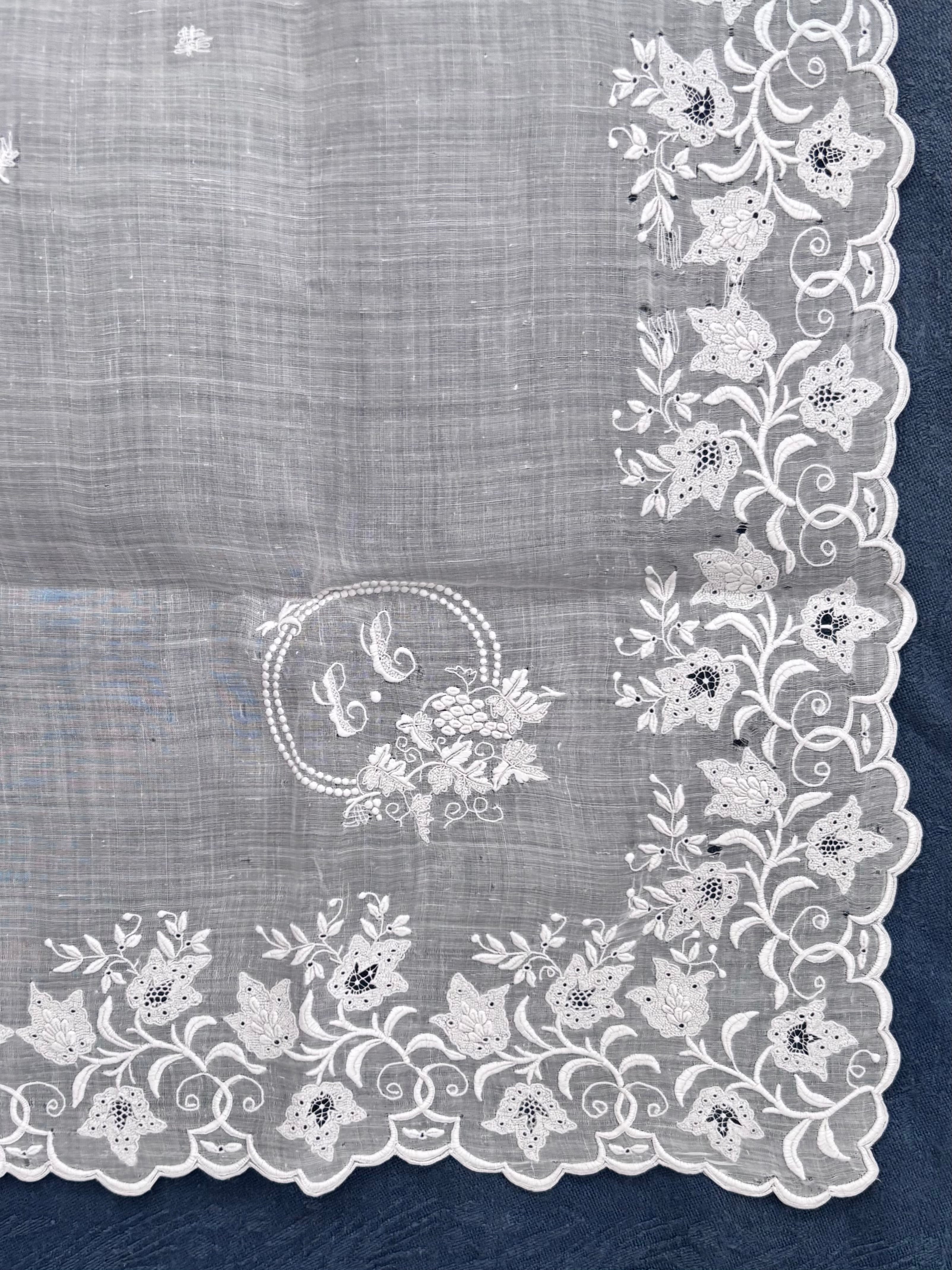 細かな機械刺繍とスカラップの縁取りが、優雅な雰囲気です。