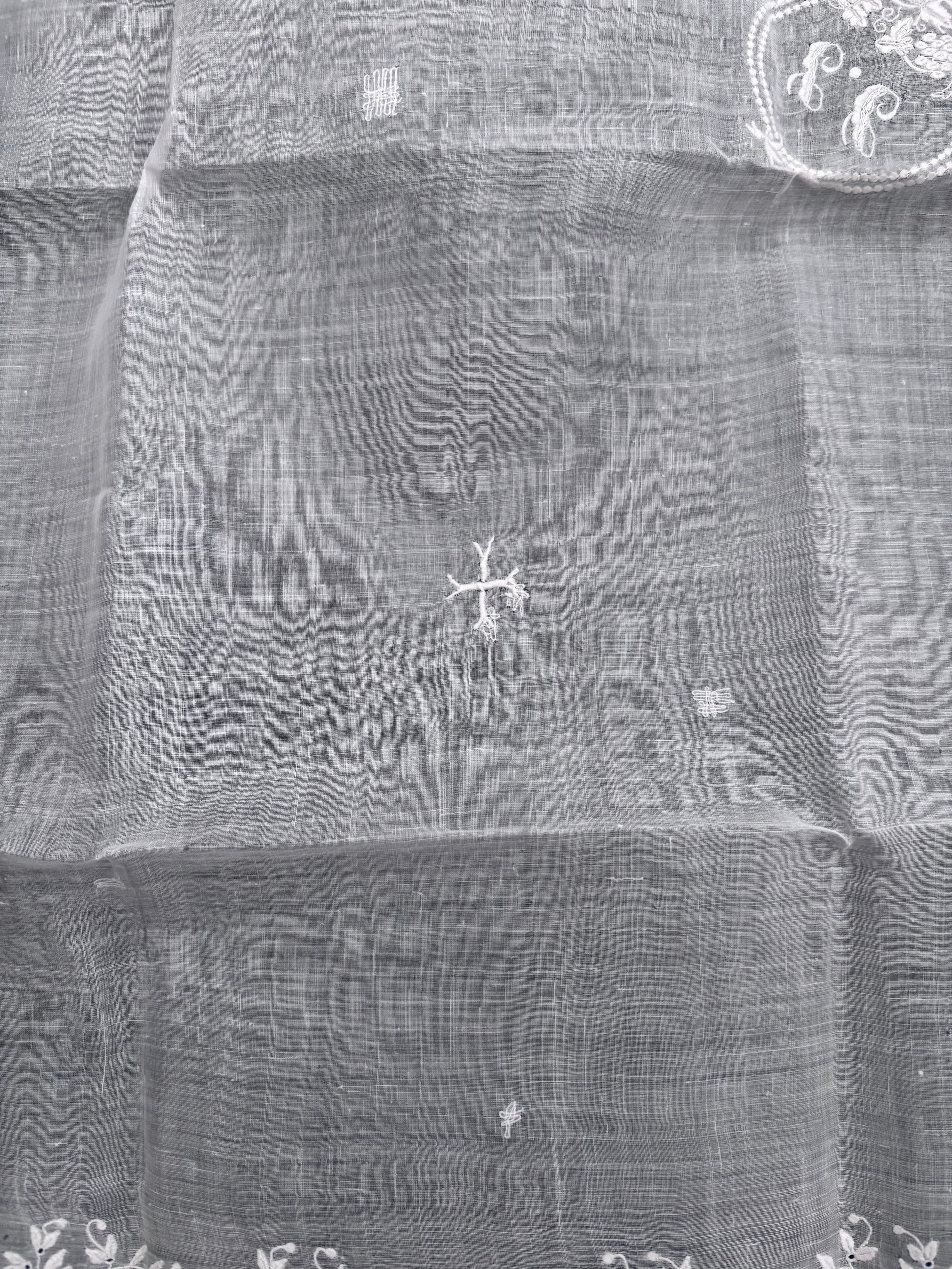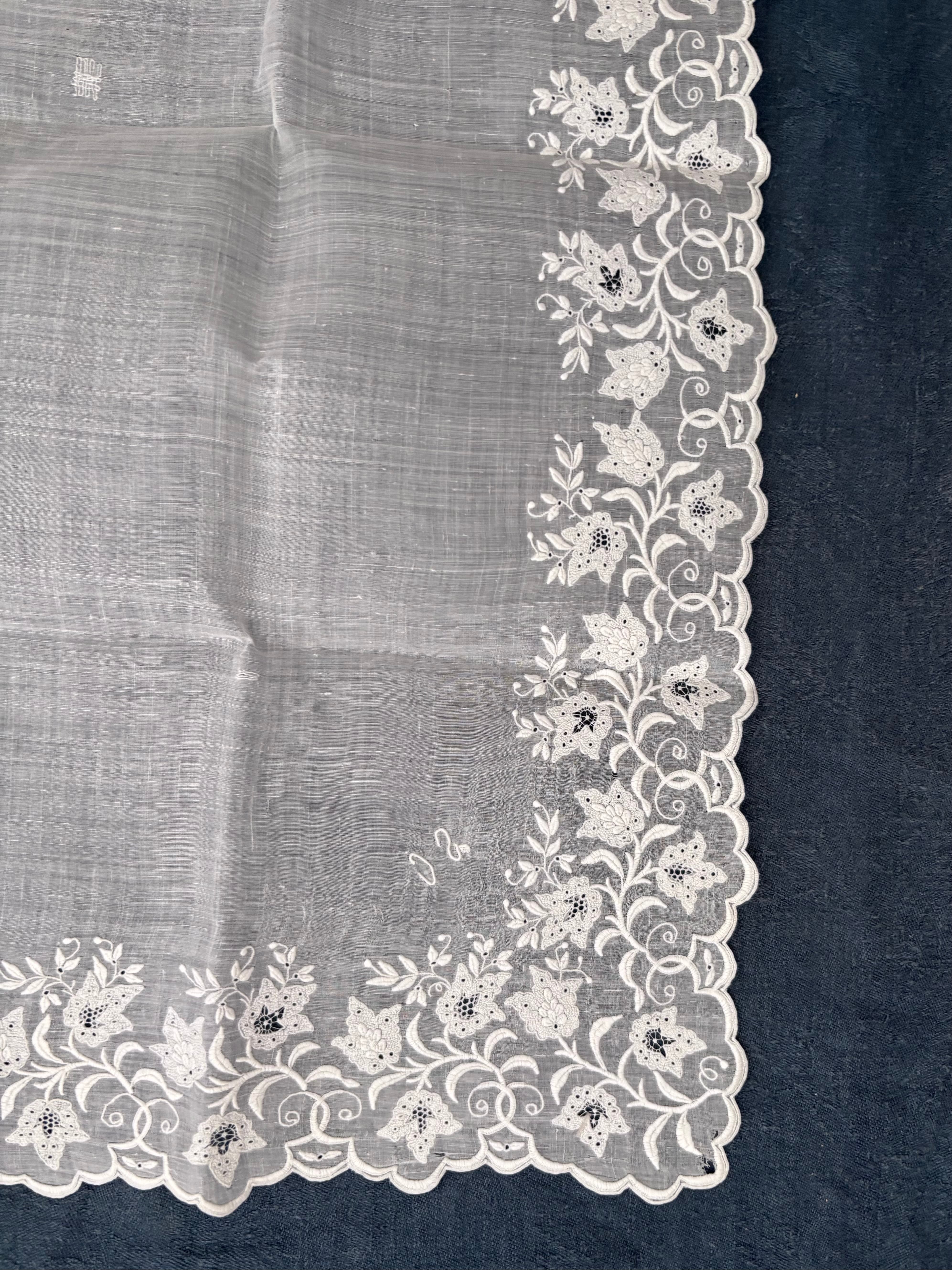 薄く軽やかなリネン生地に、花のガーランド刺繍が周囲を彩る美しいデザインです。