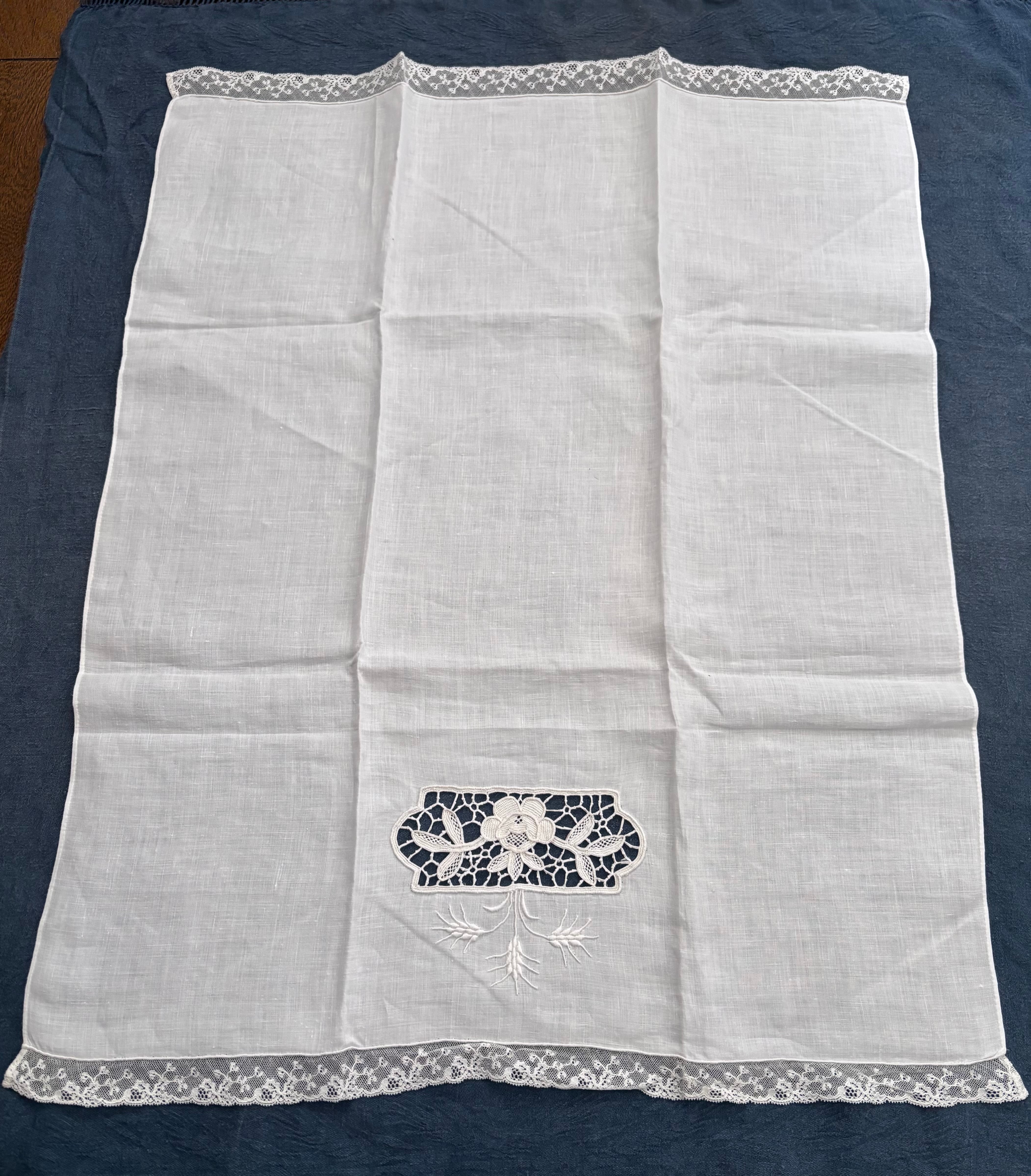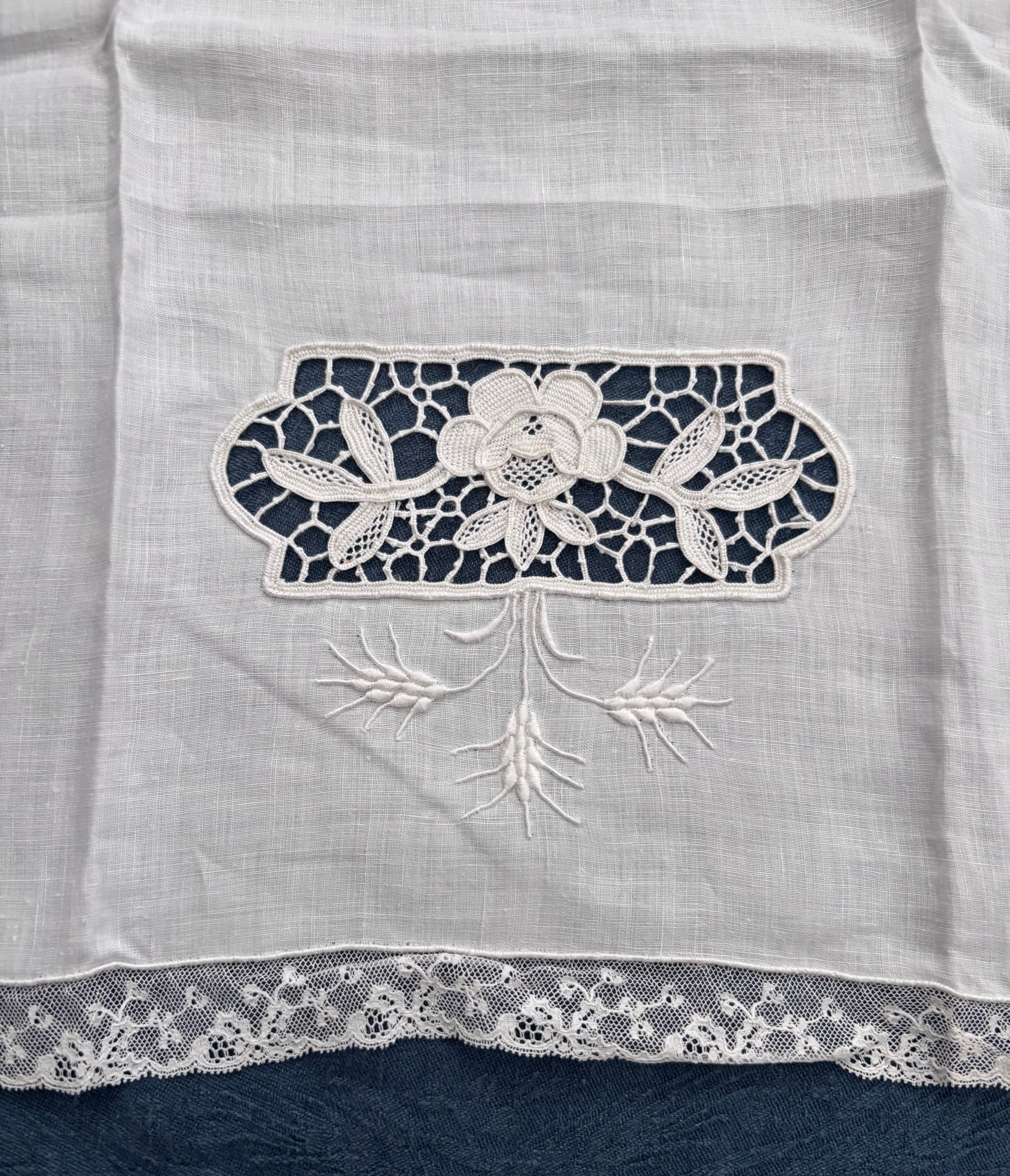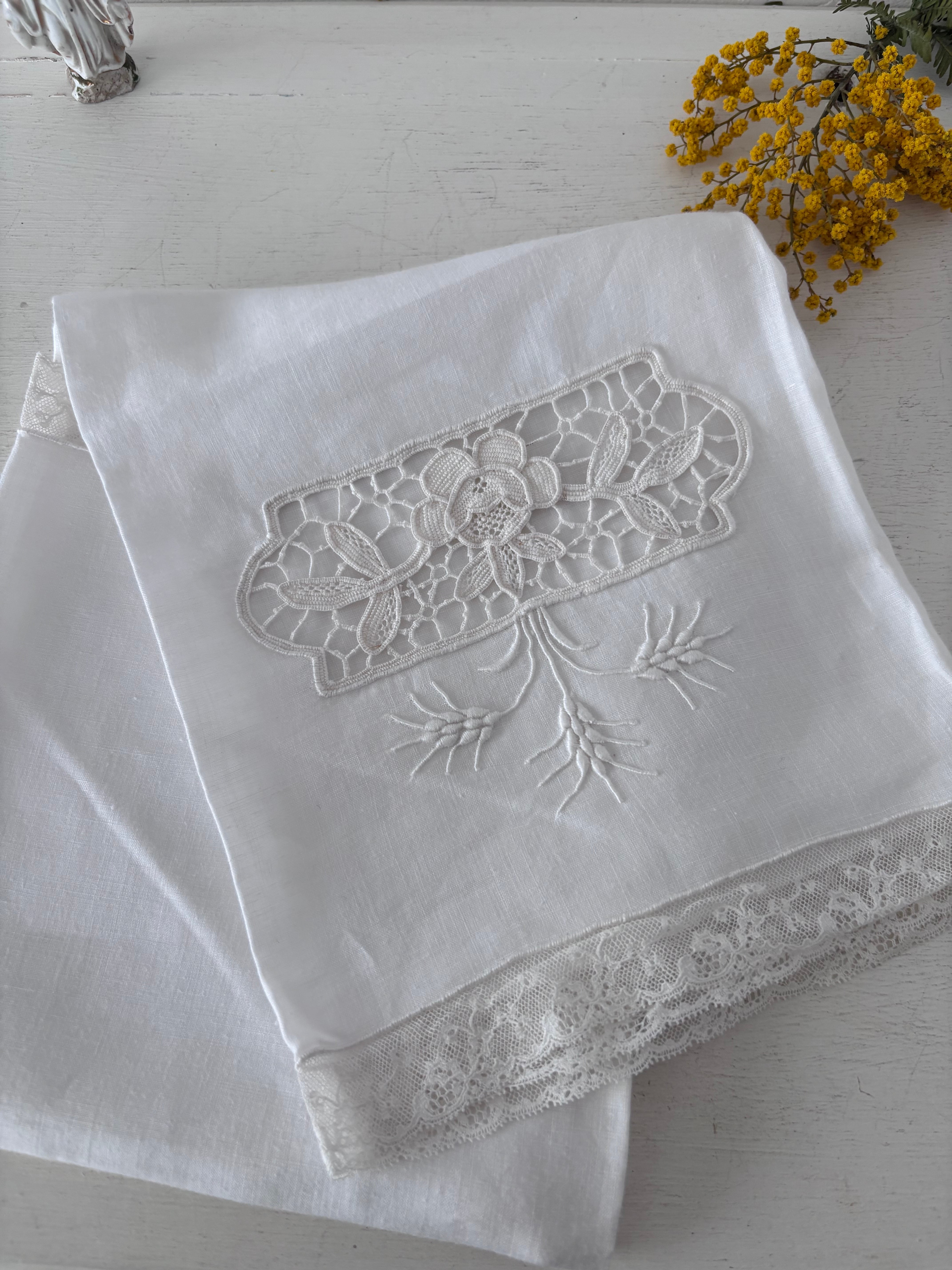 やわらかな薄手コットンに、麦の穂を思わせる刺繍と花のカットワークが施されたクロスです。