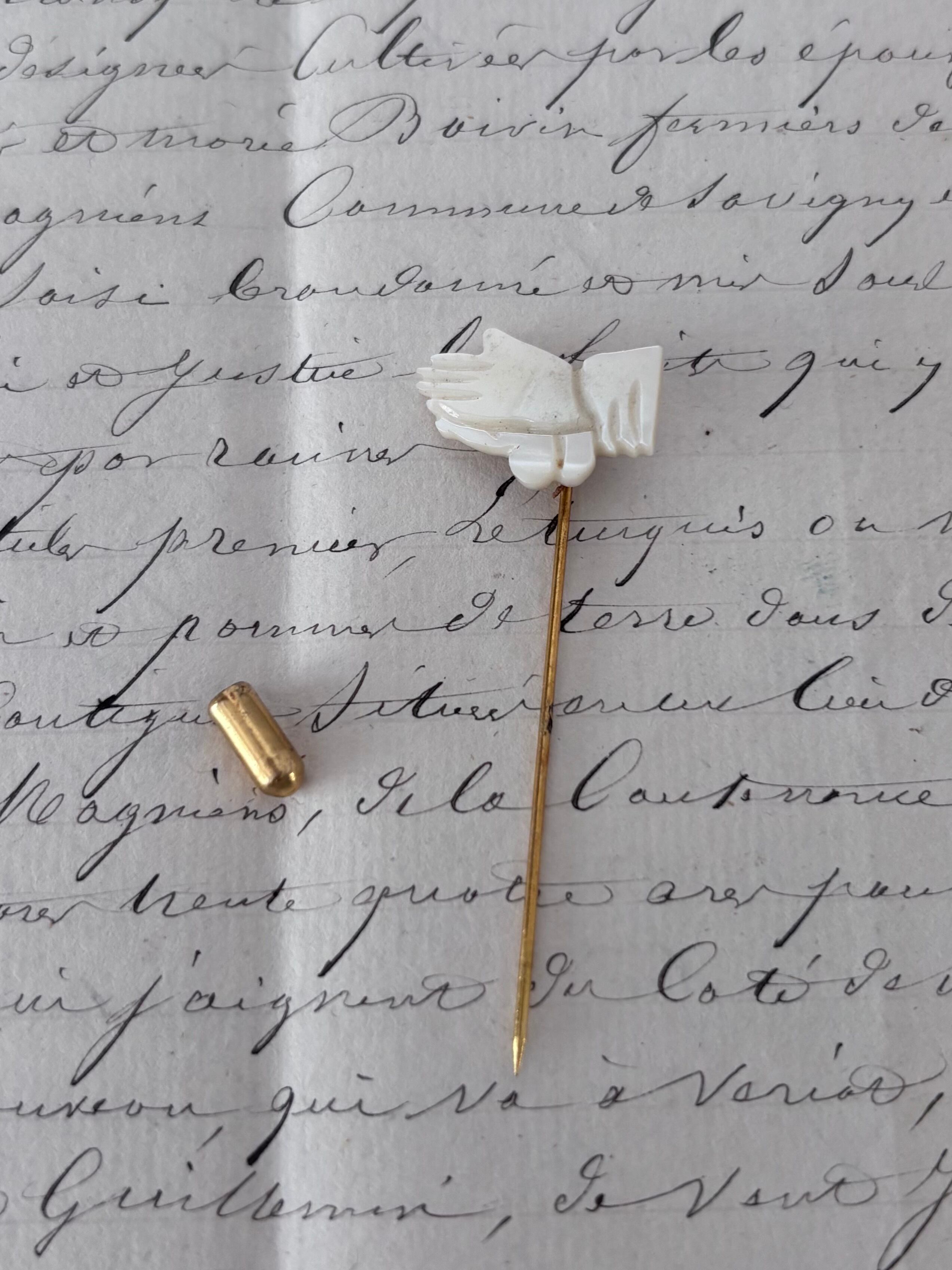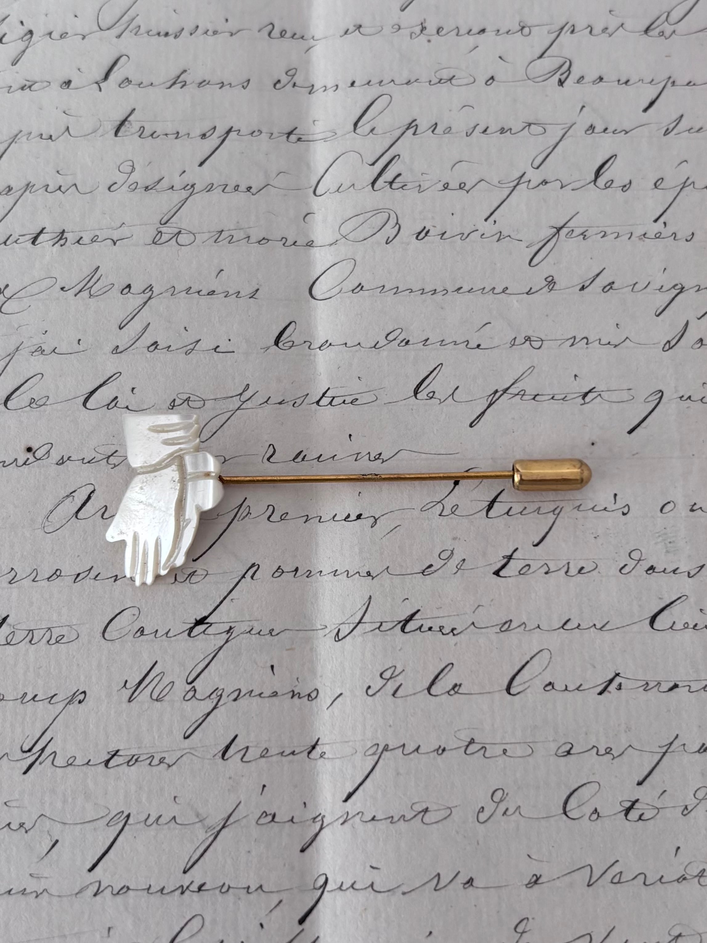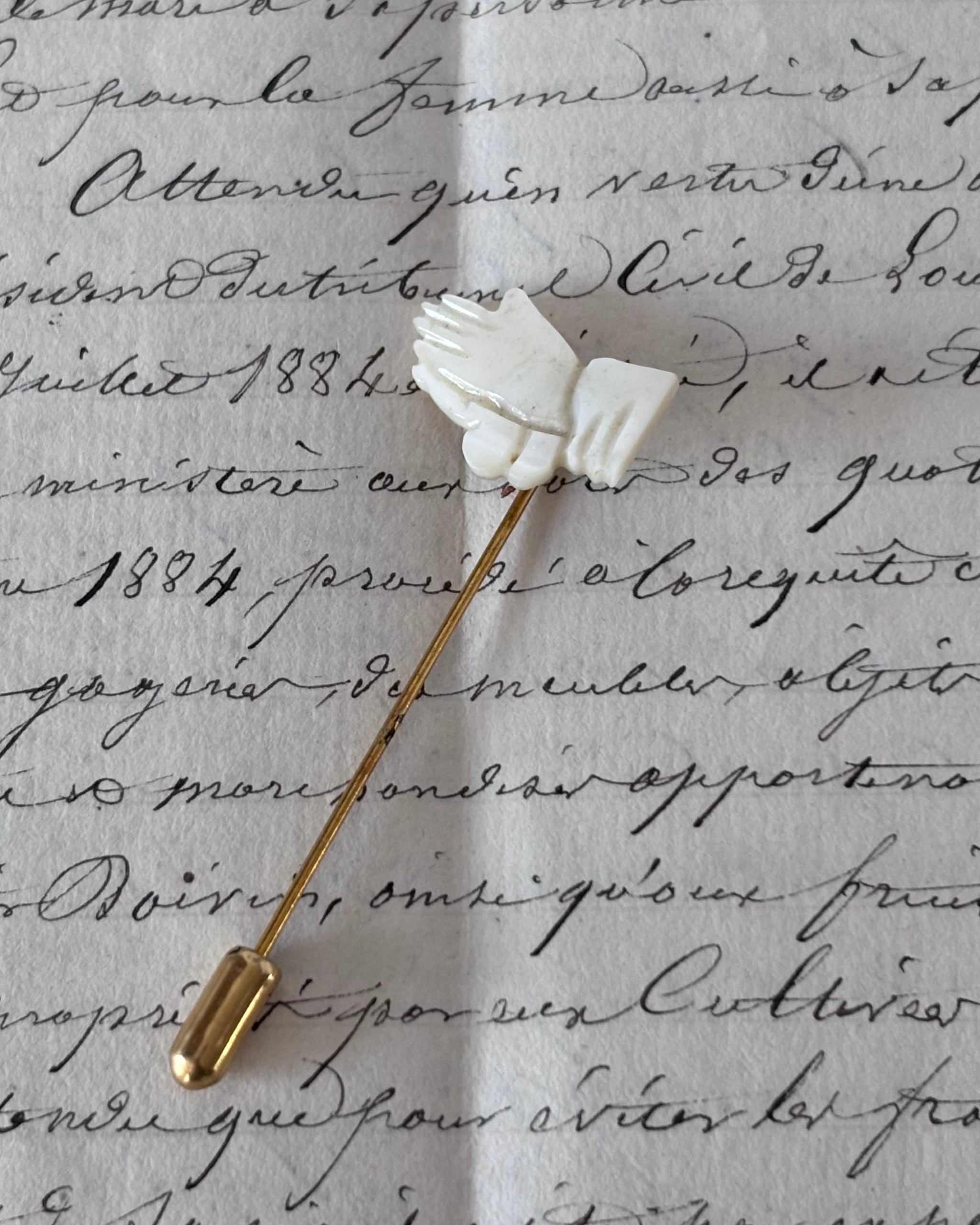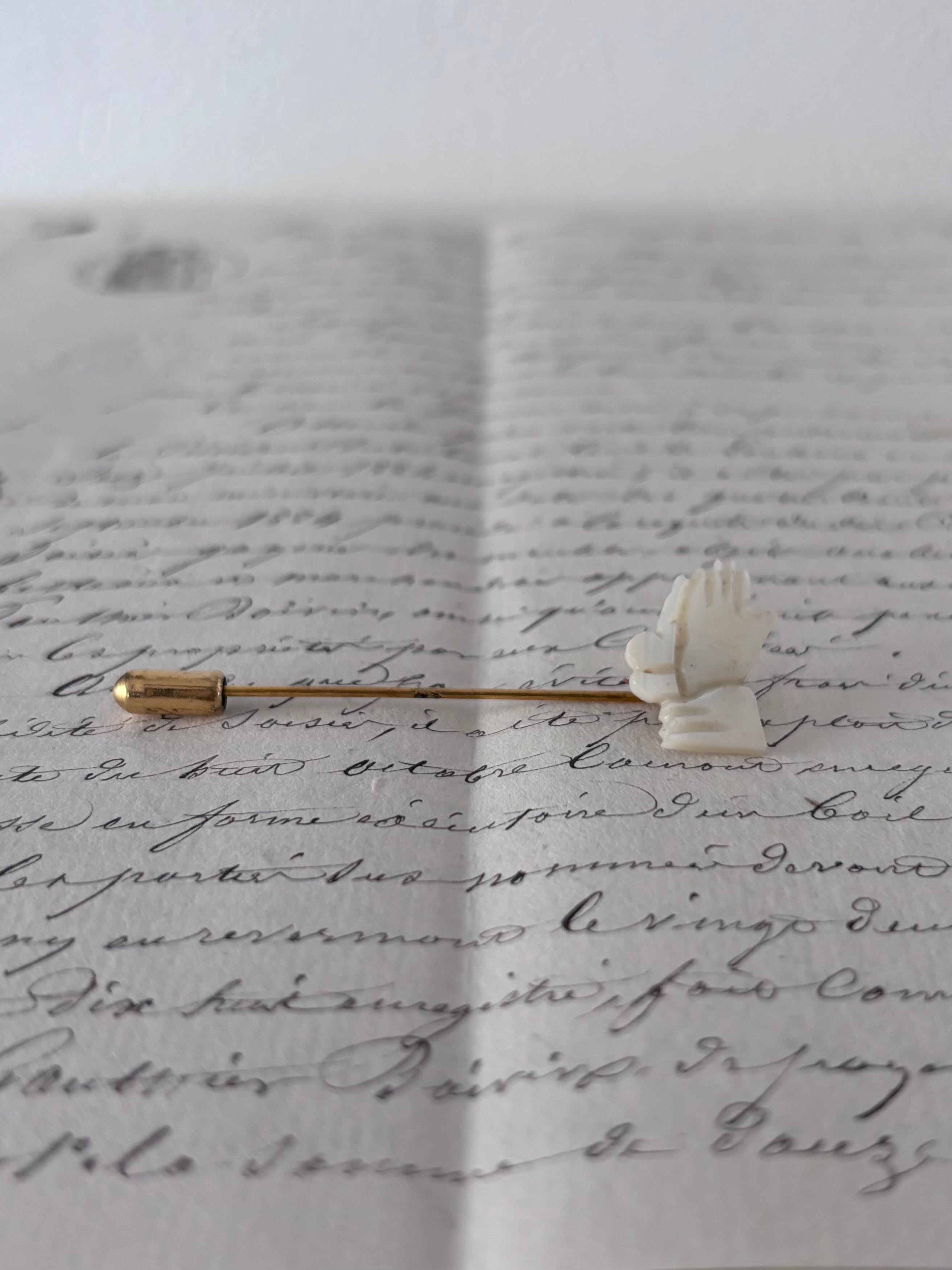 小さな手のモチーフは丁寧に彫刻されており、素材はおそらくシェル(マザーオブパール系の貝)素材と思われます。