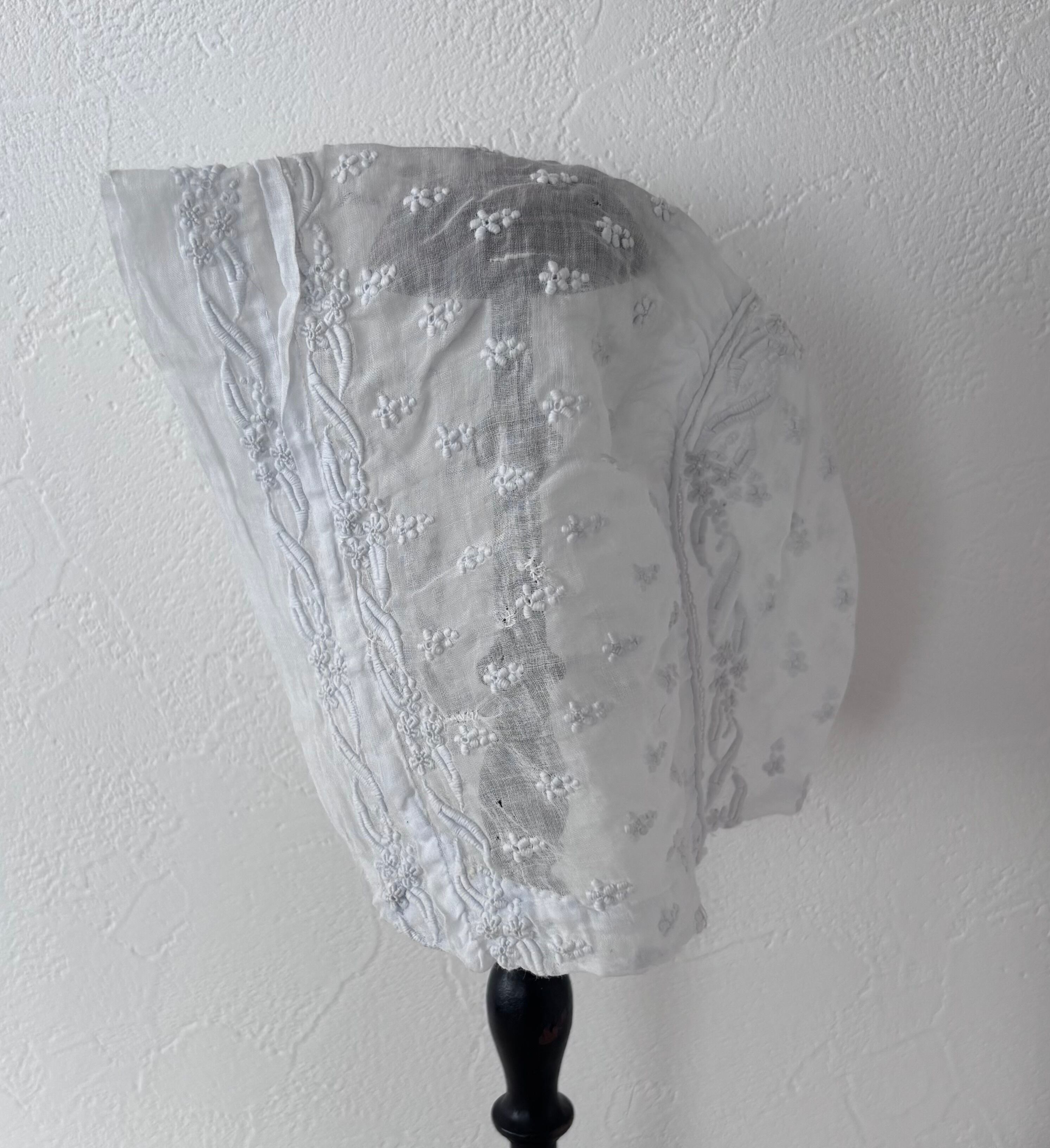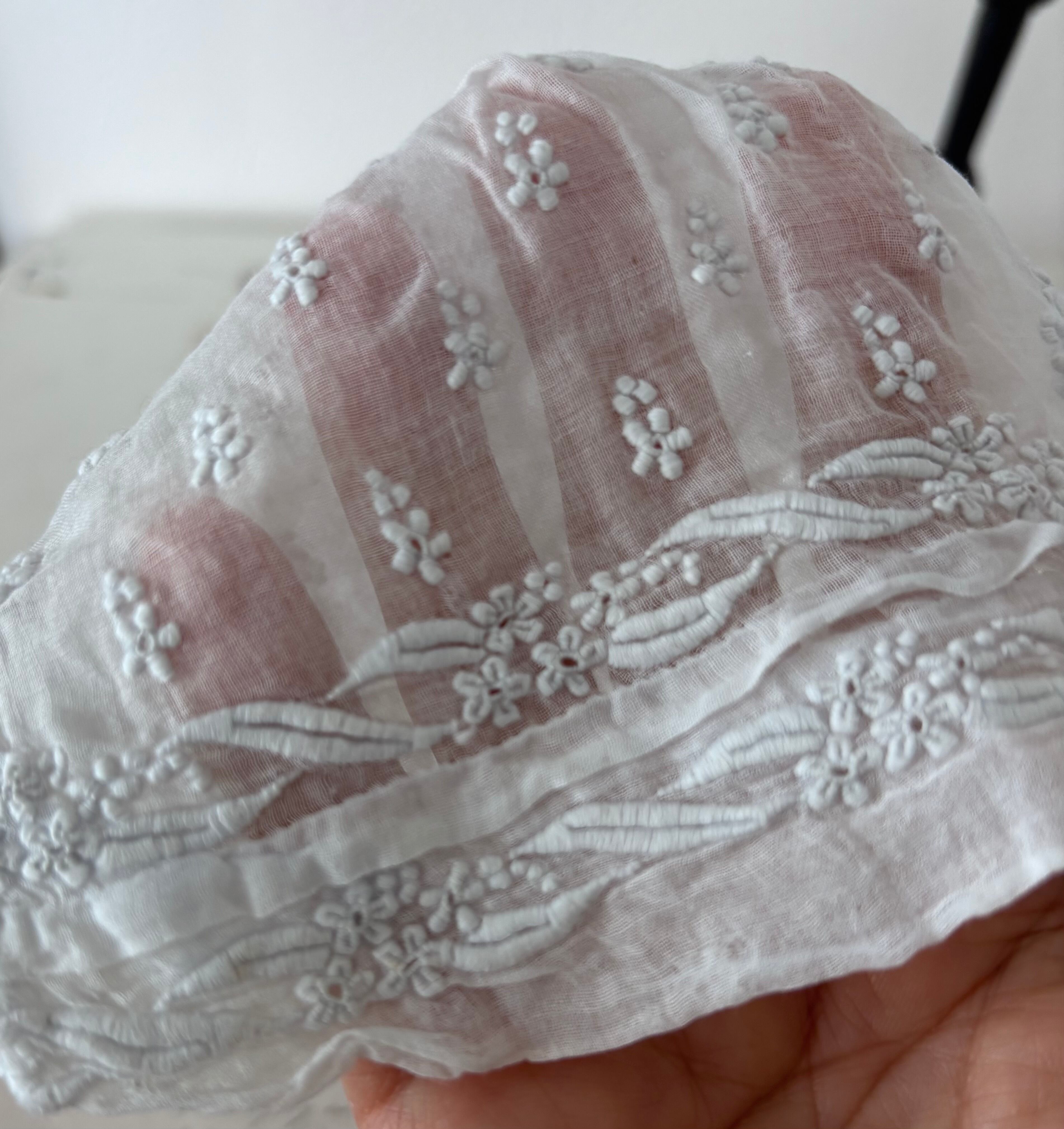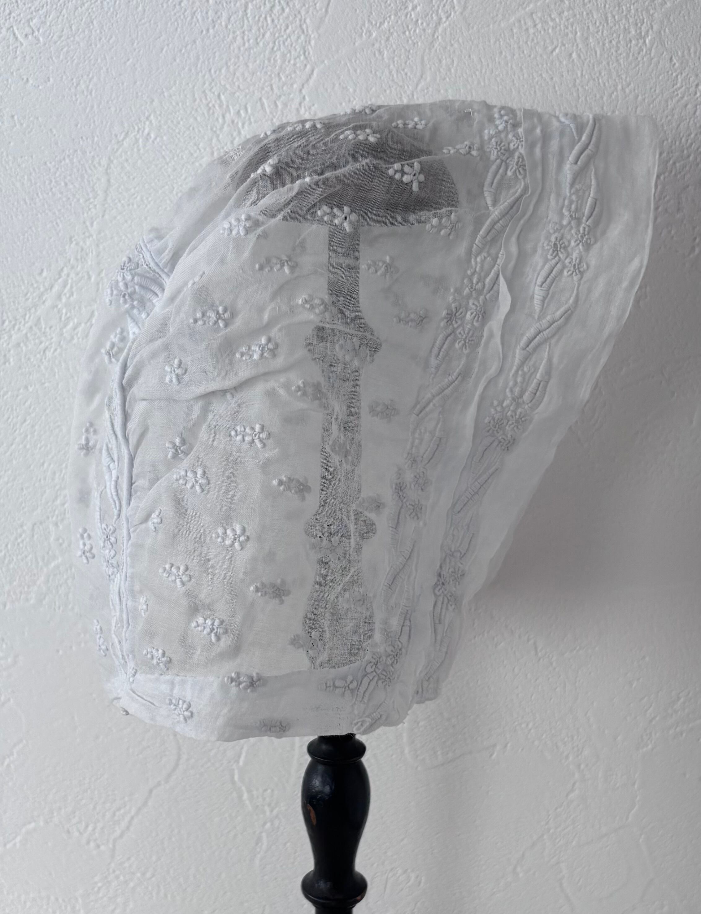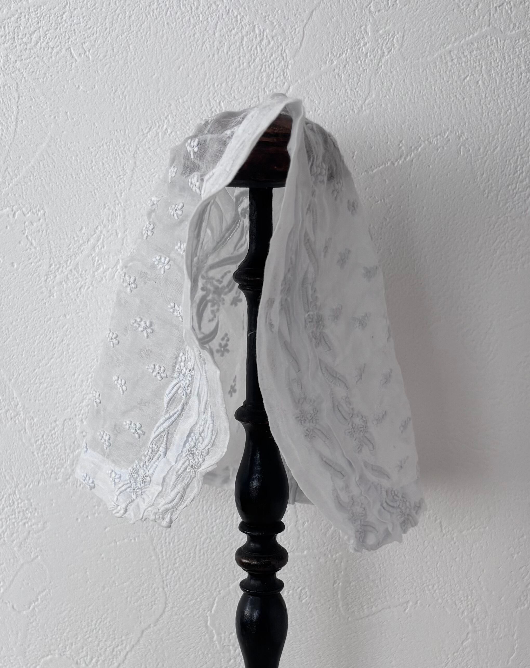 小さな花刺繍と立体的な縁の装飾が美しい、軽やかで透け感のあるコットン素材です。