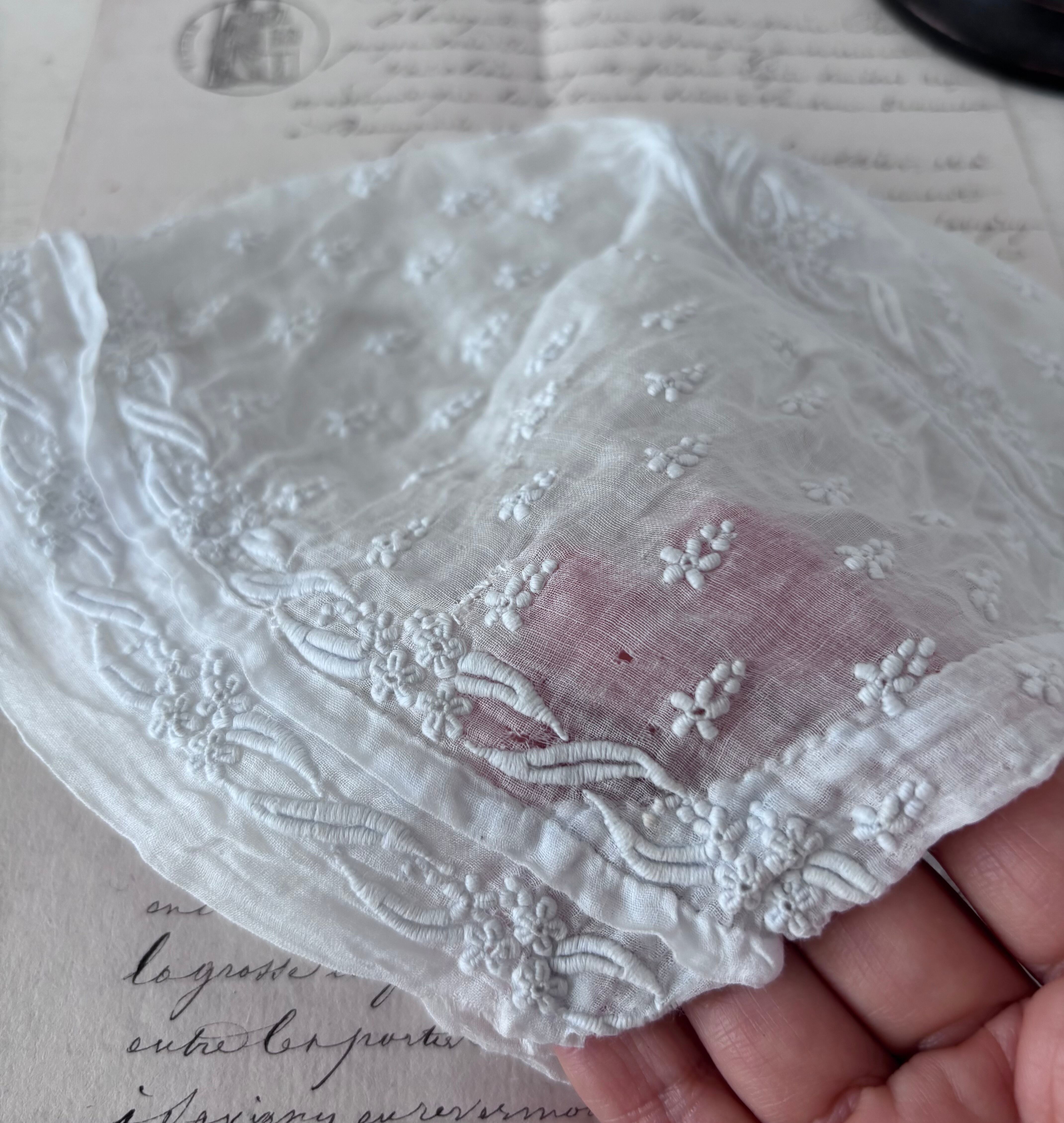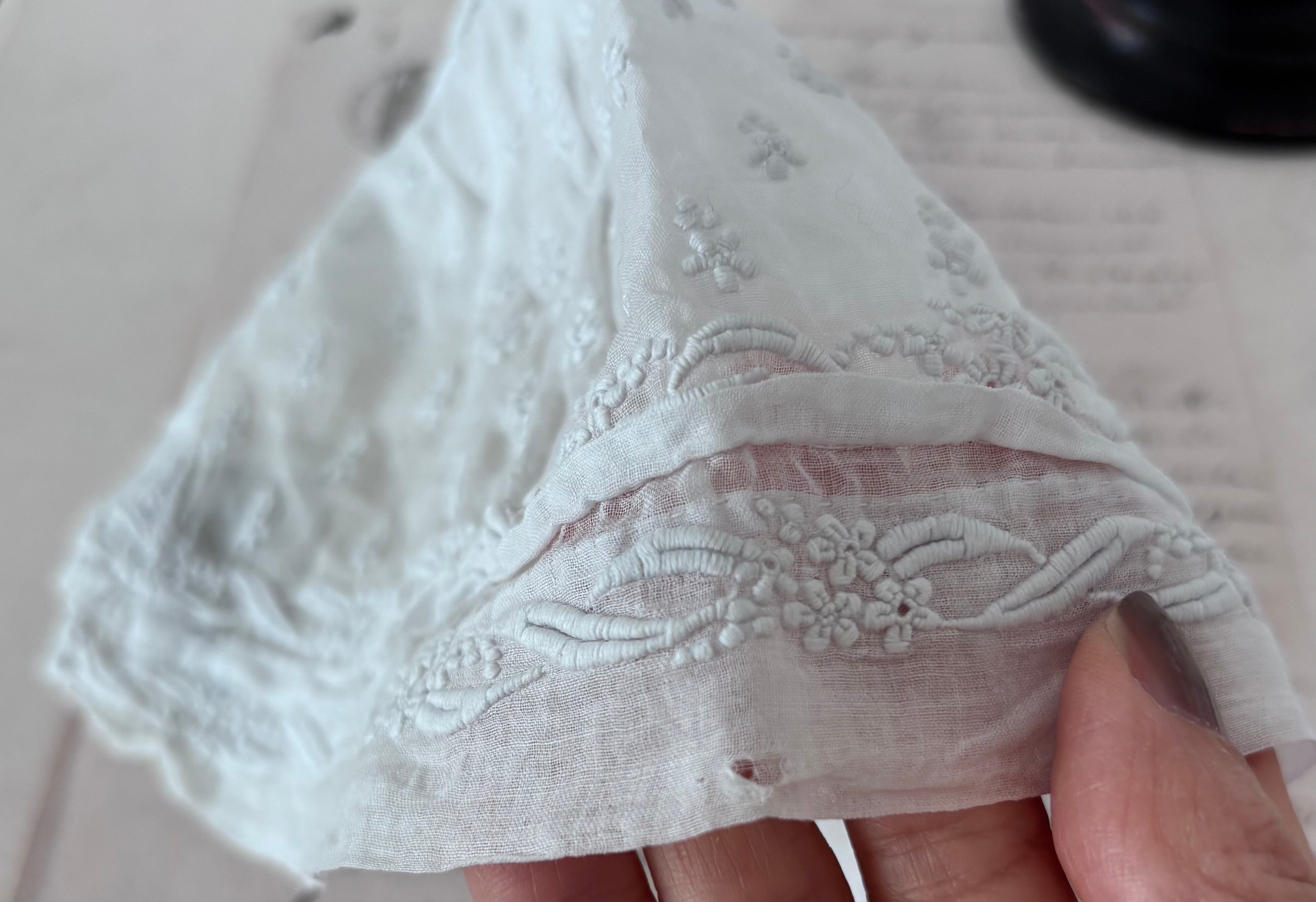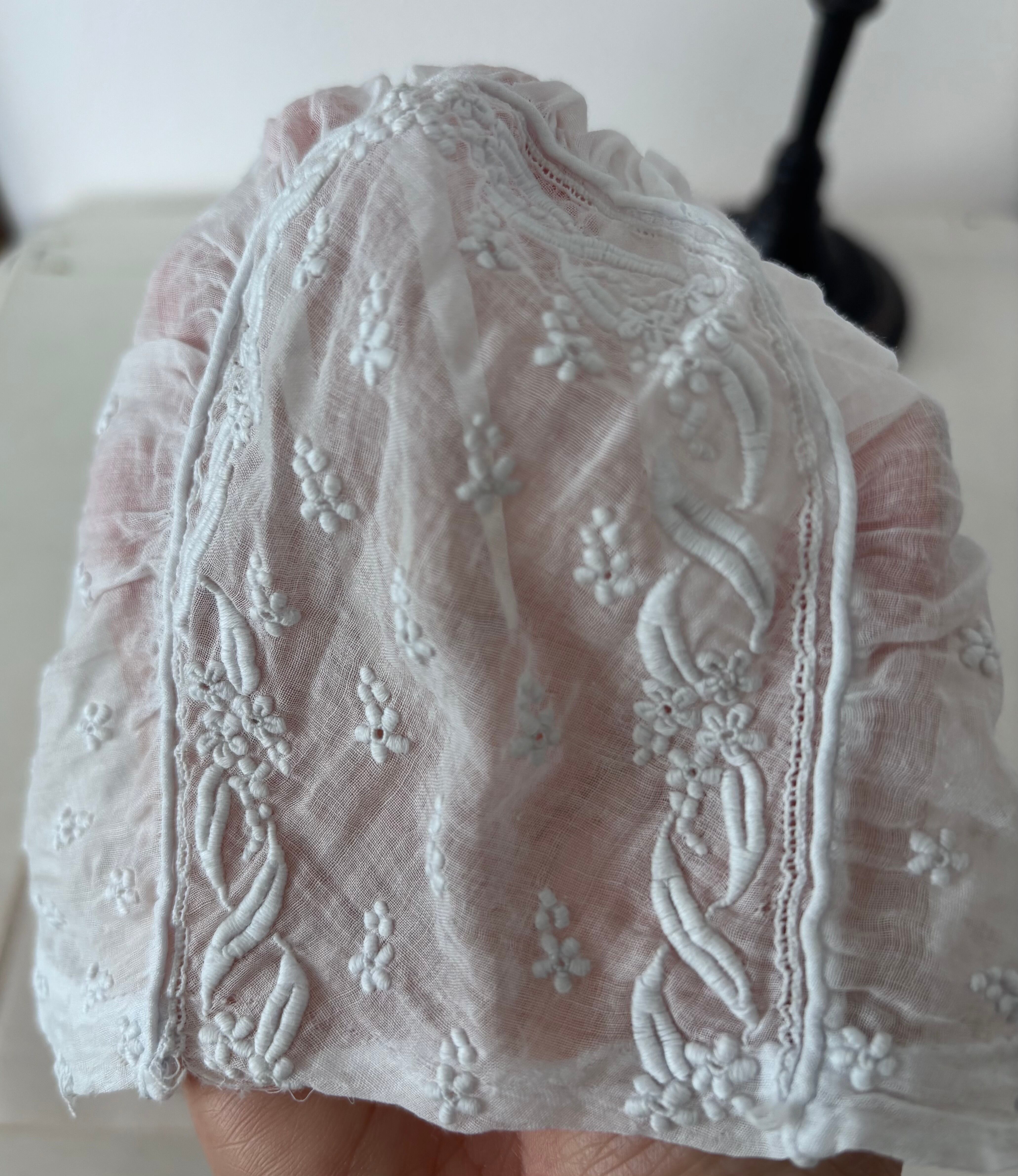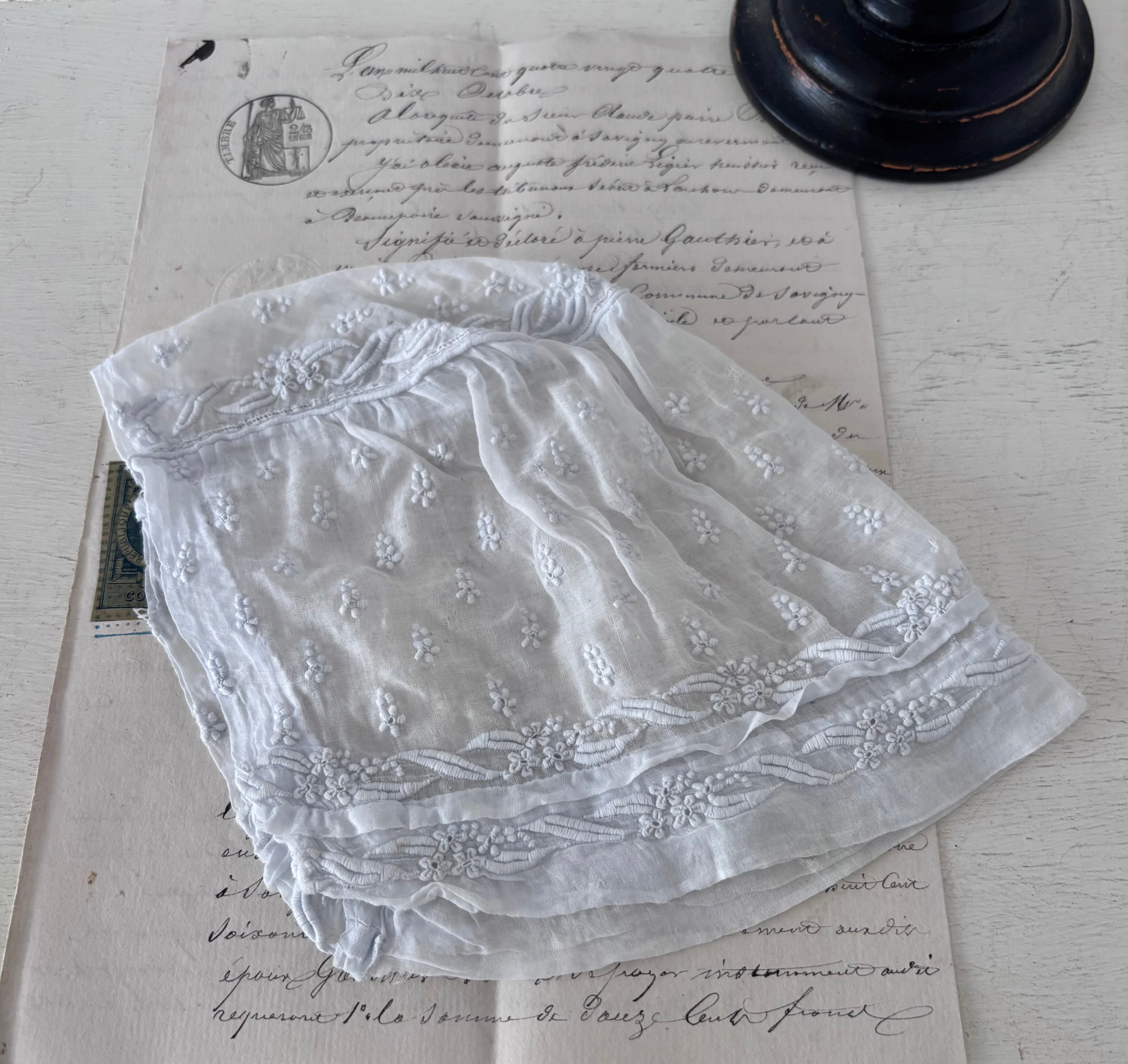 小さな花刺繍と立体的な縁の装飾が美しい、軽やかで透け感のあるコットン素材です。