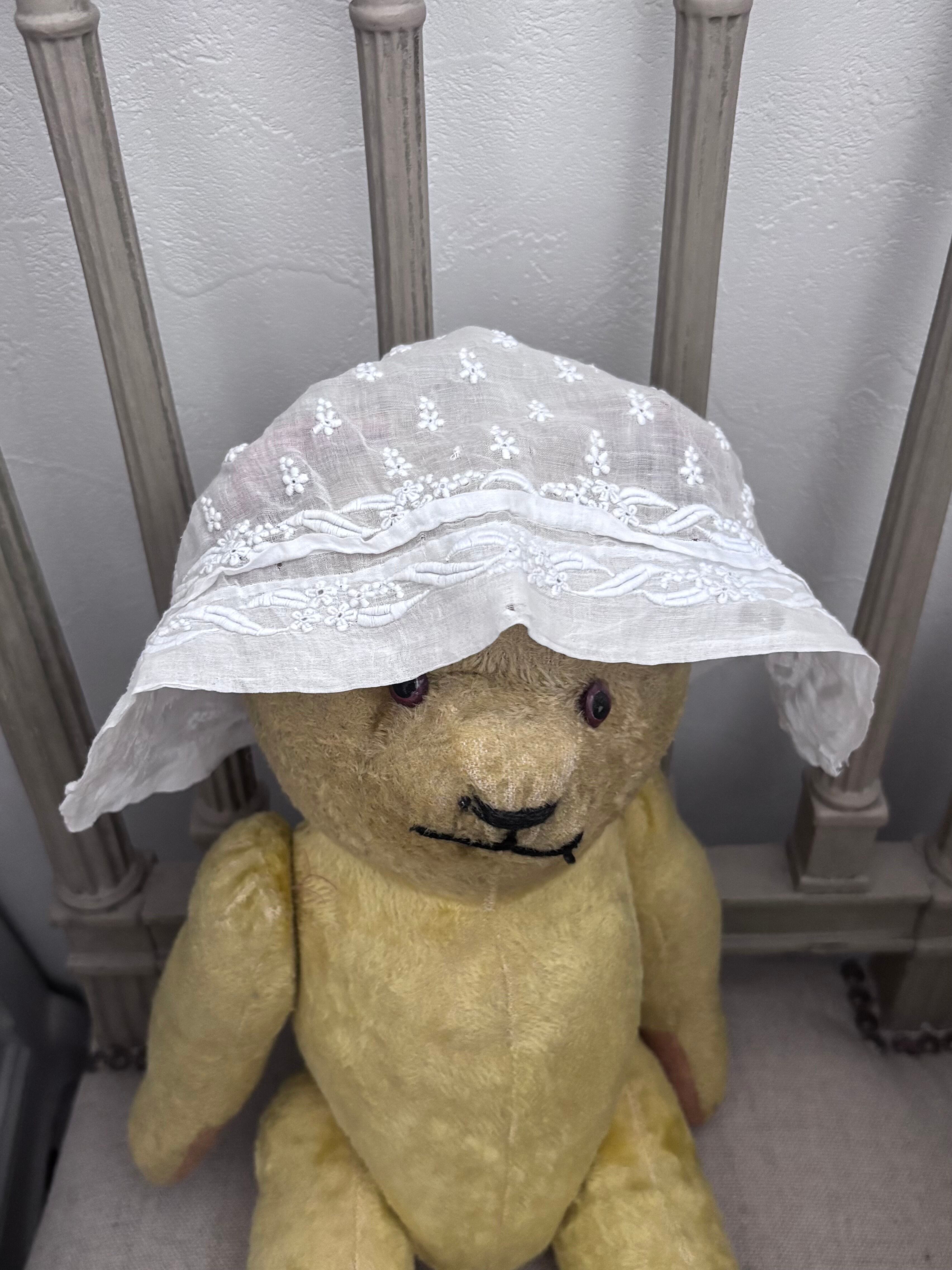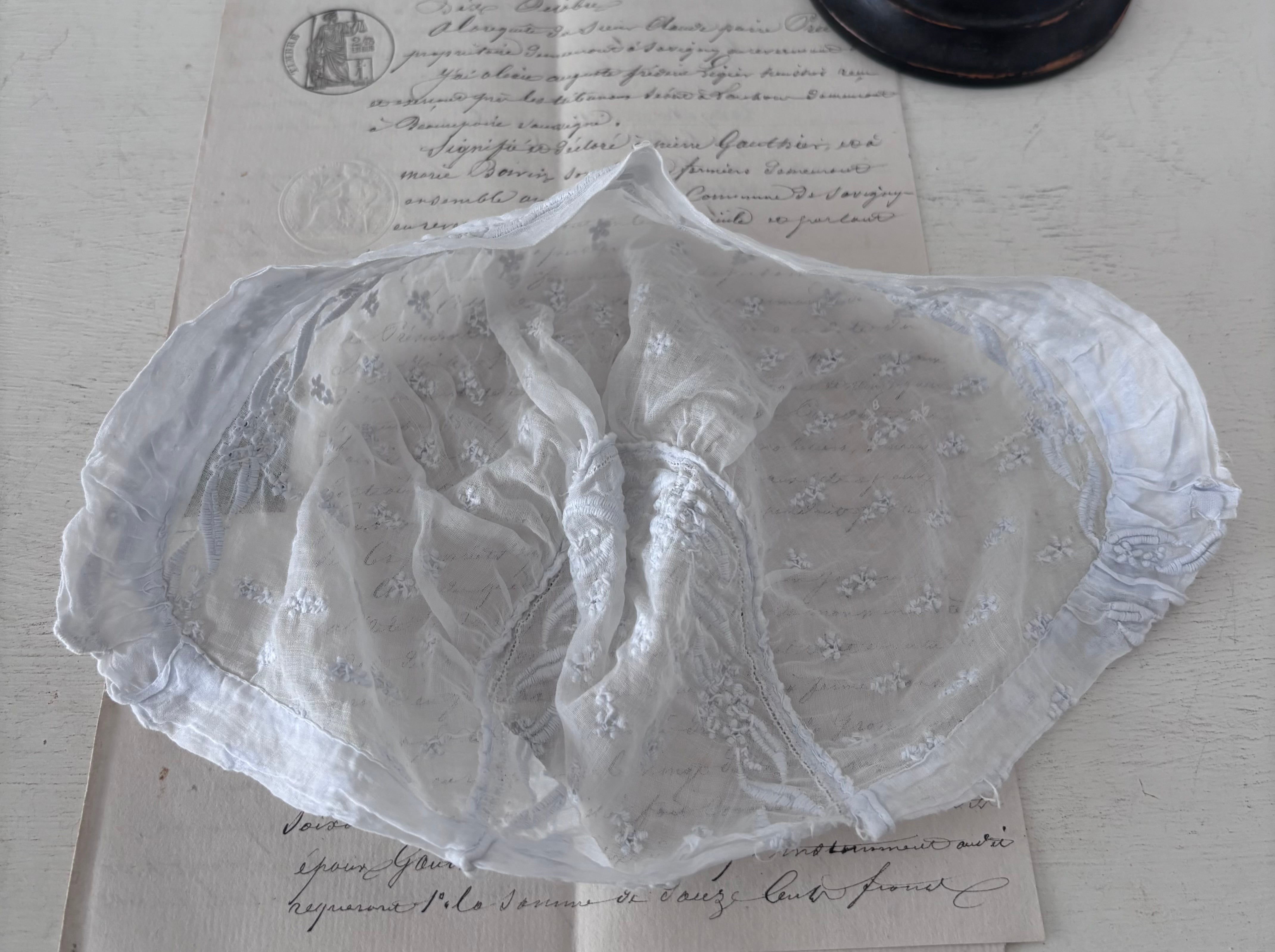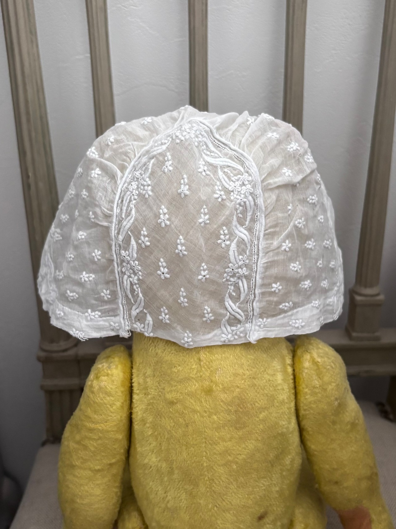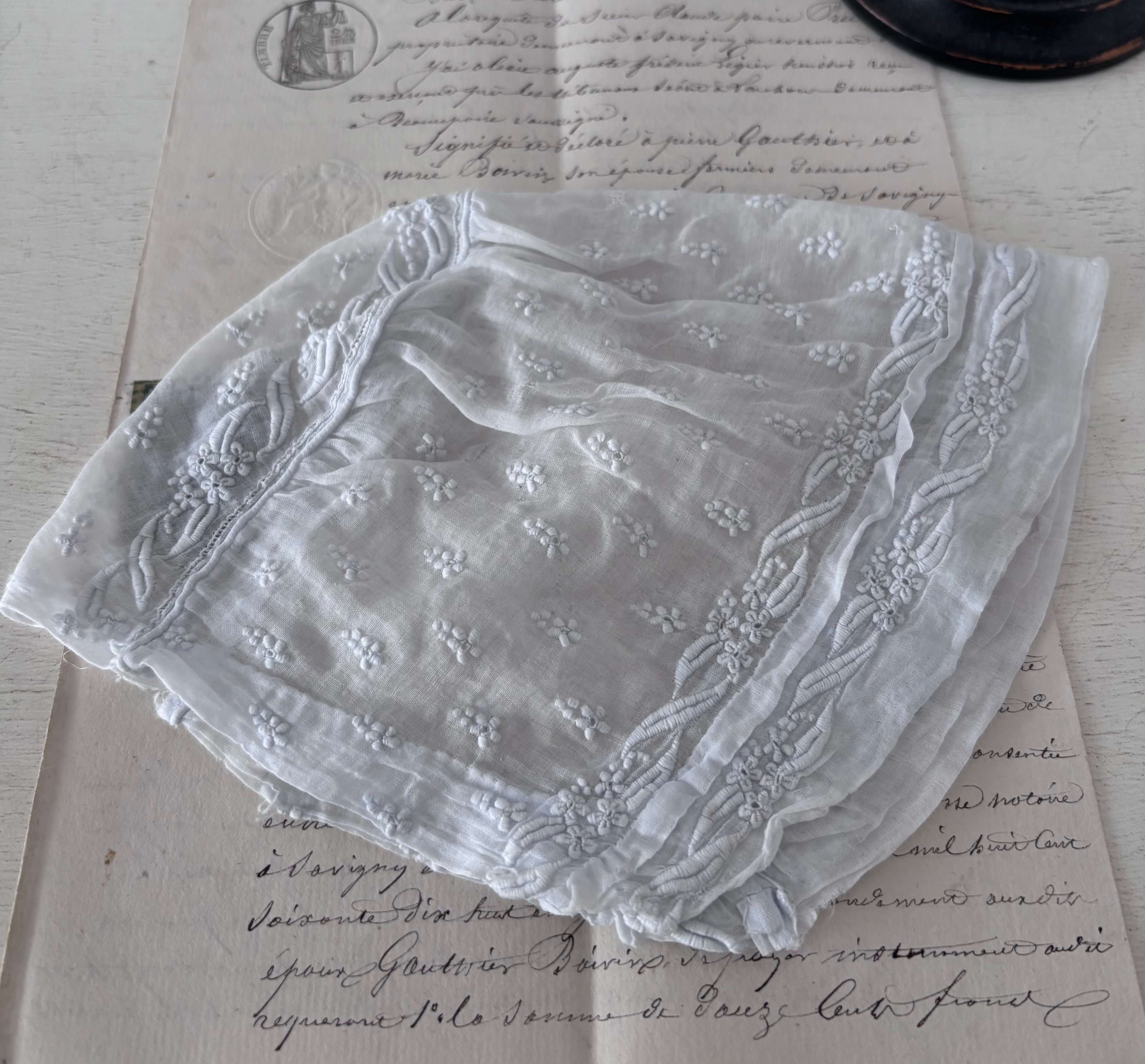 小さな花刺繍と立体的な縁の装飾が美しい、軽やかで透け感のあるコットン素材です。